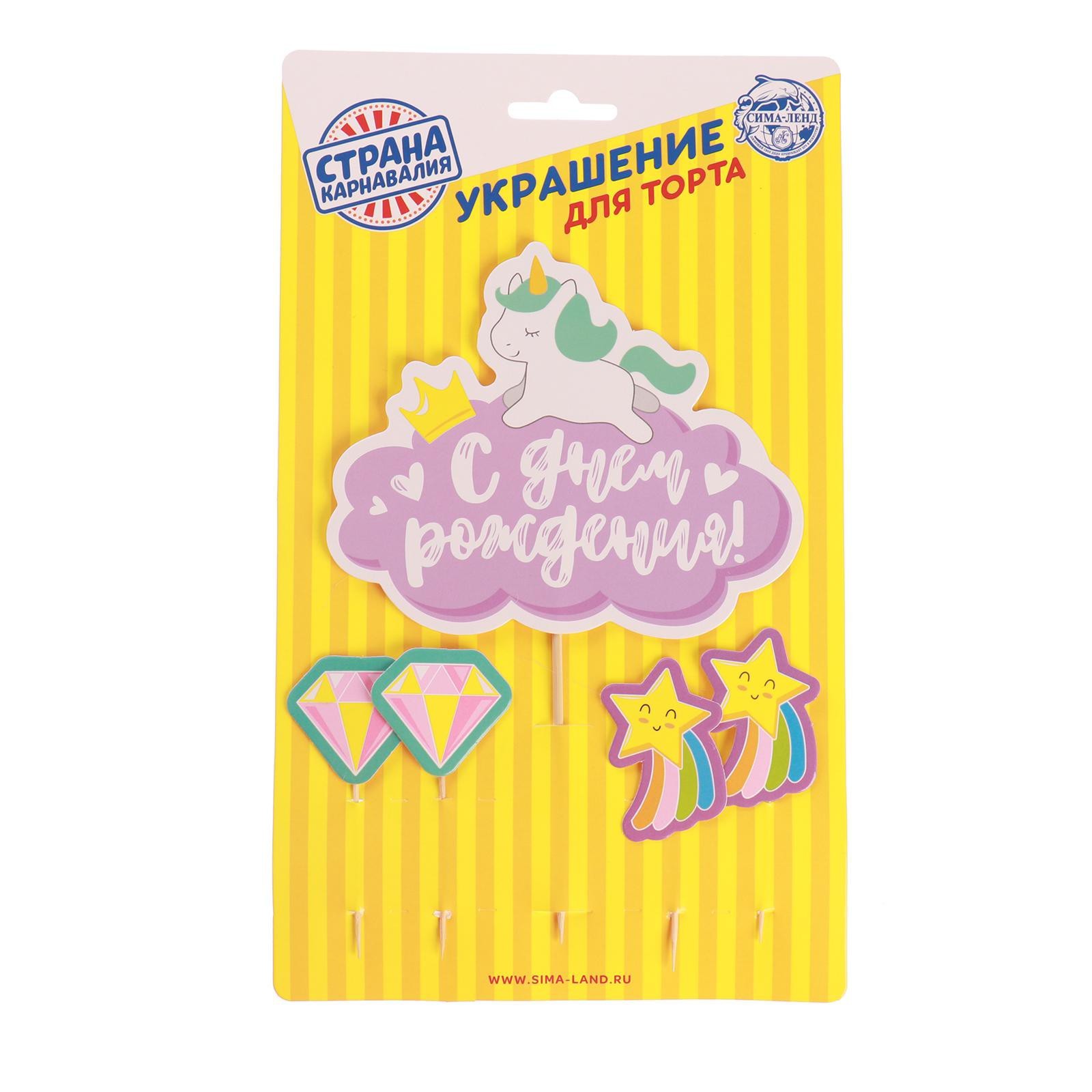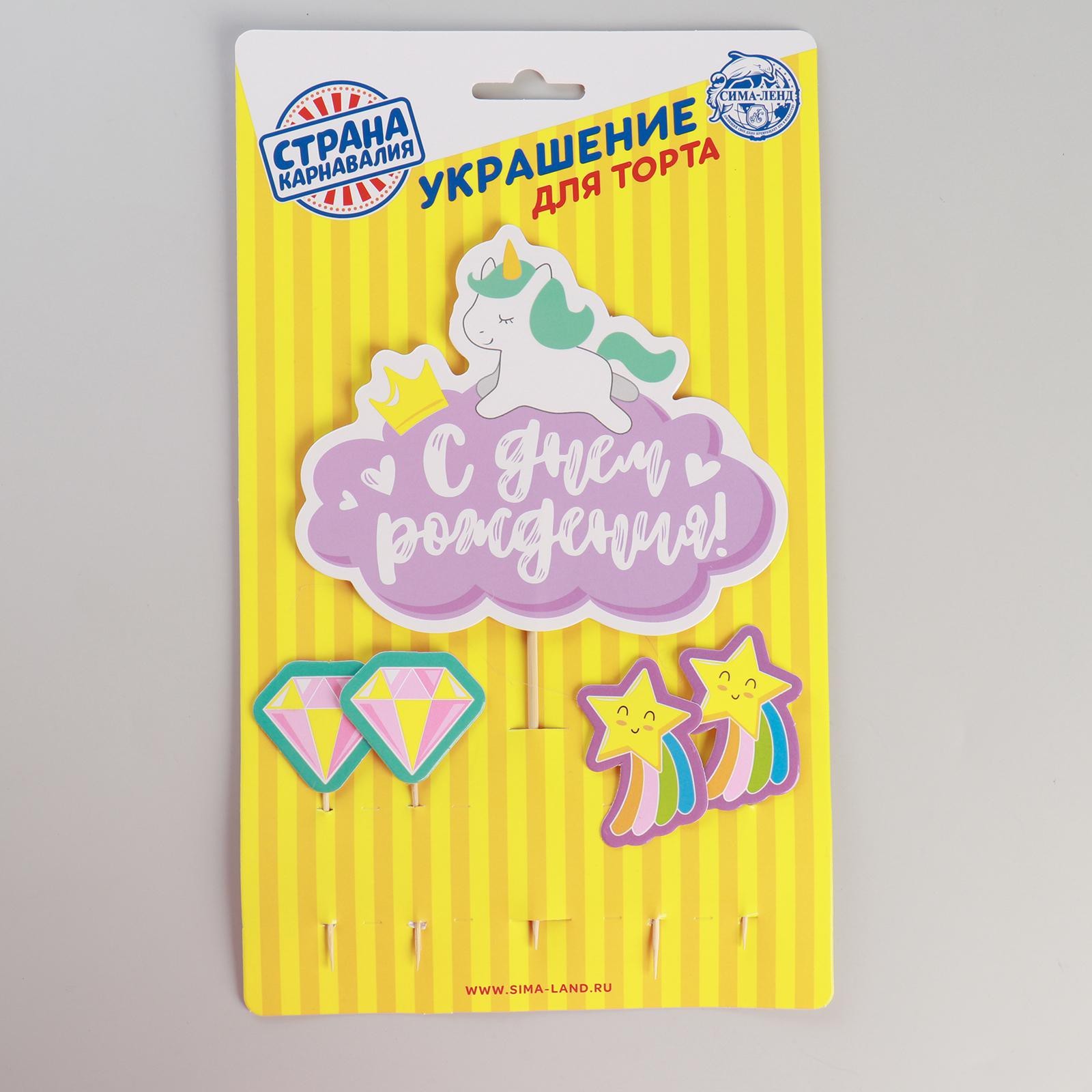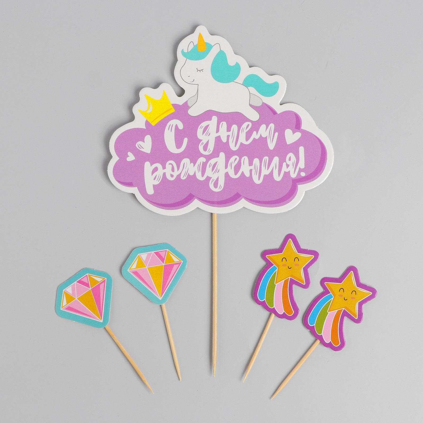 Украшение для торта «с днём рождения», единорог, набор: топпер, шпажки 4 шт.. Подготовка к праздникам — это весьма непростое занятие, которое требует много времени. Подчеркнуть особую атмосферу торжества помогут наши топперы. Просто вставьте их в сладкое угощение или букет цветов, и они добавят яркости вашему мероприятию и сделают его запоминающимся. Цвет: Разноцветный В наборе, шт.: 5 Высота держателя, см: 15 Материал: Картон Материал: Дерево Вид: Топперы Вид: Шпажки, пики Вид: Топпер  развернуть описание ▼