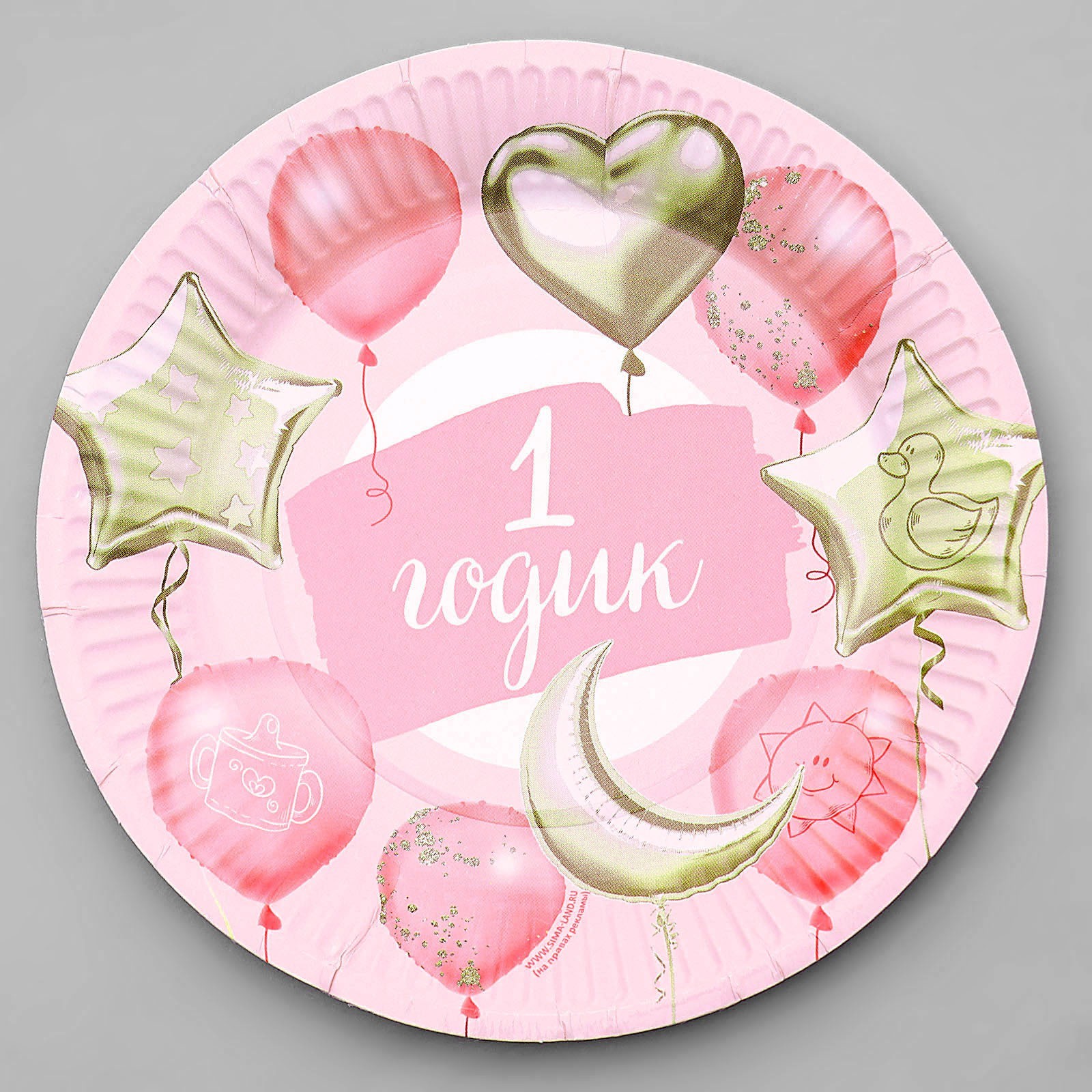 Тарелка одноразовая бумажная "1 годик, звезды, шарики" (18 см) , розовый цвет