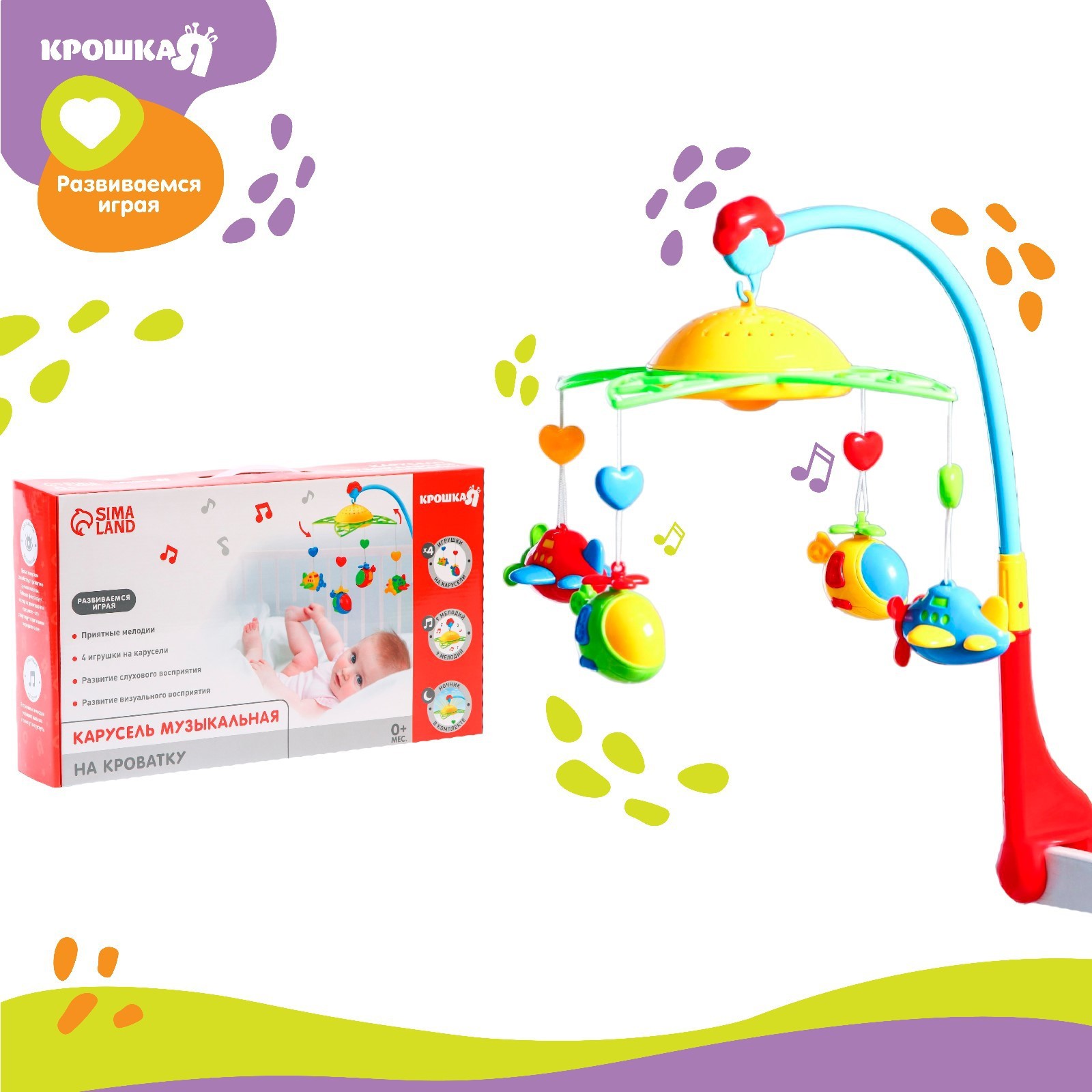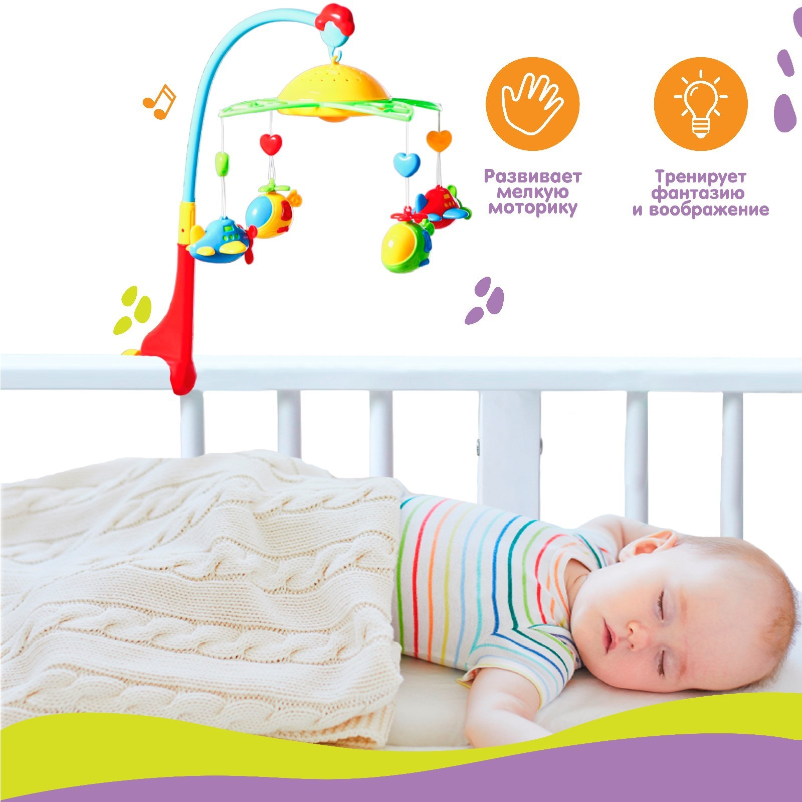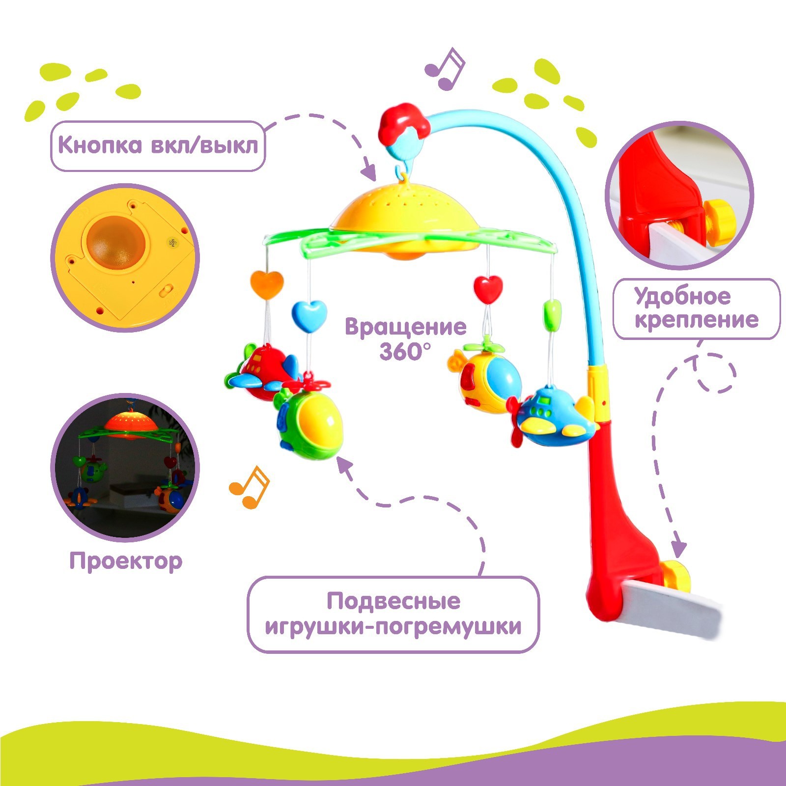 Мобиль музыкальный на кроватку «самолеты, вертолеты», с ночником, крошка я. Нежные мелодии и мягкий свет для самых маленьких! Музыкальный мобиль «Самолёты, вертолёты» создаёт уютную атмосферу в детской. Механизм запускает вращение подвесных игрушек и нежные мелодии, помогая малышу расслабиться перед сном. Встроенный ночник с тёплым светом делает мобиль полезным и днём, и ночью. Особенности 4 яркие игрушки над кроваткой медленно крутятся, привлекая внимание ребёнка. Их можно снять и использовать отдельно для игры.Работает от 2 батареек типа АА — мобиль проигрывает 9 мелодий и плавно вращается. Это успокаивает малыша и развивает зрительное восприятие.Кронштейн надёжно фиксируется на бортике кроватки.Мобиль сделан из прочного пластика без острых углов. Подходит для новорождённых. Игрушки лёгкие, ребёнок не поранится, если случайно дотронется. Мелодии негромкие, не перегружает слух. «Самолёты, вертолёты» — отличный выбор для родителей, которые хотят, чтобы малыш засыпал в спокойной обстановке. Это не просто украшение кроватки, а помощник в первые месяцы жизни ребёнка. Цвет:Разноцветный|Для кого:Для мальчика|Длина, см:57|Возраст:От 0 месяцев|Количество батареек:2|Максимальная ширина крепления кронштейна, см:3.5|Количество подвесных игрушек:5|Количество мелодий:9|Принцип работы:От батареек|Материал:Пластик|Звук:Да|Работает от батареек:Да|Радиоуправление:Нет|Свет:Да|Типоразмер батареек:AA (LR6)|Регулировка громкости:Нет|Пульт управления:Нет|Кронштейн к бортику:Да|Батарейки в комплекте:Нет|Музыка :Да|Для малышей:Да|Вращение без мелодий:Нет|Страна:Китай  развернуть описание ▼