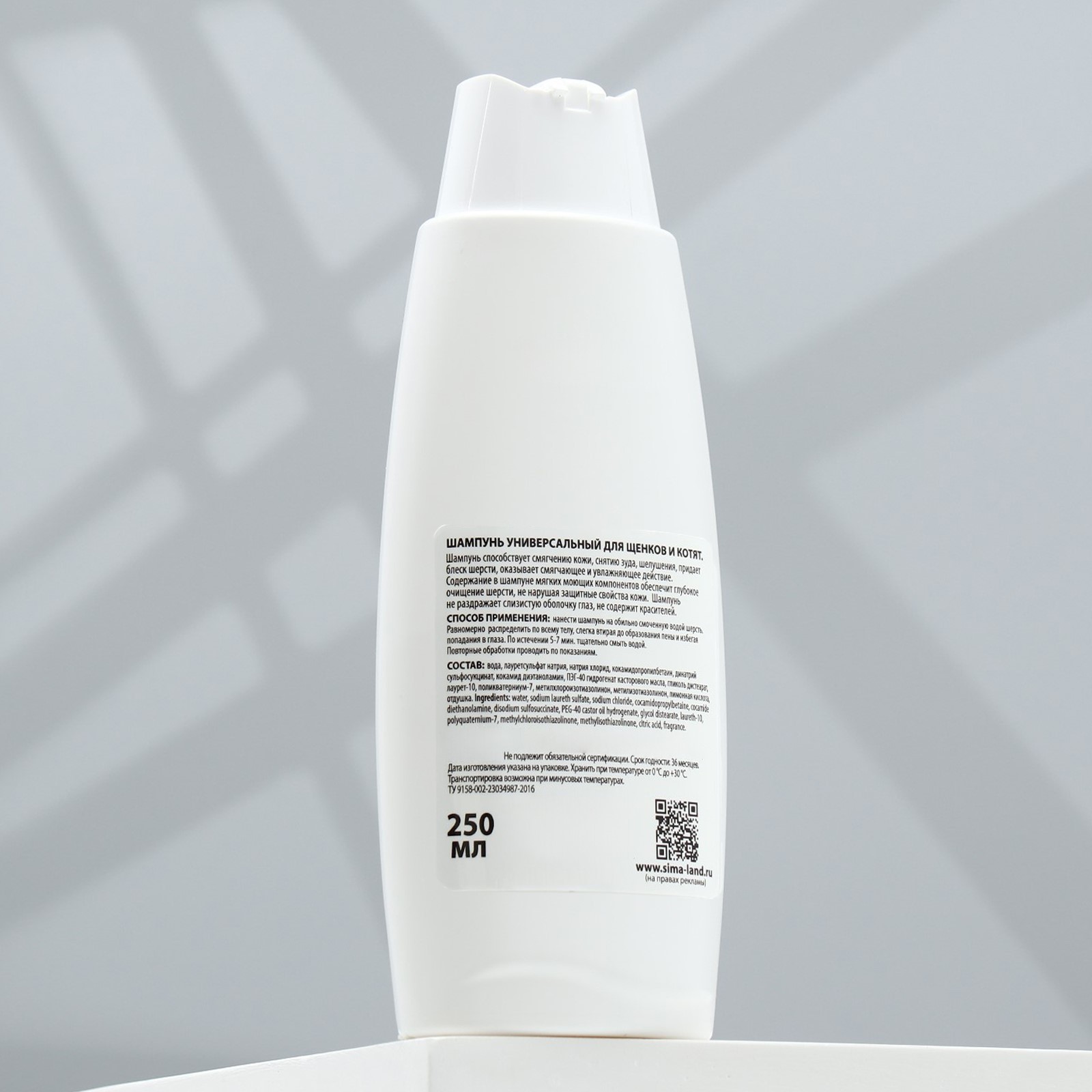 Шампунь «пижон» универсальный, для щенков и котят, 250 мл. Мытье – это одна из регулярных процедур по уходу за собакой. Однако важно правильно выбрать средства, подходящие именно вашему любимцу, чтобы не навредить ему. Помните, что шампуни, предназначенные для людей, не подходят для четвероногих – у них другой уровень Ph. Преимущества: -Не содержат силиконов, парабенов и красителей. -Уcтpaняют cпeцифичecкий зaпax живoтнoгo. -Уменьшают выпадение волос. -Придают шерсти блеск. Применение: -Обильно нанесите на влажную шерсть. -Распределите шампунь массирующими движениями, продвигаясь от головы к хвосту и избегая попадания шампуня в глаза. -Полностью смойте водой. -При необходимости повторить. -Расчешите шерсть, чтобы она не спуталась, и высушите полотенцем. СОСТАВ: Вода, лауретсульфат натрия, натрия хлорид, Кокамидопропилбетаин, динатрий сульфосукцинат, кокамид диэтаноламин, ПЭГ-40 гидрогенат касторового масла, гликоль дистеарат, лаурет-10, поликватерниум-7, метилхлороизотиазолинон, метилизотиазолинон, лимонная кислота, отдушка. Объём, мл:250|Возраст животного:Котёнок (до 12 месяцев)|Возраст животного:Щенок (до 12 месяцев)|Аромат:Без аромата|Назначение:Универсальный|Тип:Основной|Темпер. ограничение НЕ НИЖЕ :+1|Темпер. ограничение НЕ ВЫШЕ :+30|Страна:Россия  развернуть описание ▼