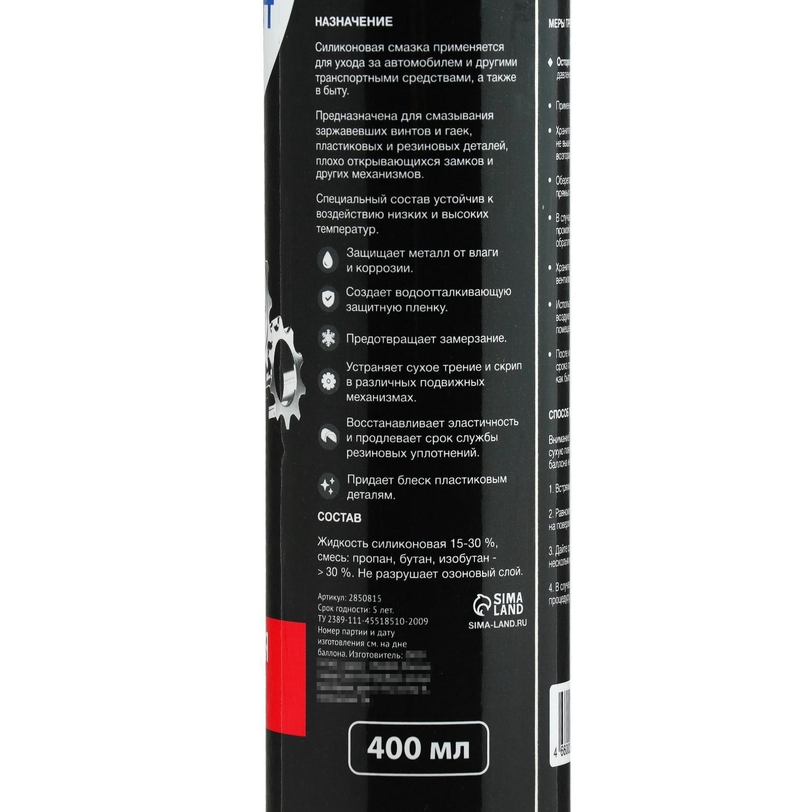 Силиконовая смазка grand caratt, 400 мл. Силиконовая смазка — это универсальная водонепроницаемая смазка, созданная на основе силикона. Широко применяется среди автолюбителей, к примеру, для обработки резинок проёмов дверей, замков, ограничителей дверей, и прочих подвижных соединений против замерзания. Так же используется в быту для обработки уплотнителей пластиковых окон, петель межкомнатных дверей, замков.Объём, л:0.4|Вес, г/Объём, мл:400|Тип ёмкости:Аэрозоль|Темпер. ограничение НЕ НИЖЕ :-20|Темпер. ограничение НЕ ВЫШЕ :+50|Страна:Россия  развернуть описание ▼