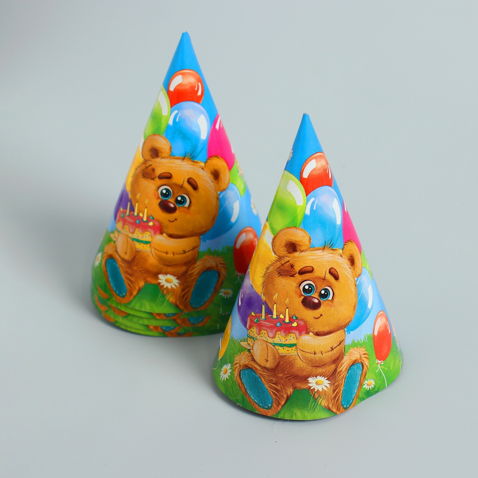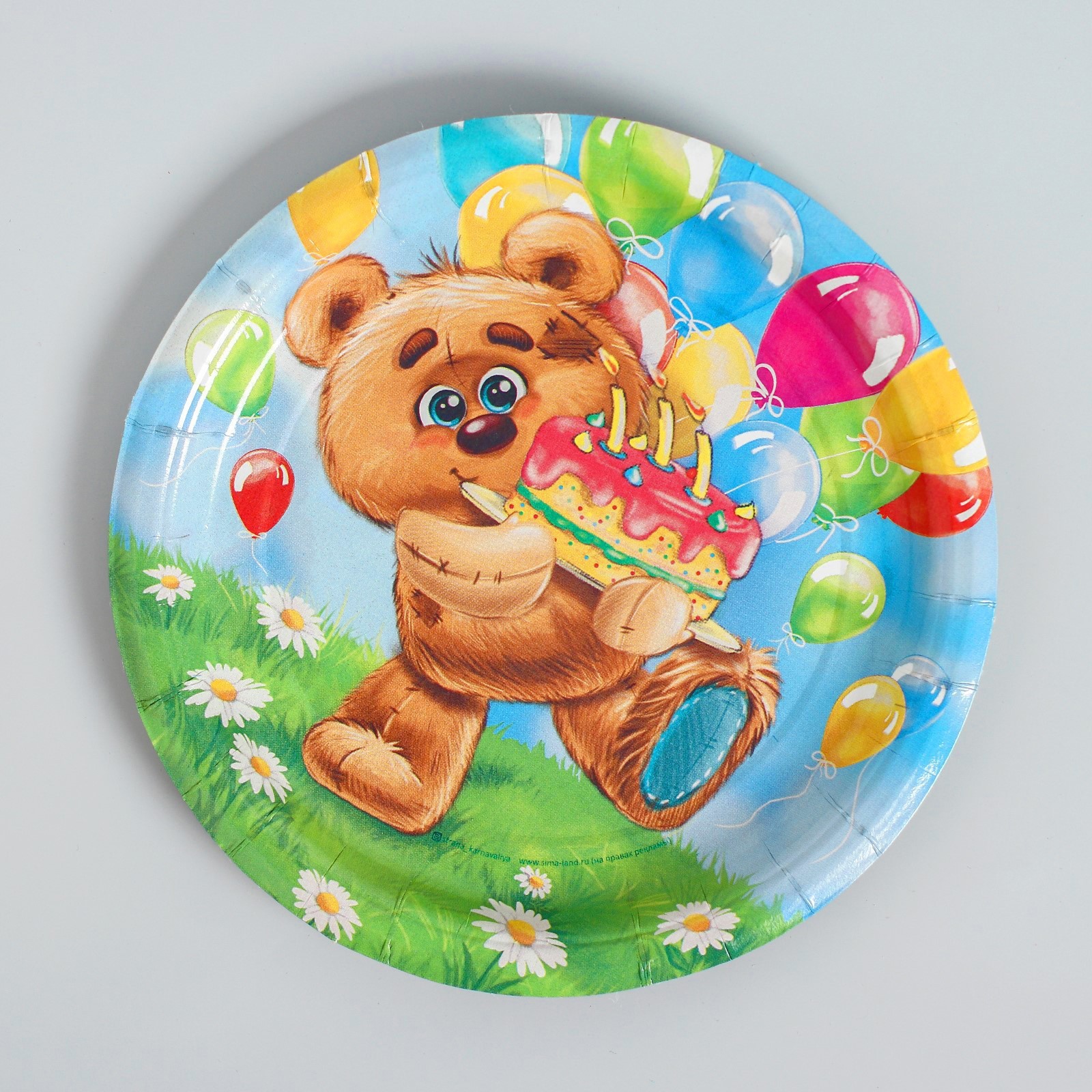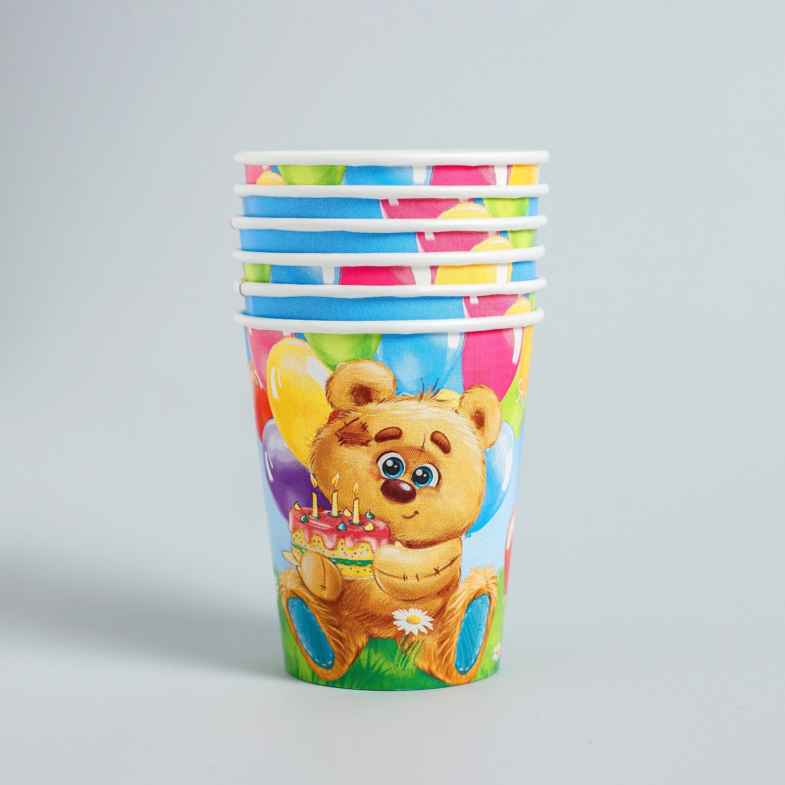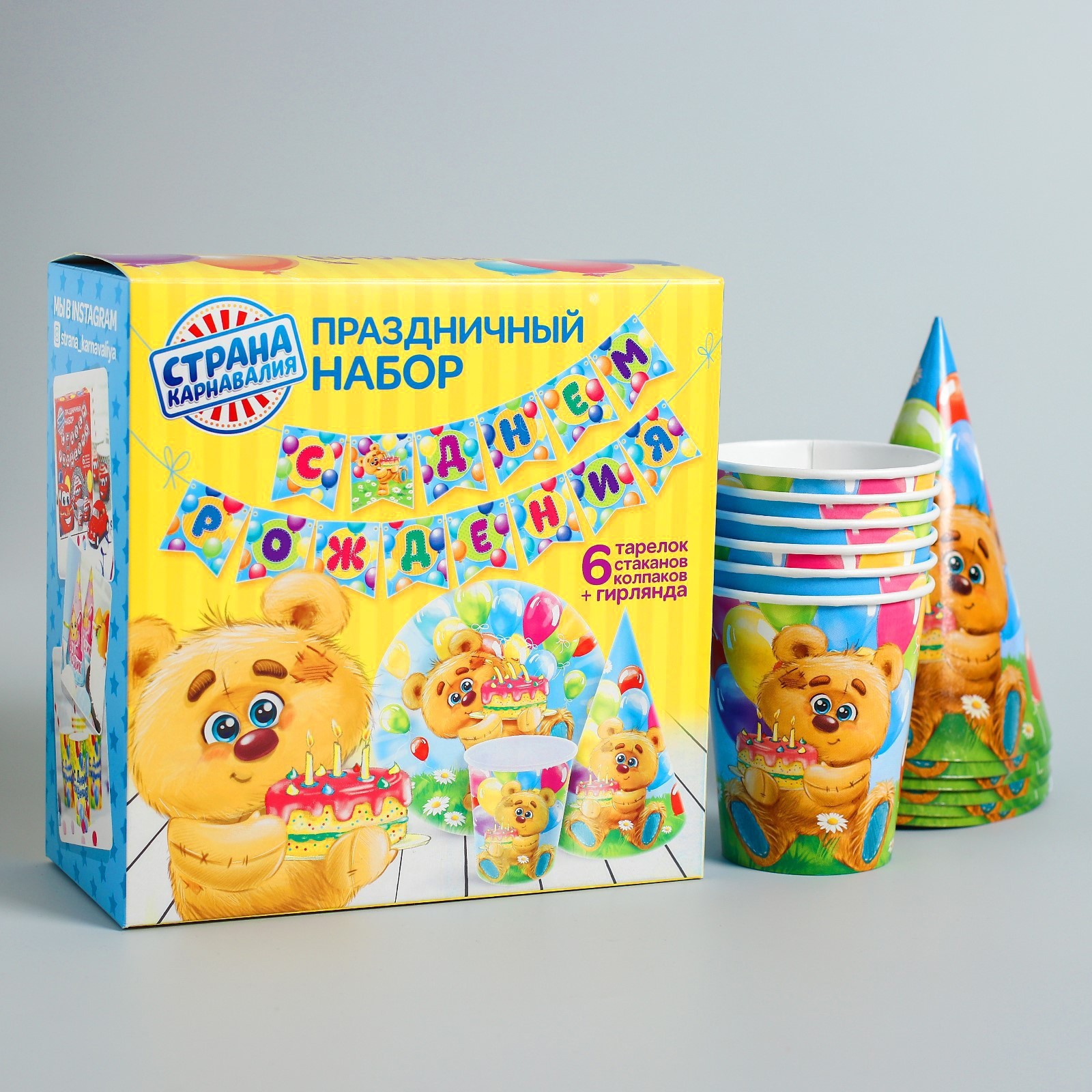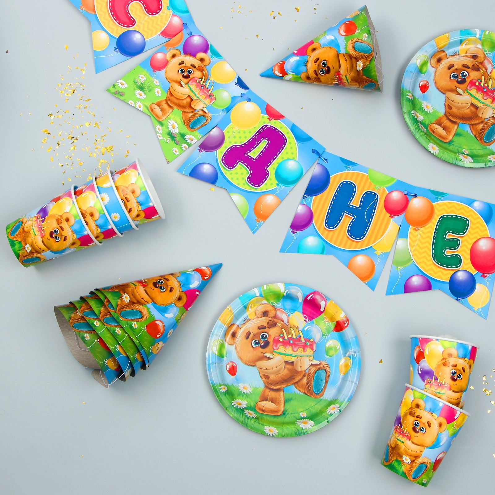Набор бумажной посуды одноразовый с днём рождения», мишка с шарами: 6 тарелок, 6 стаканов, 6 колпаков, 1 гирлянда