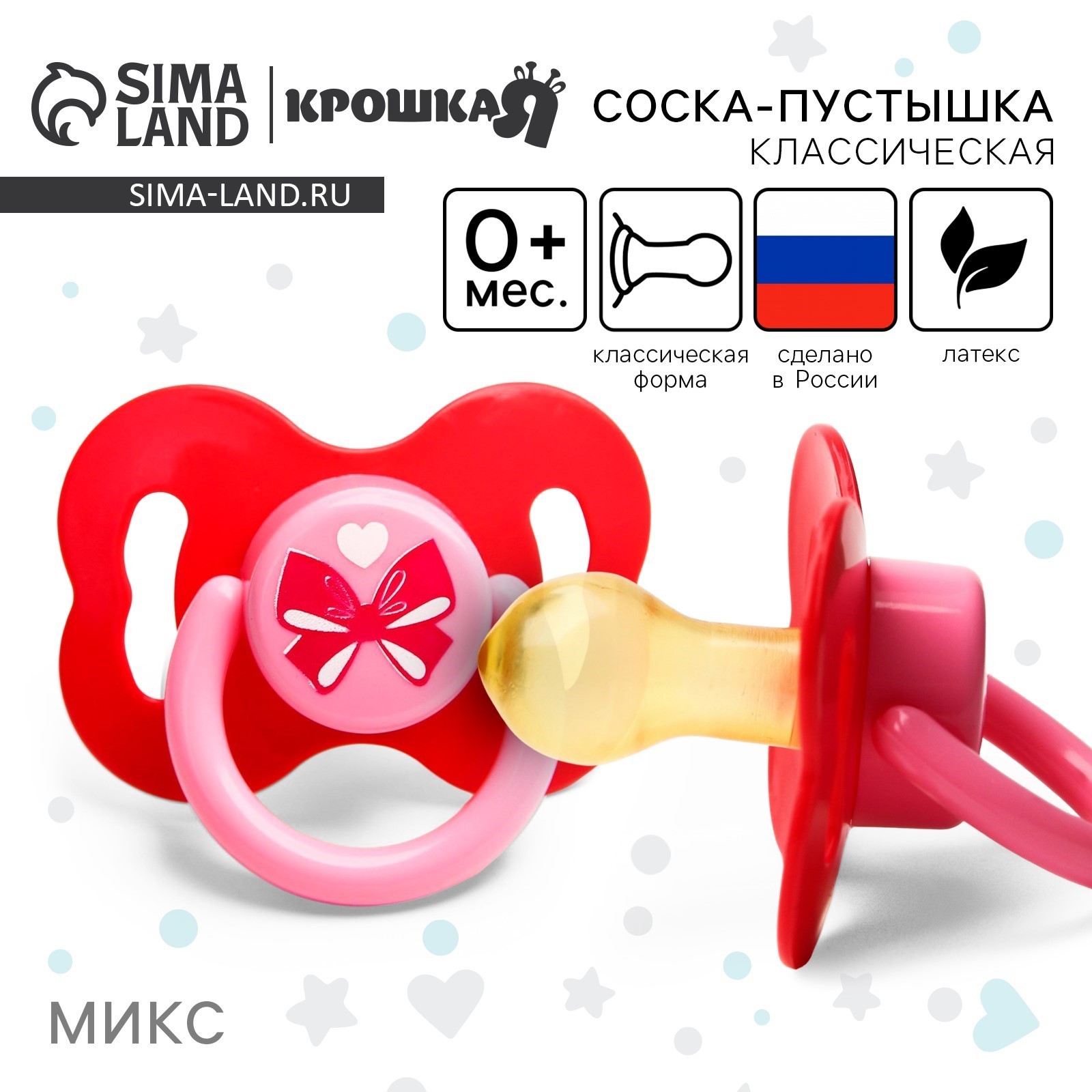 Соска - пустышка латексная классическая «малышка», от 0 мес., цвет розовый. Набор:Нет|Цвет:МИКС|Для кого:Для девочки|Возраст:От 0 месяцев|Длина баллона, см:2.8|Форма соски:Классическая|Возраст:Детский|Материал:Латекс|Материал:Полипропилен|Материал соски:Латекс|С колпачком:Нет|С держателем:Нет|Особенность пустышки:Без особенностей|Для детей до 3 лет:Да|Форма нагубника:Бабочка|Страна:Россия  развернуть описание ▼