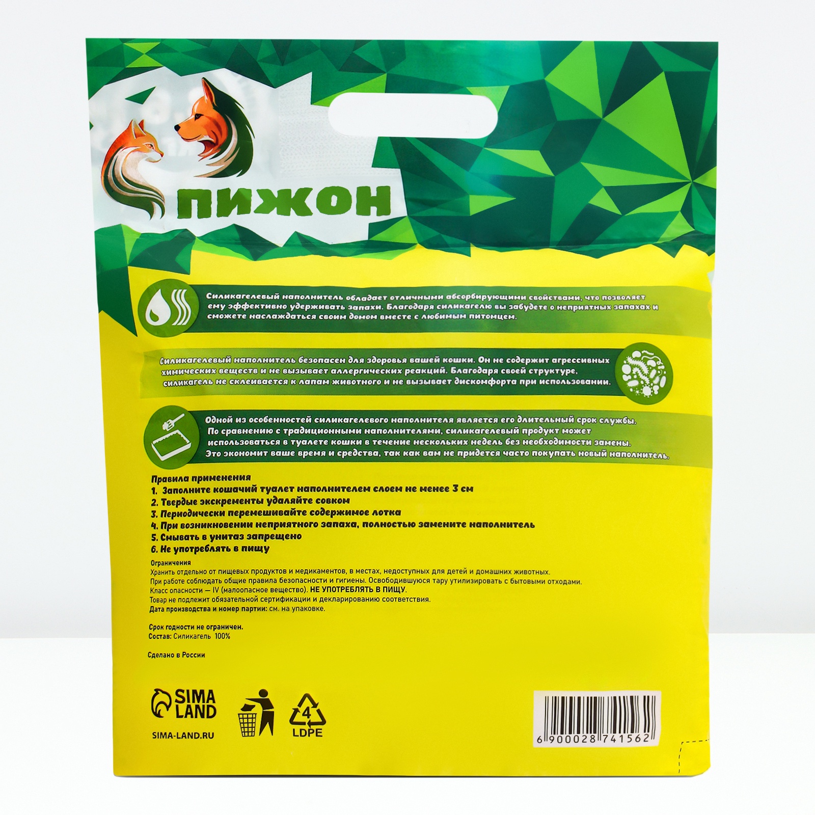 Безопасность для здоровья. Силикагелевый наполнитель изготовлен из природных материалов, что делает его безопасным для здоровья вашего питомца. Он не содержит пыли и химических добавок, что особенно важно для кошек с аллергиями или чувствительными дыхательными путями.