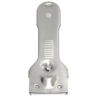 Скребок для стеклокерамики «эконом». Для чистки стеклокерамики следует использовать специальные приспособления. Скребки для стеклокерамических плит помогут бережно очистить пригоревшие остатки пищи и удалить даже застарелую грязь. Скребок поможет дольше сохранять внешний вид поверхности и избежать появление царапин. Сменное лезвие заменяется по мере необходимости, оно снабжено специальным предохранителем. Рабочая часть фиксируется для удобства использования и безопасности хранения. Внимание! Берегите изделие от детей. Соблюдайте осторожность при мытье и смене лезвий. Изготовлено из коррозионностойкой (нержавеющей) стали. Размеры: скребок 13. 5х4. 4 см, лезвие 4. 3х2. 2 см. Вес, г/Объём, мл: 57 Материал ручки: Металл Материал рабочей части: Металл  развернуть описание ▼