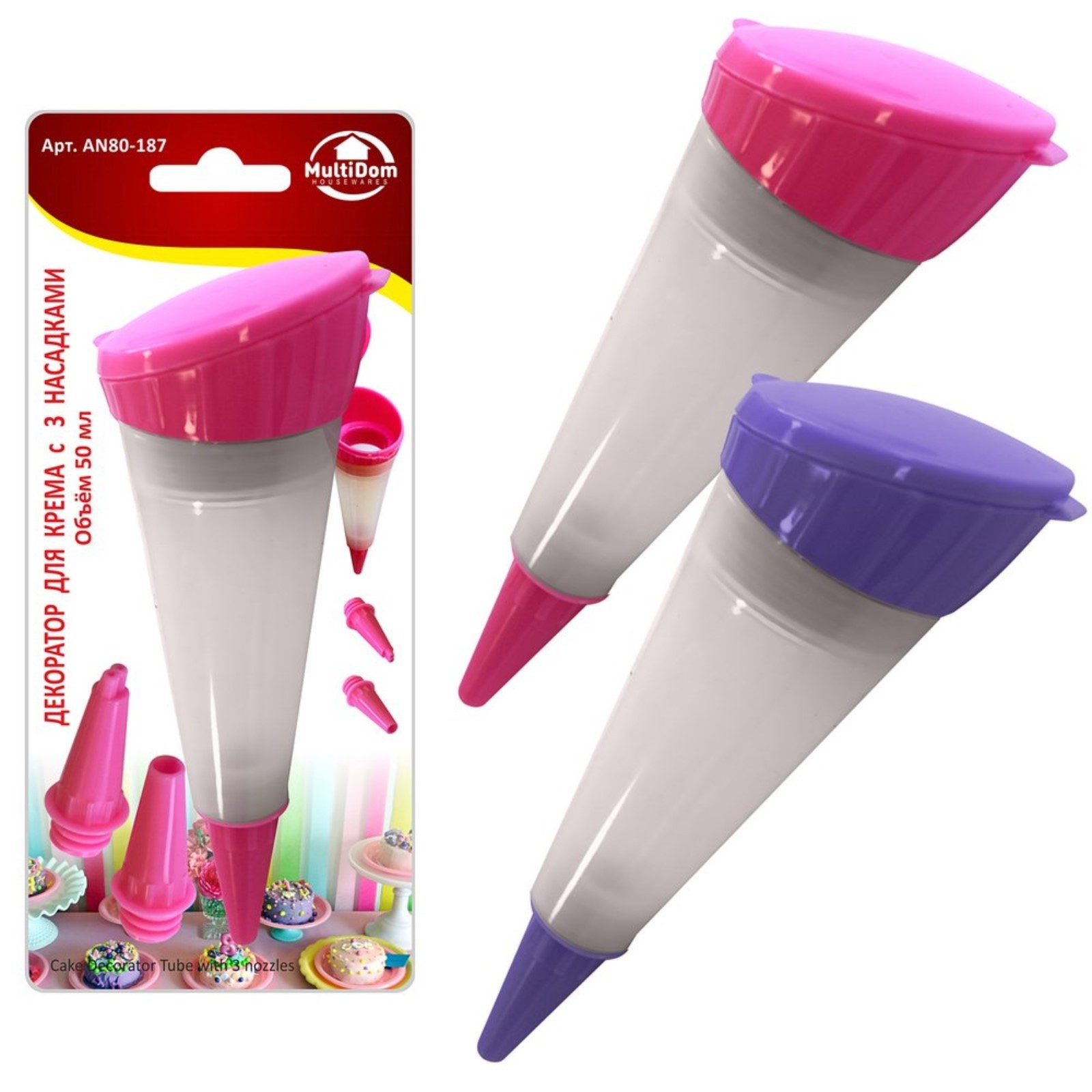 Декоратор для крема 3 насадки цвет микс. Домашняя выпечка и кондитерские изделия можно оформить также красиво, как в пекарне! Используя декоратор для крема с разными насадками, вы сможете создать неповторимые кремовые рисунки. В комплект входит емкость и 3 насадки с разными прорезями, которые позволяют получить желаемую толщину крема. Емкость предназначена для многоразового использования, после применения промывается губкой с жидкими средствами. Не рекомендуется использование абразивных материалов для мытья. В процессе использования может исчезнуть яркость цвета, но это не влияет на качество изделия. Изготовлено из силикона, насадки из пластмассы (полипропилен). Объем 50 мл. Количество насадок: 3 Материал: Полипропилен Материал: Силикон  развернуть описание ▼