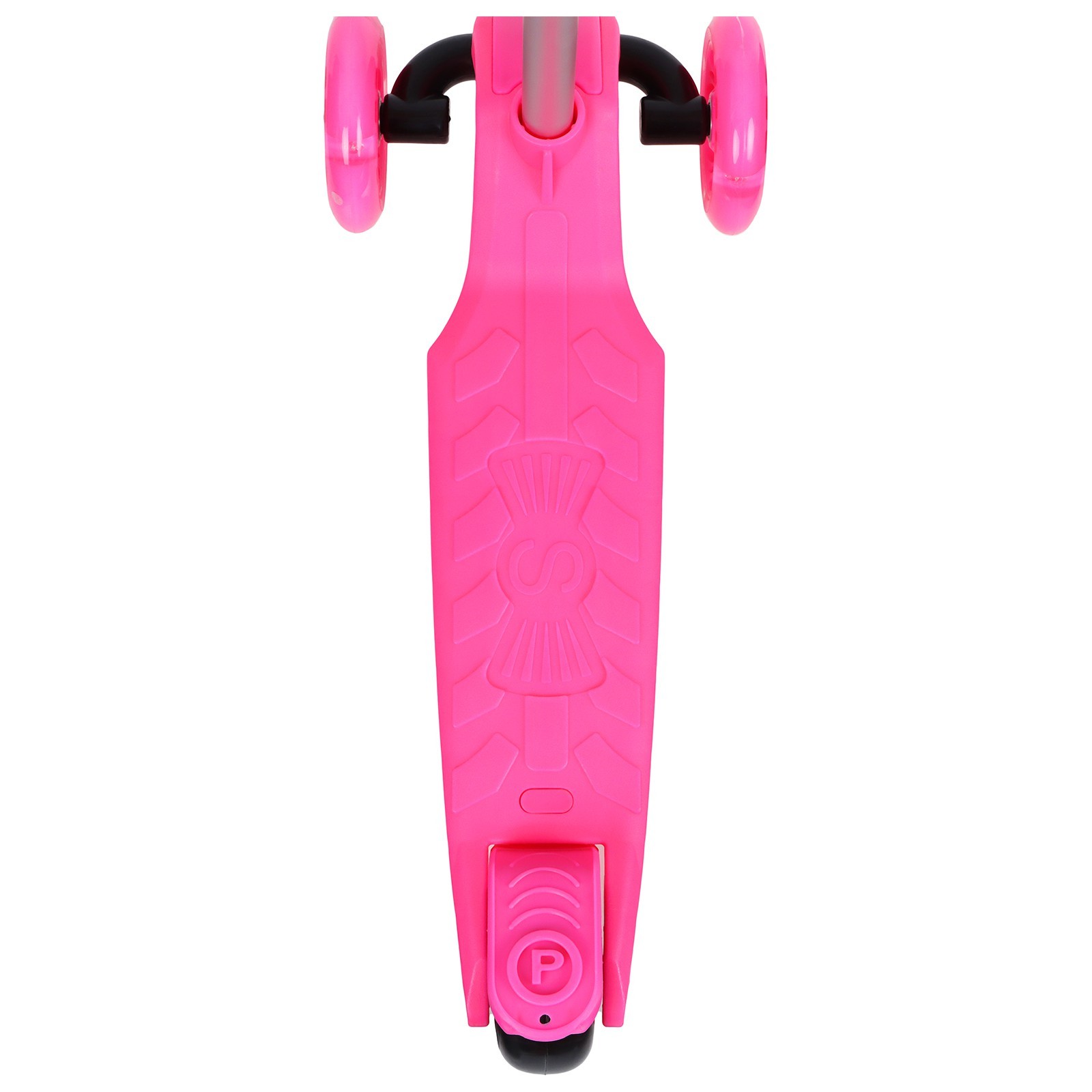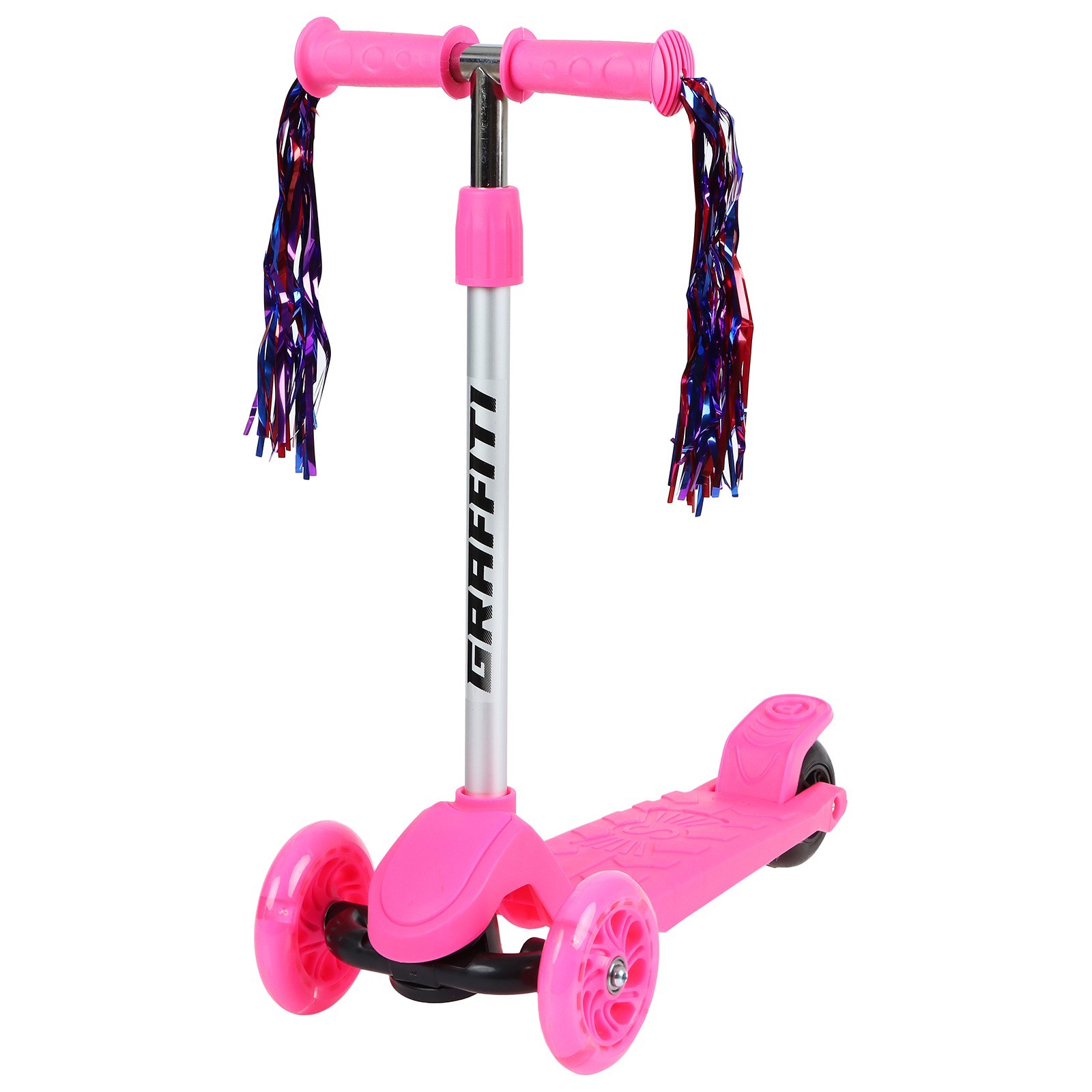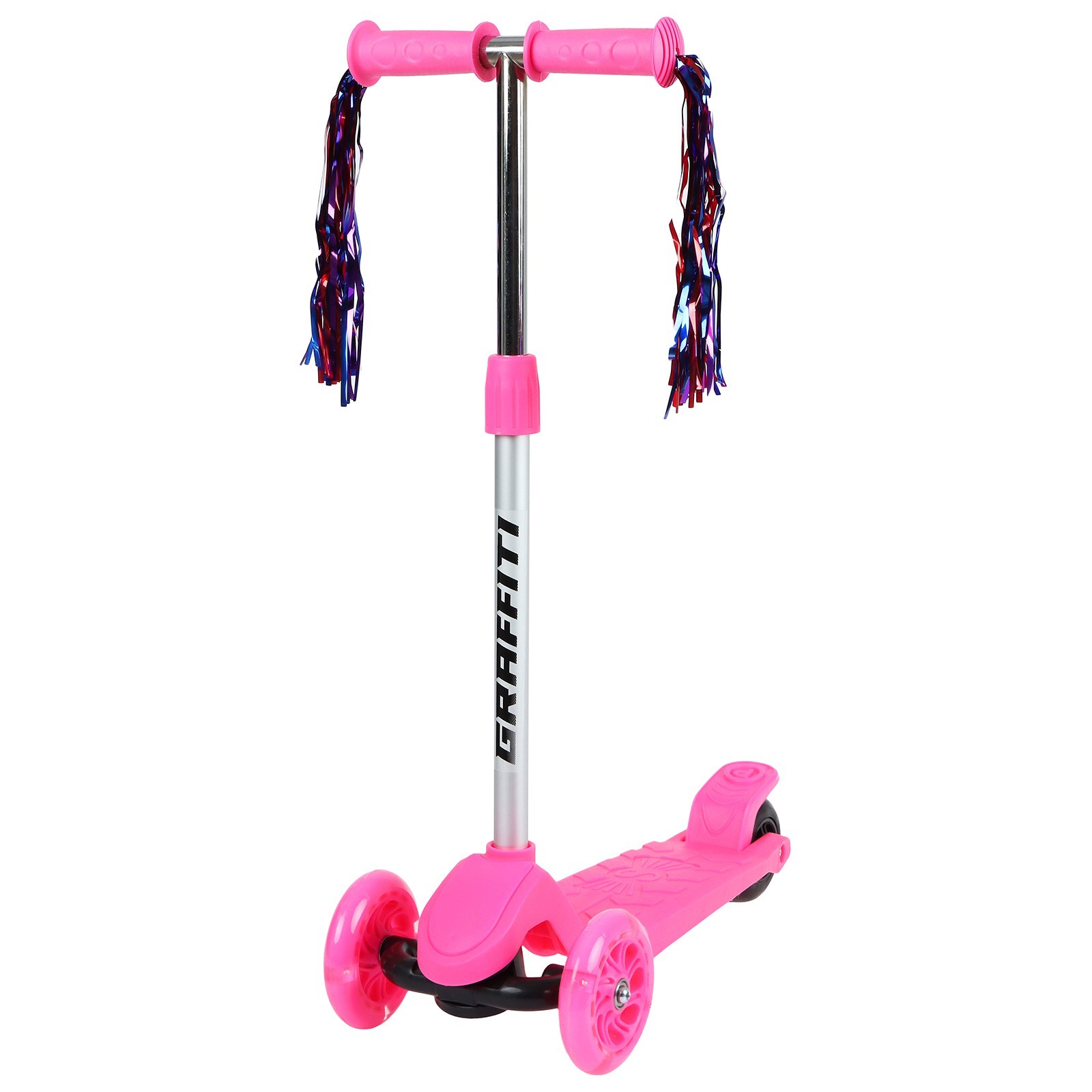 Самокат graffiti, стальной, колёса световые pu 120/100 мм, цвет розовый. Самокат предназначен для детей от 3 лет. Подходит для обучения ребёнка навыкам балансировки и равновесия. Колёса изготовлены из полиуретана, что повышает стойкость к коррозии и износу, имеют высокие показатели грузоподъёмности и их невозможно проколоть. Дека изготовлена из пластика — это повышает уровень долговечности и устойчивости к влаге. Характеристики Количество колёс: 3Высота руля: 60-74 смМаксимальная нагрузка: 40 кгРазмер платформы: 28 х 12 смШирина руля: 24, 5 смДиаметр колеса: 100, 120 ммНожной тормоз Цвет: Розовый Возраст: От 3 лет Количество колёс: 3 Maксимальная нагрузка, кг: 40 Длина деки, см: 60 Диаметр колеса, мм: 100 Диаметр колеса, мм: 120 Материал колёс: Полиуретановые Серия: Без серии Максимально допустимый вес, кг: 40 Сиденье: Нет Высота руля, см: 60 - 74 Мотор: Нет Инерционный: Нет Ширина руля, см: 24.5 Особенности самоката: Регулировка высоты руля Особенности самоката: Светящиеся колёса Особенности самоката: Ножной тормоз Размер платформы: 28 х 12 Материал деки: Пластик Вид самоката: Городской Вид самоката: Кикборд Материал руля: Сталь  развернуть описание ▼