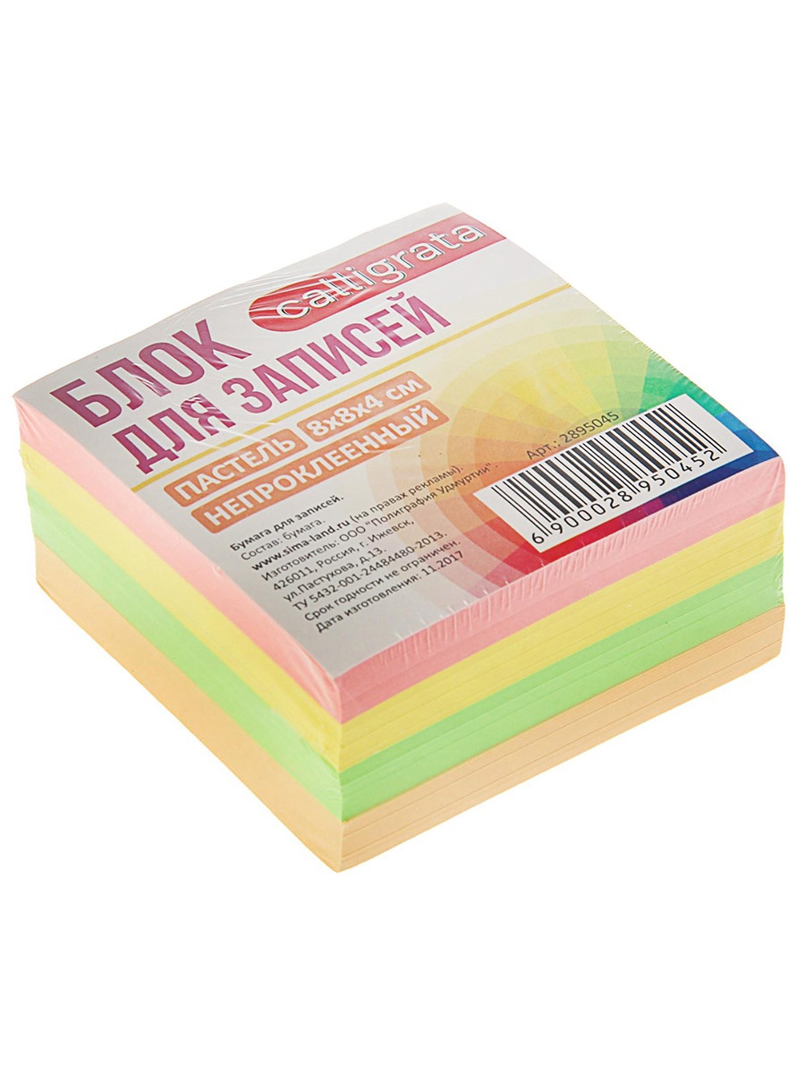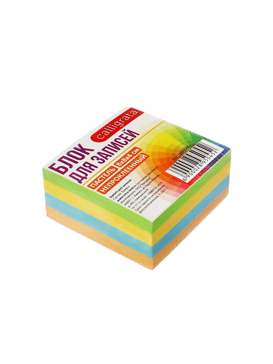 Блок бумаги для записей Calligrata, 8 8 4 см, 80 г/м , непроклеенный, цветной, пастель