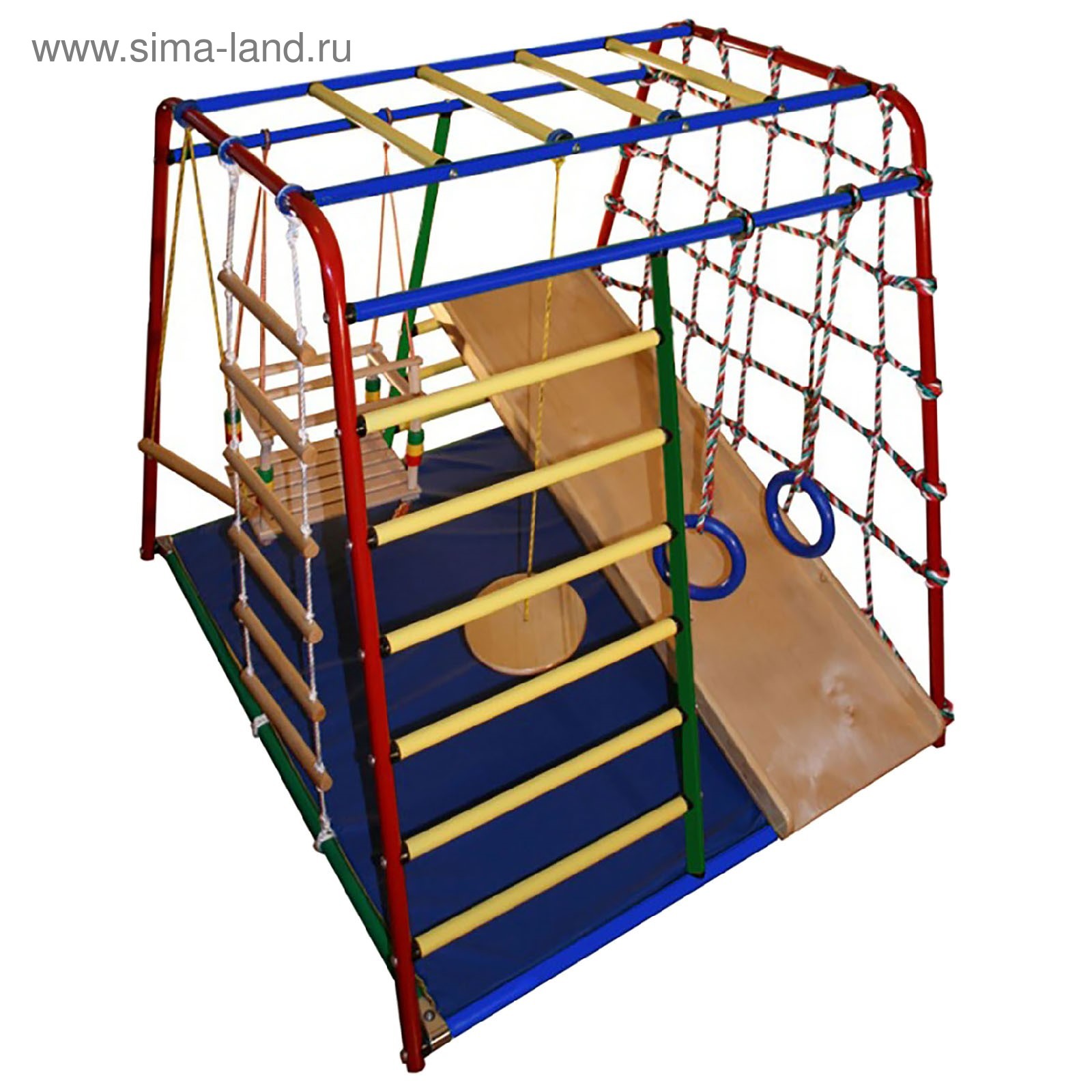 Металлический каркасГимнастический мат складной: 0, 95 х 1, 25 х 0, 04 м. Детские верёвочные качелиКольца гимнастическиеВерёвочная лестница 6 ступенейТрапецияДиск-тарзанкаСетка - паутинкаГорка фанерная