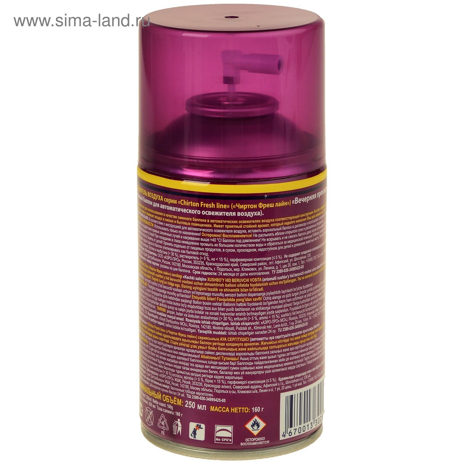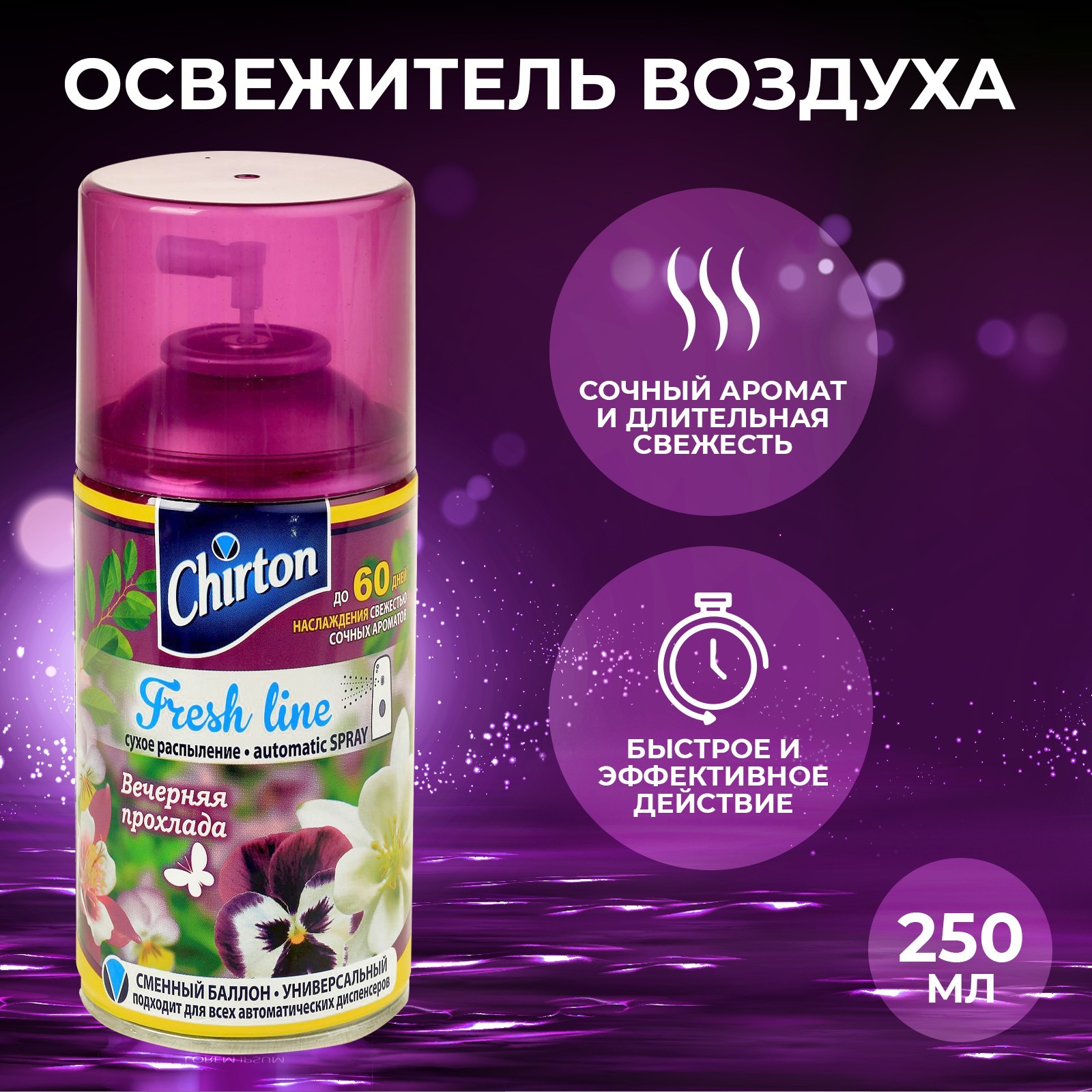 Освежитель воздуха chirton фреш лайн "вечерняя прохлада", сменный баллон, 250 мл. Освежитель воздуха предназначен для использования в качестве сменного баллона в автоматических и бытовых помещениях. Имеет приятный стойкий аромат, который надолго наполнит Ваш дом свежестью и уютом. Способ применения: в соответствии с инструкцией для автоматического освежителя воздуха, вставить аэрозольный баллон в диспенсер и использовать освежитель по назначению. Меры предосторожности: осторожно! Воспламеняющийся аэрозоль! Беречь от солнечных лучей, избегать нагревания, искр и огня! Не распылять вблизи открытого огня! Не курить! Беречь от солнечных лучей, избегать нагревания свыше + 40 С. Не нарушать целостность упаковки и не сжигать, даже после использования! Избегать попадания средства в глаза, если средство попало в глаза немедленно промыть большим количеством воды. Избегать попадания на кожу. Хранить в сухом месте, отдельно от пищевых продуктов, вне доступа детей и домашних животных. Состав: смесь пропана, бутана, изобутана 30%, растворитель 5%, парфюмерная композиция 5%. parts count: 0 Объём, мл: 250 Аромат: Ассорти Форма выпуска: Спрей Принцип работы: Автоматический Вид распыления: Сухое : 0 Тип: Сменный баллон  развернуть описание ▼