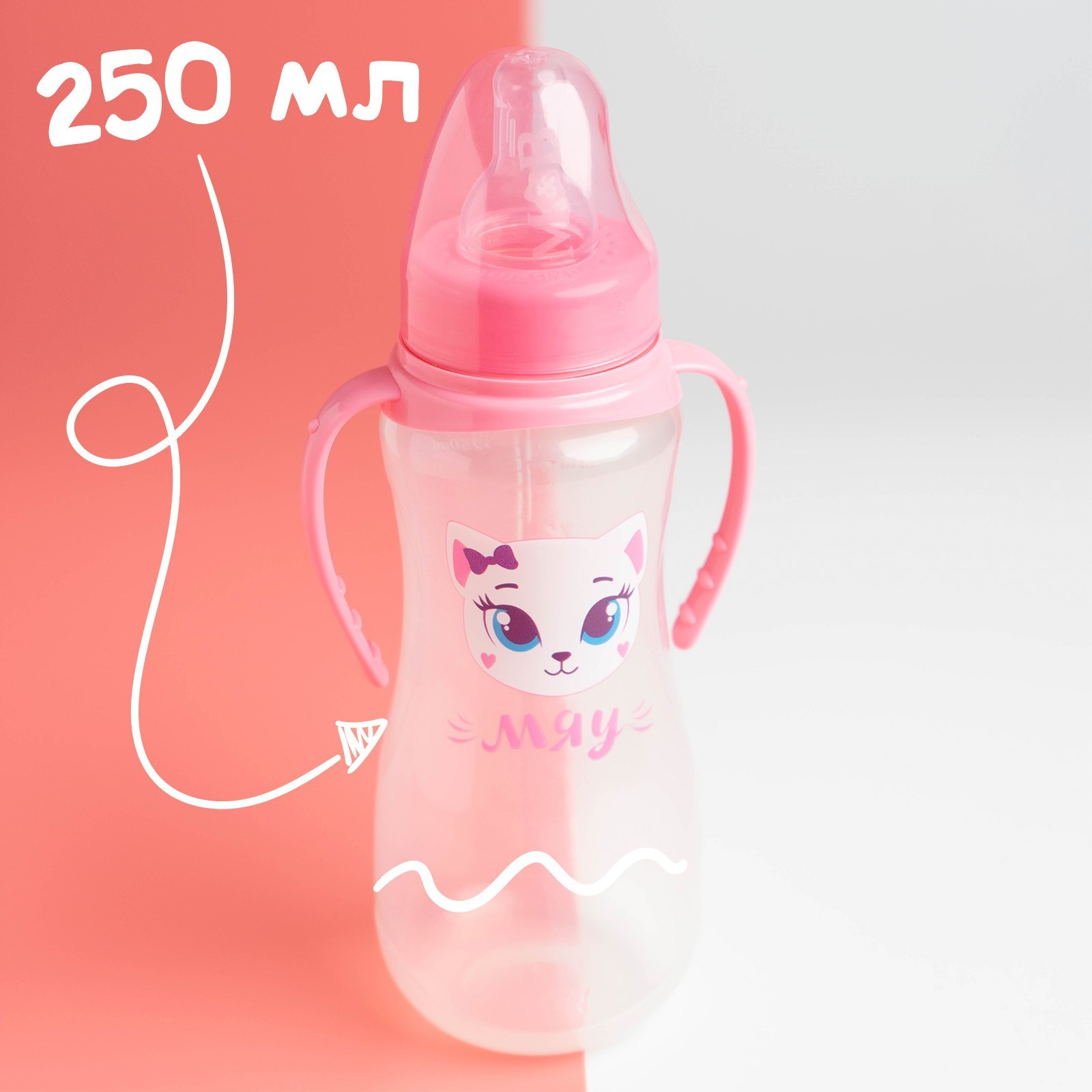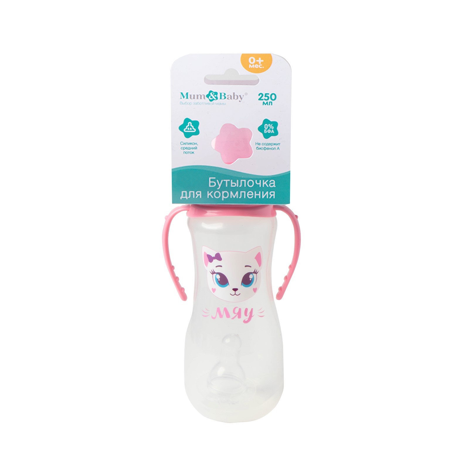 Бутылочка для кормления M&b «кошечка софи», классическое горло, приталенная, с ручками, 250 мл., от 0 мес., розовый