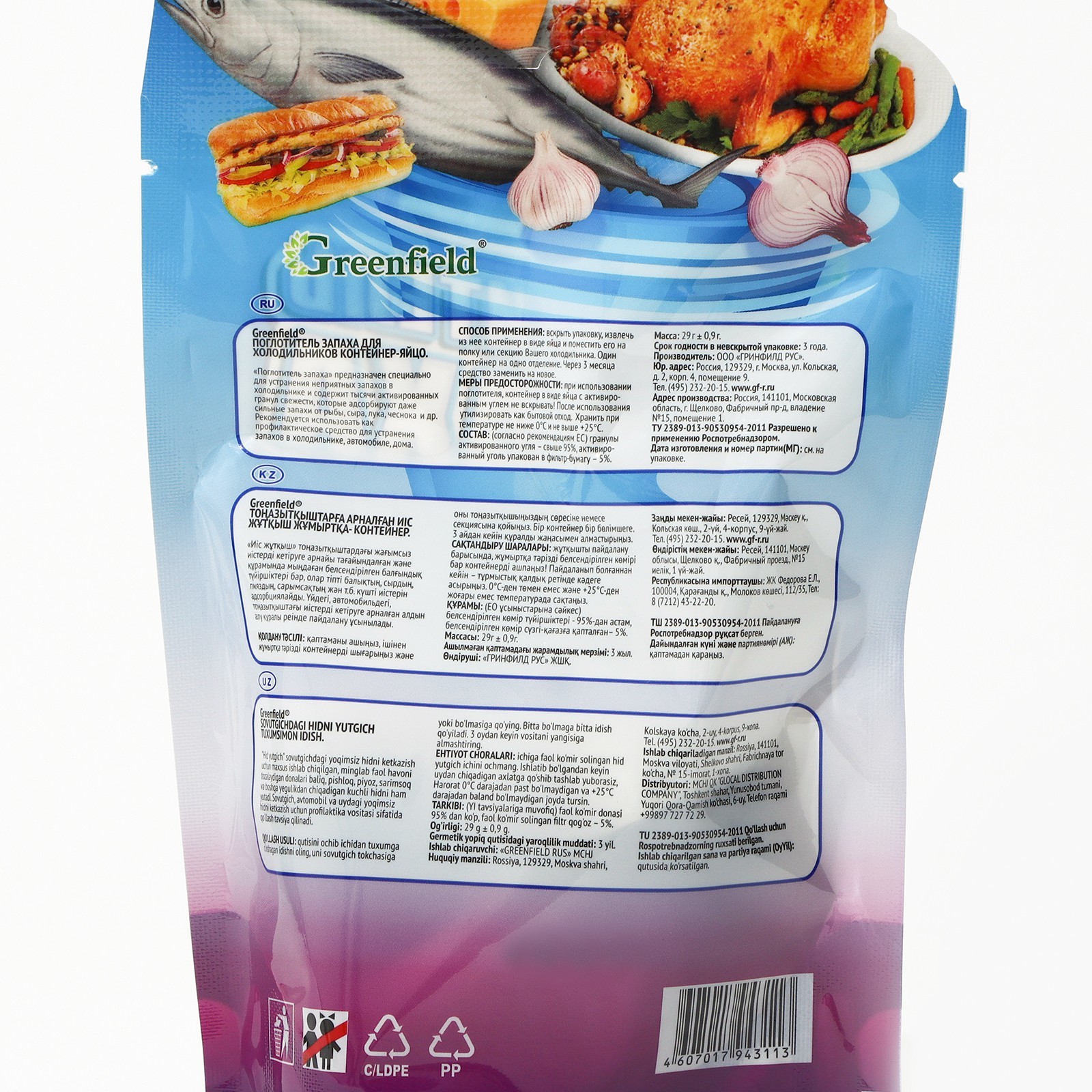 Поглотитель запаха для холодильников greenfield 2 шт в пакете. Поглотитель запаха предназначен специально для устранения неприятных запахов в холодильнике и содержит тысячи активированных гранул свежести, которые адсорбируют даже сильные запахи от рыбы, сыра, лука, чеснока и др. Рекомендуем использовать как профилактическое средство для устранения запахов в холодильнике, автомобиле, дома. Способ применения: вскрыть упаковку, извлечь из нее контейнер в виде яйца и поместить его на полку или секцию вашего холодильника. Один контейнер на одно отделение. Через 3 месяца средство заменить на новое. Состав: гранулы активированного угля свыше 95%. Аромат: Без аромата Назначение: Для кухонной техники  развернуть описание ▼