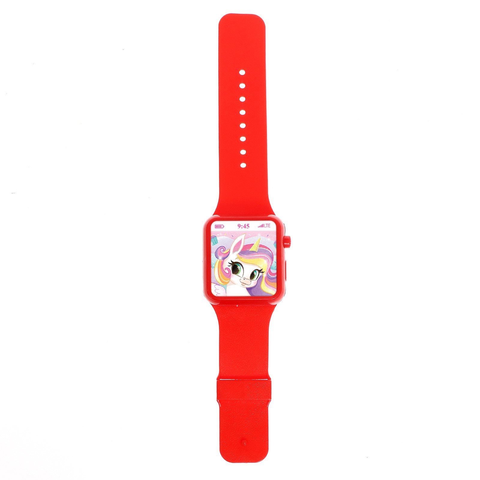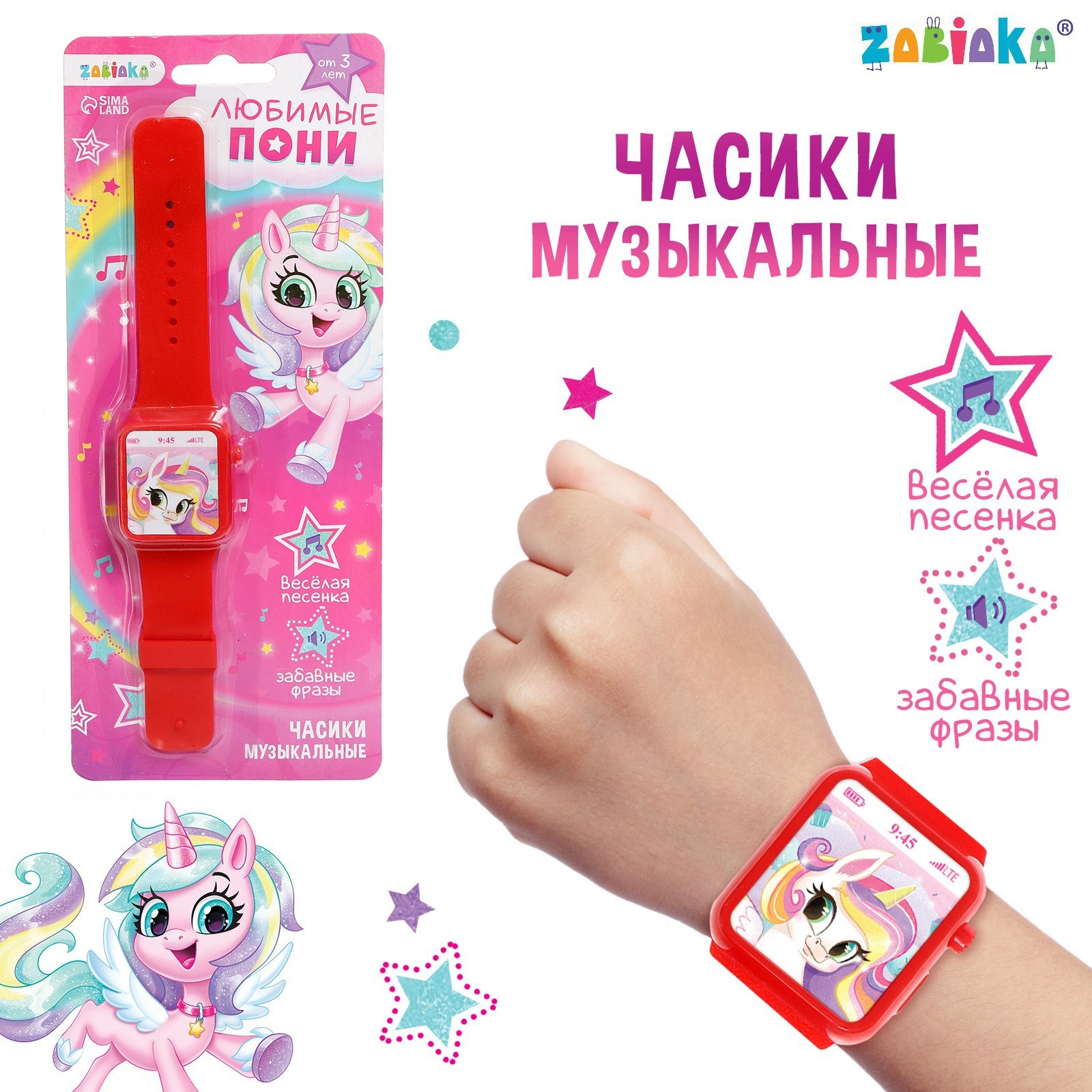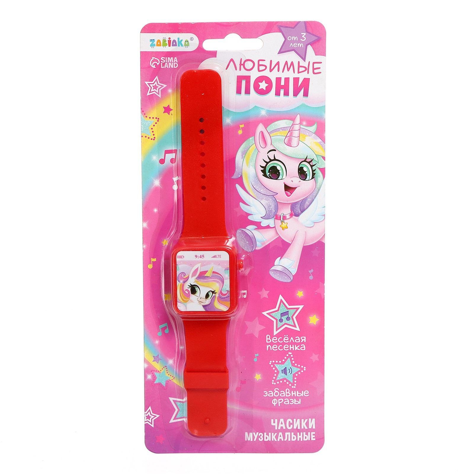 Часы детские музыкальные «любимые пони», звуковые эффекты, цвет красный. Время веселья и музыки! Детские часики «Любимые пони» – это яркий и увлекательный аксессуар для маленьких непосед, который превращает каждый день в приключение. Эти часы созданы не только для красоты, но и для радости: они заполнят ваш дом весёлой мелодией и забавными фразами, которые понравятся детям от 3 лет. Особенности Красный цвет ремешка и красочная панель создают впечатление настоящего сказочного мира.Встроенные звуковые функции обеспечивают весёлую песенку и забавные фразы, которые разнообразят игру и сделают времяпровождение ещё более интересным.В комплекте идут три батарейки типа AG13. Материал пластик обеспечивает безопасность и долговечность.На обороте упаковки находится игра, которая станет дополнительным подарком для малыша.Звуковые функции: звонок,мелодия,смех.Фразы, которые произносит игрушка: «Алло-алло»;«Привет, как дела»;«Давай дружить»;«Позвони маме»;«Позвони папе».Детские музыкальные часики станут отличным подарком для любого праздника. Яркий дизайн делает их идеальным выбором для девочек от 3 лет. Тип питания:От батареек|Цвет:Розовый|Для кого:Для девочки|Возраст:От 3 лет|Количество батареек:3|Материал:Пластик|Русская озвучка:Да|Дополнительные функции:Светящаяся|Дополнительные функции:Звуковые эффекты|Типоразмер батареек:LR44 (V13GA, AG13, LR1154, SR44)|Типоразмер батареек:LR41 (AG3, LR736, SR41)|Страна:Китай  развернуть описание ▼