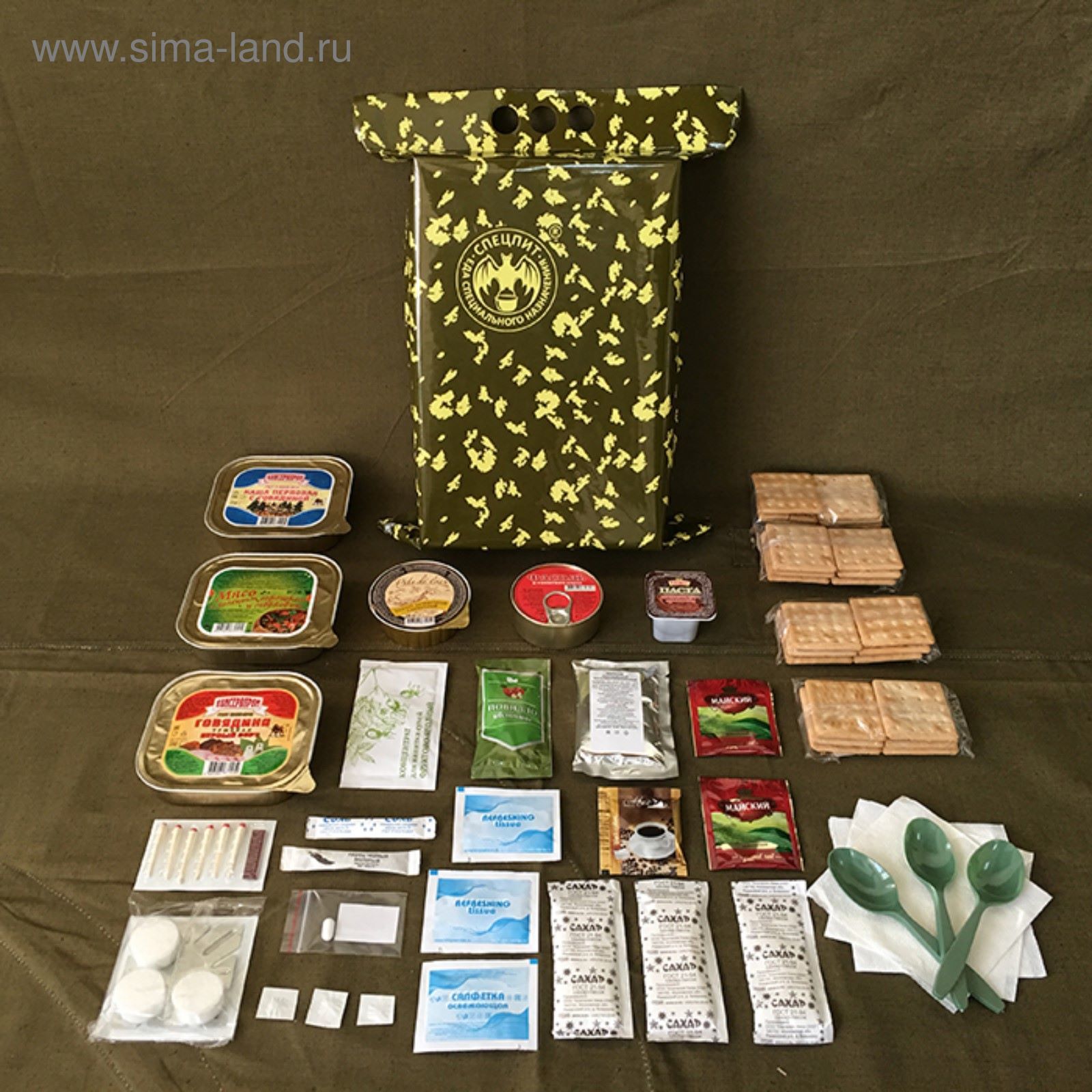 Сухой паек «спецпит» повседневный мвд (ирп-пс), на 1 сутки, 1,8 кг. Вкусный и надежный сухой паёк из натуральных продуктов является знакомым другом каждого солдата, помощником в походе и выезде на природу, а также подарком для мужчины на 23 февраля. Набор оптимально сбалансирован и состоит из питательных продуктов питания для наивысшего уровня активности. В состав входит всё необходимое, начиная от мясных консервов и заканчивая столовыми приборами. Каждый продукт в составе комплекта герметично запакован. Будьте уверены, что высокий срок годности и гибкие условия хранения не дадут пропасть вашему сухому пайку. Состав: Галеты армейские — 200 г. Консервы мясные — 250 г. Консервы мясорастительные — 250 г. Консервы мясоовощные — 250 г. Консервы овощные закусочные — 100 г. Паштет печеночный — 100 г. Паста шоколадно—ореховая — 50 г. Концентрат напитка тонизирующий — 25 г. Напиток молочный сухой — 30 г. Повидло фруктовое — 45 г. Кофе натуральный растворимый — 2 г. Чай черный байховый — 4 г. Сахар — 60 г. Соль поваренная пищевая — 5 г. Перец — 1 г. Разогреватель портативный — 1 к—т. Спички водоветроустойчивые — 6 шт. Поливитамины, драже — 1 шт. Средство для обеззараживания воды — 3 шт. Ложка пластмассовая одноразовая — 3 шт. Салфетки дезинфицирующие — 3 шт. Салфетки бумажные — 3 шт. Пищевая ценность: Жиры — 189 г. Белки — 115 г. Углеводы — 346 г. Энергетическая ценность 3582 КкалСрок годности — 20 мес. Масса — 1, 8 кг. Количество приёмов пищи: 3 Срок годности, мес: 23 Вес нетто, г: 1800 Продукты: Да  развернуть описание ▼