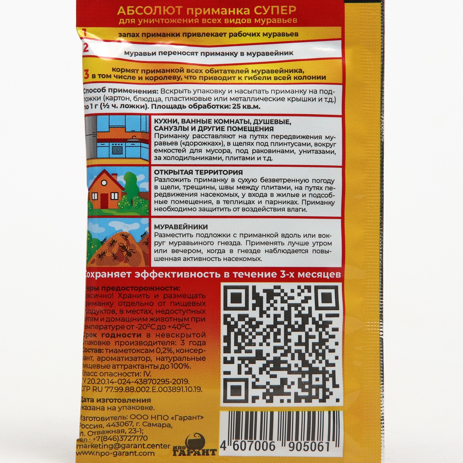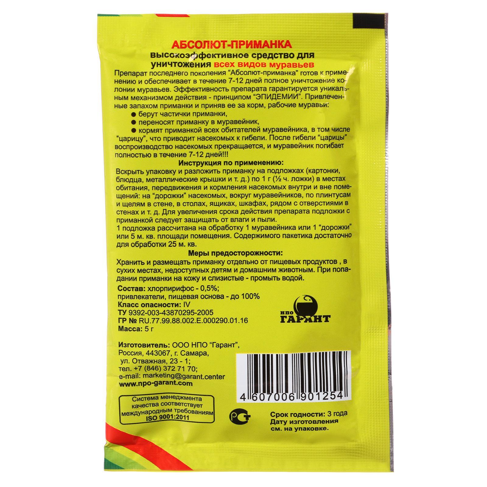 Приманка от муравьев "абсолют" 5 г.   Инсектицидное средство Абсолют приманка супер rранулированная пищевая приманка для уничтожения тараканов, муравьев (рыжих домовых и различных видов садовых) и имаго мух. СОСТАВДействующим веществом является тиаметоксам - 0, 2% - соединение кишечного, контактного и системного действия из rруппы неоникотиноидов. В состав средства входят также: вспомогательные инrредиенты, кон-сервант, стабилизатор, пищевые атrрактанты (мука, сахар и др. ). СПОСОБ ПРИМЕНЕНИЯДля уничтожения рыжих тараканов приманку расставляют на под-ложках или в контейнерах в местах обитания, скопления или передвижения тараканов из расчета 1-2 шт (до 5г на каждой) на помещение 10-15 м2. Гибель тараканов наступает через 2-3 суток. Подложки можно перемещать в другие места, где обнаружены тараканы. Для уничтожения рыжих домовых муравьев на кухнях, в ванных, душевых, санузлах приманку расставляют на путях передвижения (дорожки) муравьев, исходя из нормы расхода 1-2 подложки (контейнера) на помещение площадью ~20 м2. Для уничтожения садовых муравьев, заползающих на нижние этажи строений, подложки размещают в местах скопления и на путях проникновения муравьев в помещение: на открытых верандах, террасах, крыше, вдоль порога и по периметру. Для уничтожения имаго мух размещают из расчета 3-5 штук (до 5 г приманки на каждой) на помещение площадью до 15 м2 в местах наибольшего скопления мух желательно на верхних крышках подвесных шкафов, ящиков, холодильников, прочего оборудования и предметов мебели на высоте более 2м так, чтобы они не попали в поле зрения детей.  Вид средства: Таблетки  развернуть описание ▼