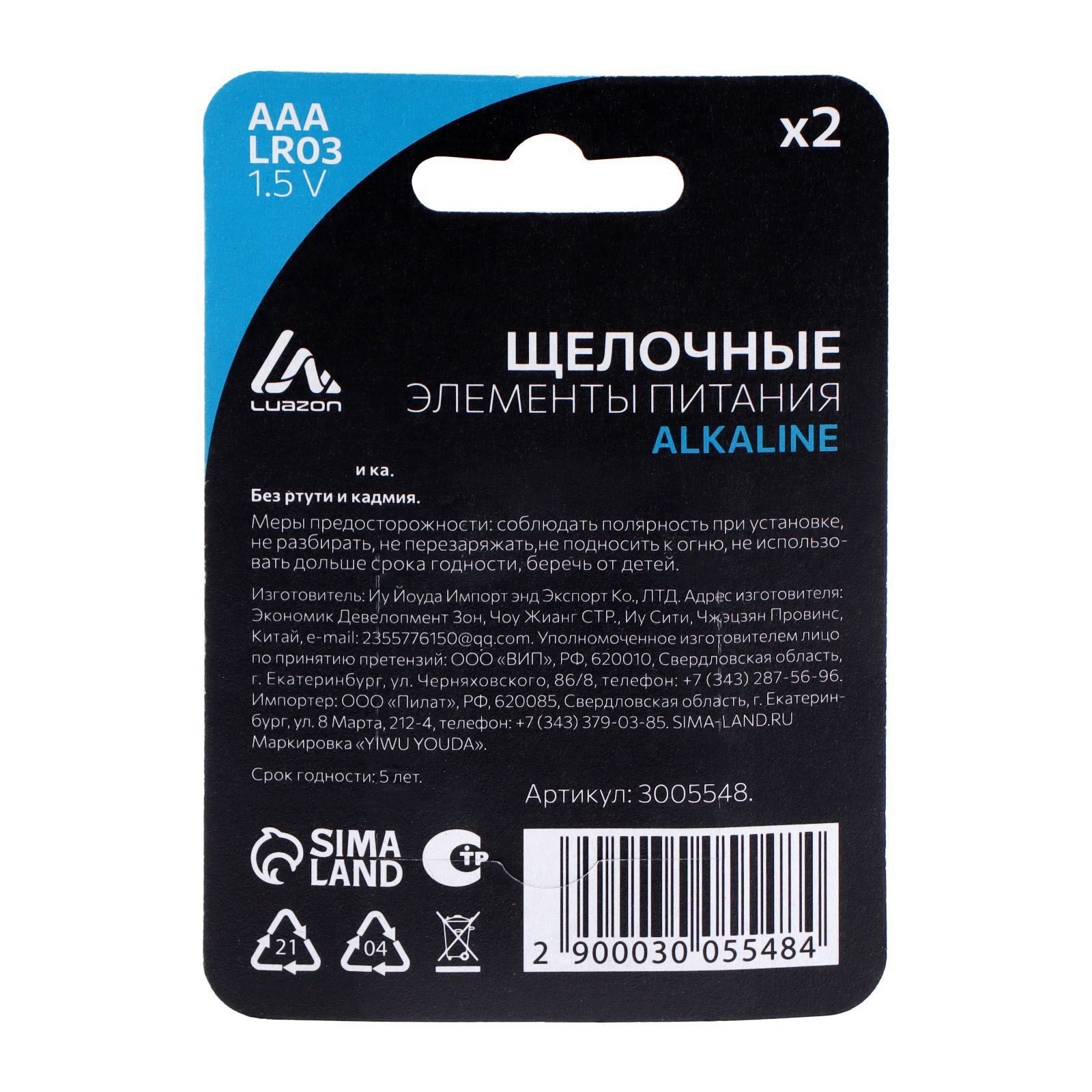 Батарейка алкалиновая (щелочная) Luazon, Aaa, Lr03, блистер, 2 шт