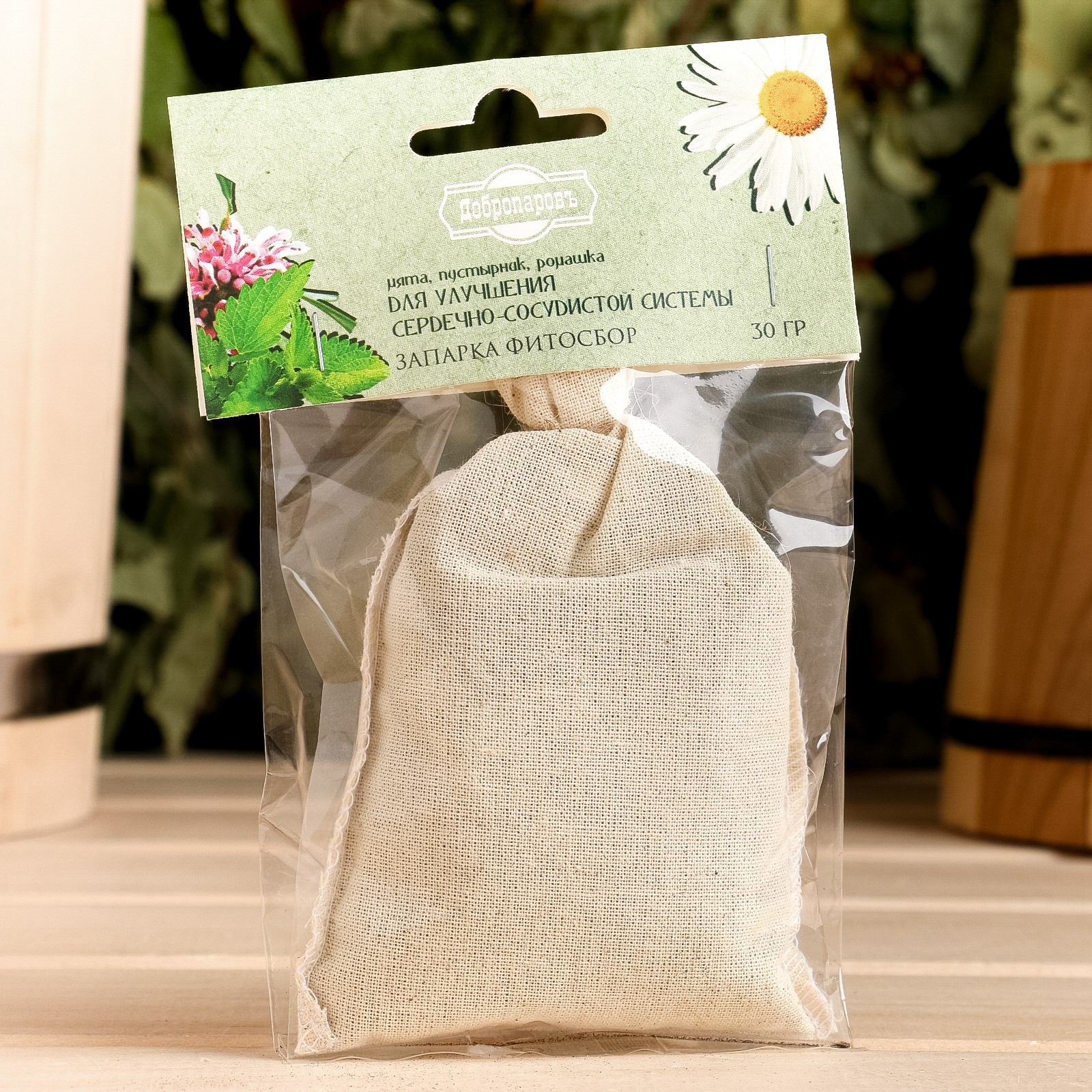 Запарка фитосбор для улучшения сердечно-сосудистой системы мята, пустырник, ромашка 30 г. Запарки для бани — это идеальное решение для тех, кто хочет насладиться ароматным паром и получить пользу для здоровья. Преимущества набора Запарки изготовлены из экологически чистых трав.Каждая трава обладает уникальными лечебными свойствами, которые помогут укрепить иммунитет, улучшить кровообращение, успокоить нервную систему.Способ применения Поместите мешочек в ёмкость с горячей водой и запаривайте в течение 15–20 минут.Поддавайте настоявшуюся воду на камни банной печи или разбрызгивайте с помощью веника на стены и полки.Также мешочек запарки можно замочить в ведре вместе с веником, что позволит усилить его целебные свойства и повысить эффективность банных процедур.Наслаждайтесь ароматным паром и целебными свойствами трав! Аромат:Ассорти|Вес запарки, г:30|Страна:Россия  развернуть описание ▼