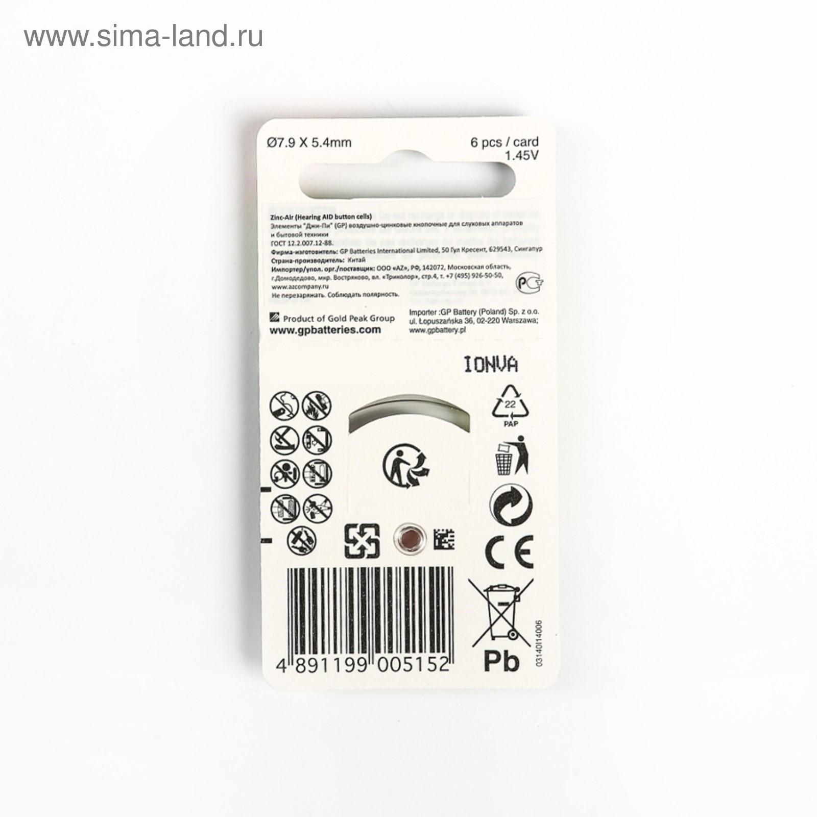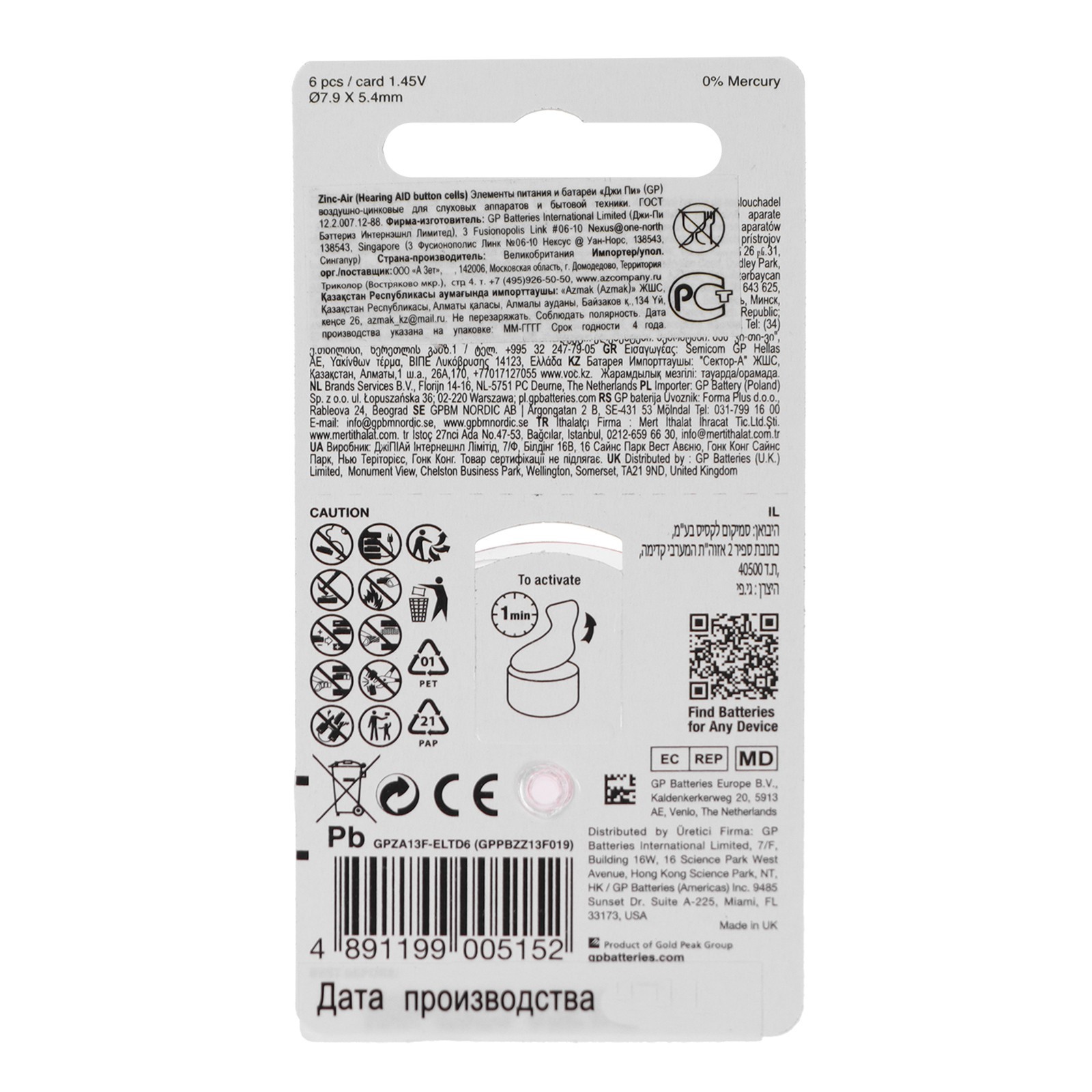 Батарейка цинковая Gp, Za13 (pr48)-6bl, для слуховых аппаратов, 1.45в, блистер, 6 шт.