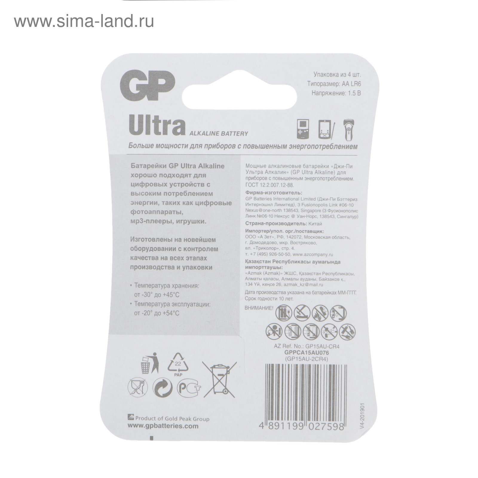 Батарейка алкалиновая Gp Ultra, Aa, Lr6-4bl, 1.5в, блистер, 4 шт.