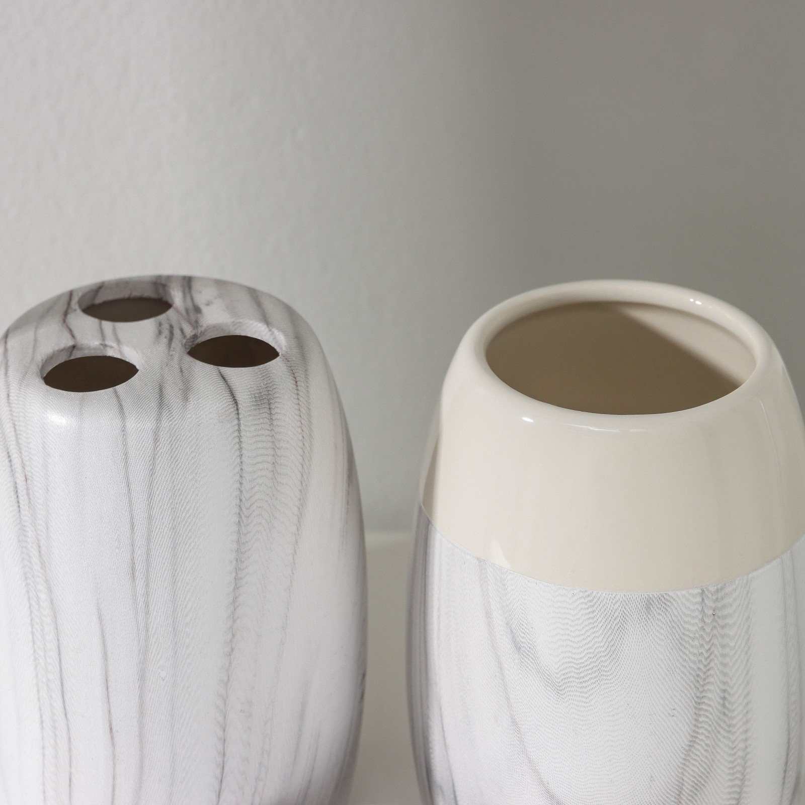 Набор аксессуаров значительно облегчит хранение ванных принадлежностей. Комплект выполнен из качественного керамического материала, благодаря этому, органайзеры прослужат очень долго. Изделия достаточно стойки к перепадам температуры и появлению царапин. Не поглощают влагу и неприятные запахи.