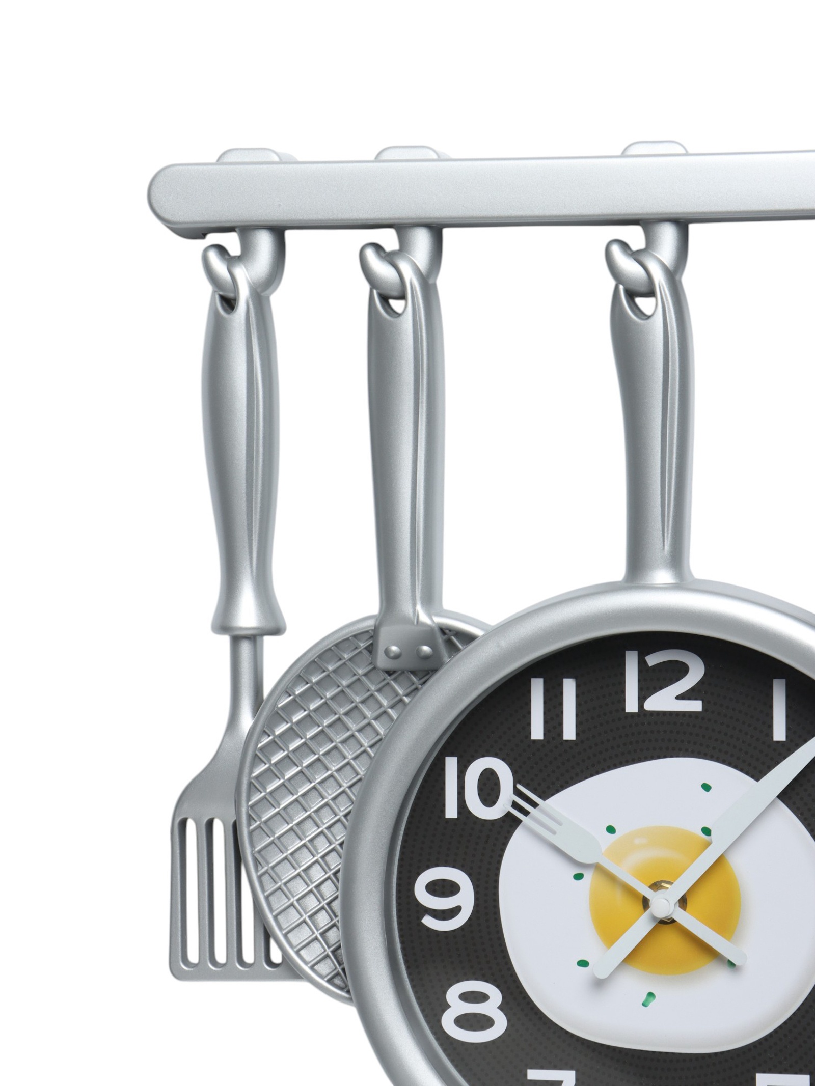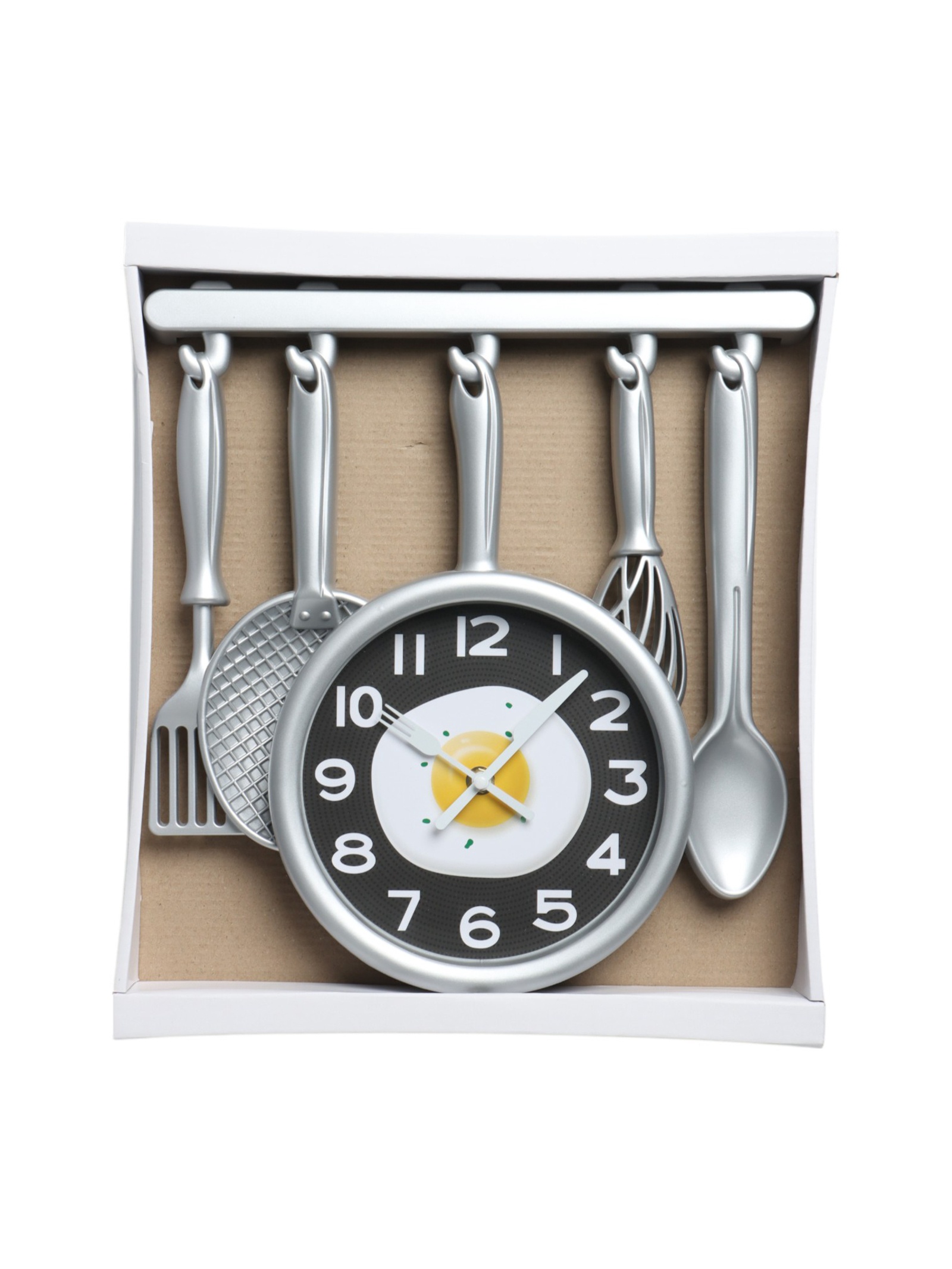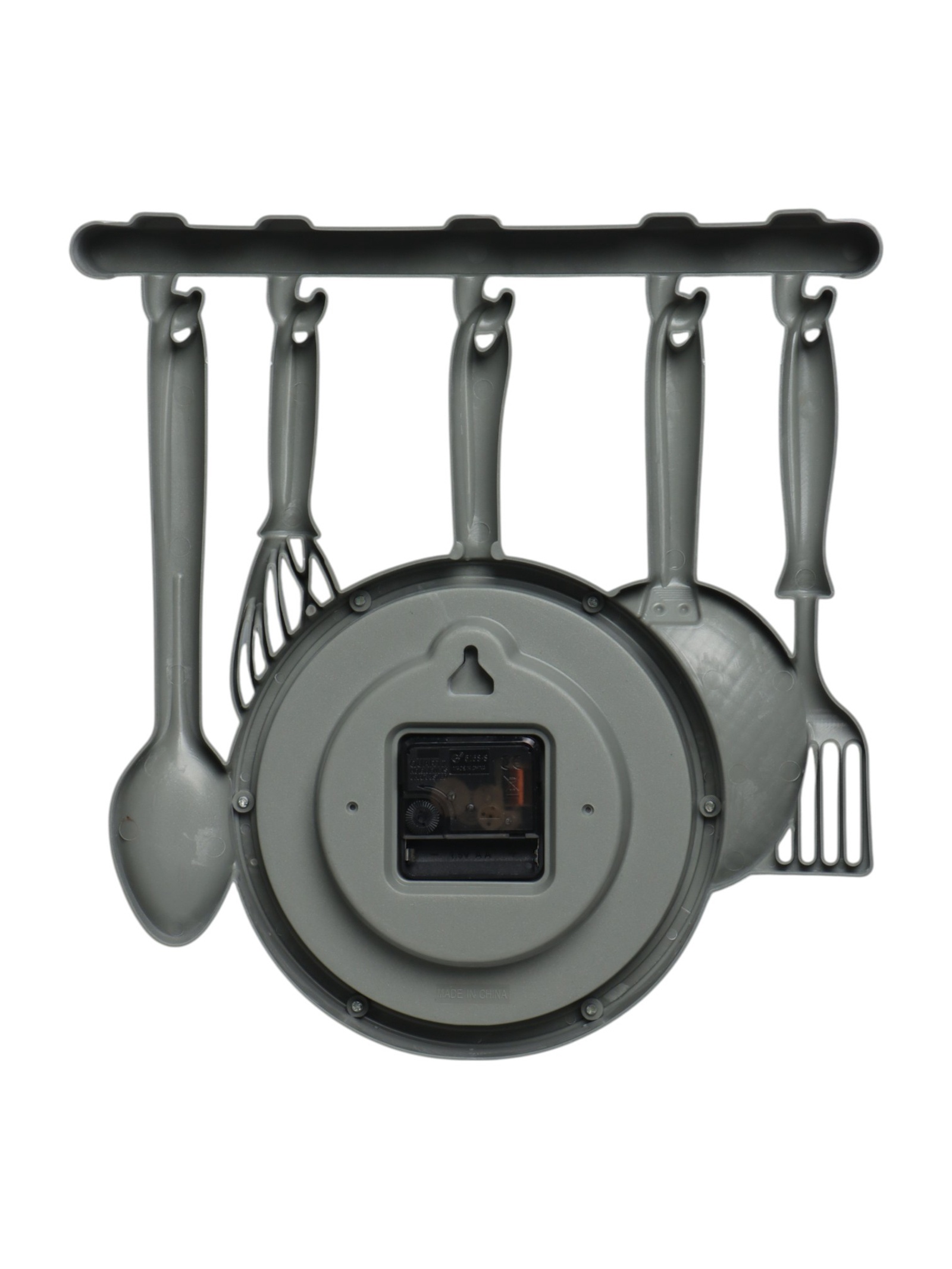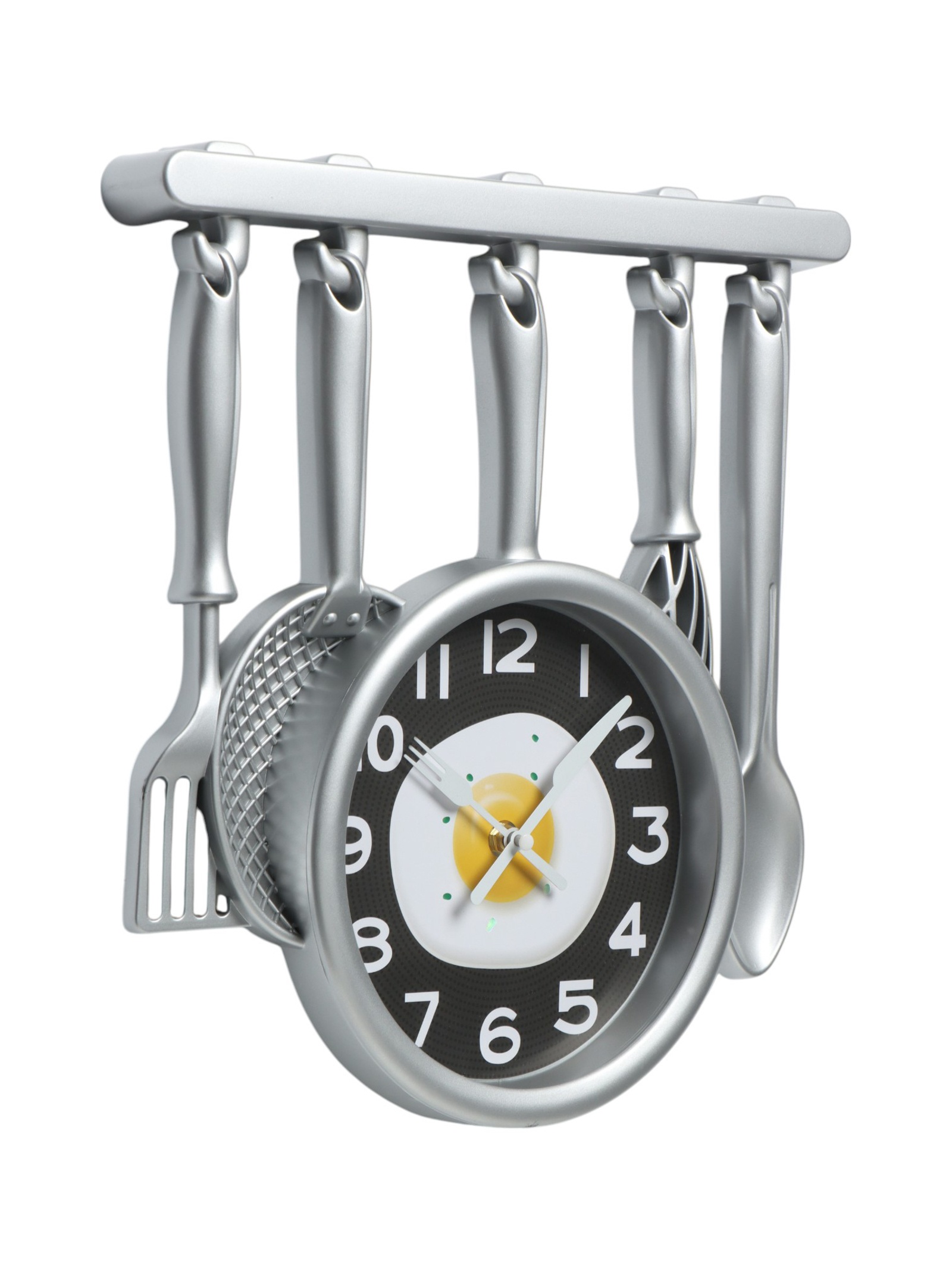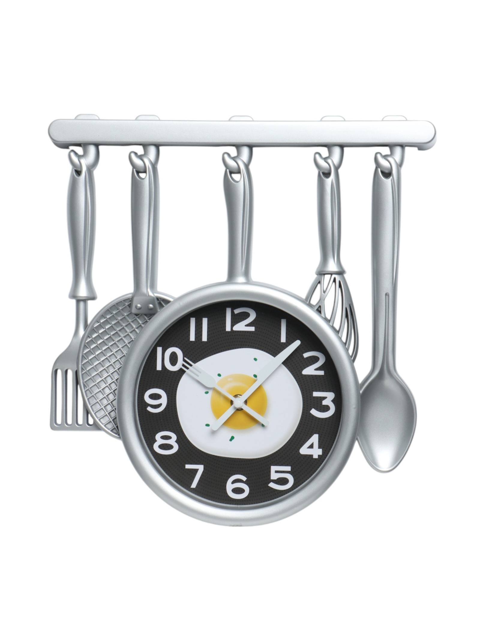 Часы настенные, серия: кухня, кухонная утварь, 32 х 34 см, серебро. Особенности Модель можно разместить в гостиной, офисе или на кухне.Корпус часов выполнен из пластика.Тип питания:От батареек|Форма:Фигурная|Ширина, см:32|Высота, см:34|Тематика:Кухня|Тип индикации:Арабские цифры|Тип механизма:Кварцевый|Форма корпуса:Фигурная|Цвет циферблата:Белый|Цвет циферблата:Чёрный|Материал:Пластик|Работает от сети:Нет|Типоразмер батареек:AA (LR6)|Цвет корпуса:Серебристый|Страна:Китай  развернуть описание ▼