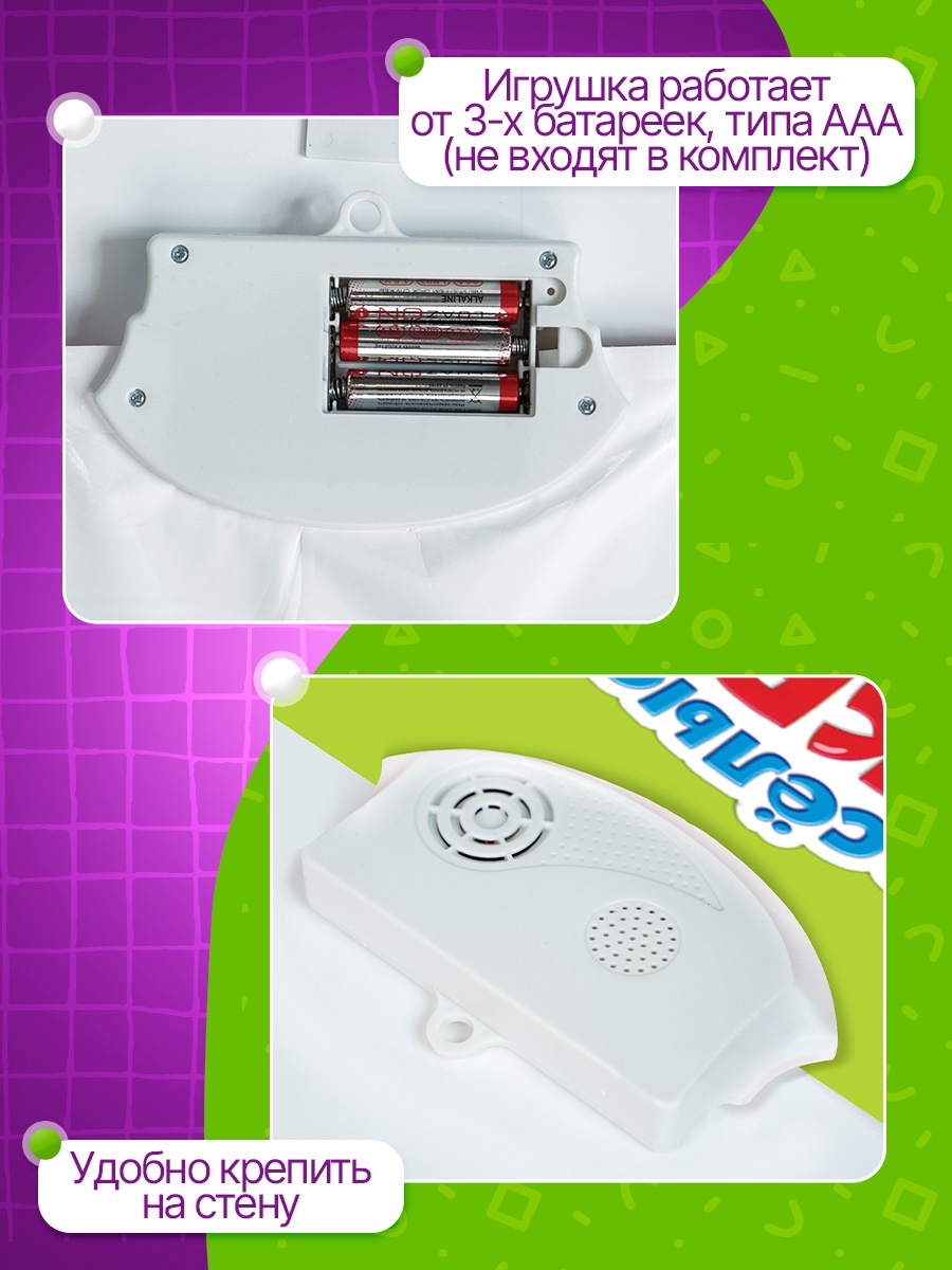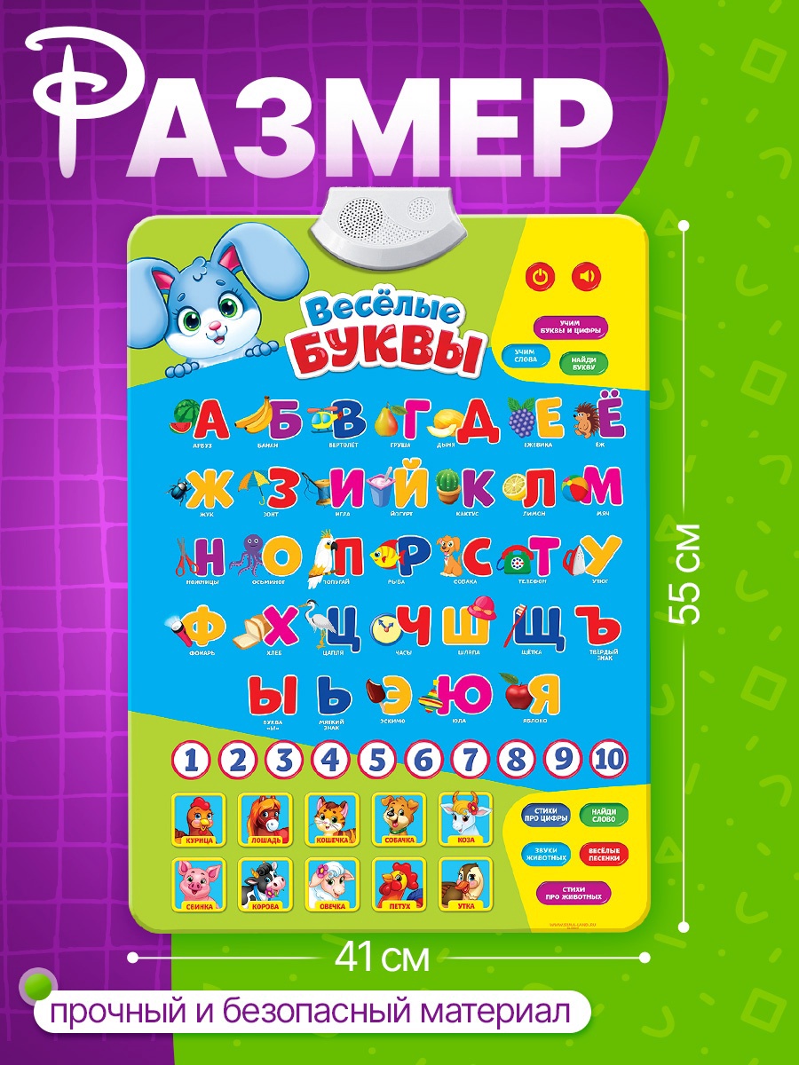 Обучающий электронный плакат «весёлые буквы», музыкальный алфавит, счёт, работает от батареек. Обучающий плакат «Весёлые буквы» — это интерактивная игрушка для детей от 3 лет, которая сделает обучение интересным и увлекательным. Он помогает освоить алфавит, цифры, основы счёта, логики, а также познакомиться с окружающим миром и музыкой. Плакат оснащён звуковыми эффектами и работает от батареек, что делает его удобным для использования дома и в поездке. Особенности Плакат обучает буквам, словам, цифрам, основам музыки и звукам животных.Звуковые эффекты делают процесс обучения увлекательным.Изготовлен из прочного пластика, что обеспечивает долговечность и безопасность в использовании.Идеален для самостоятельных занятий ребёнка или совместного изучения с родителями.Плакат компактный и удобный для размещения в детской комнате.Обучение через игру Дети лучше запоминают информацию, когда обучение сопровождается игрой. Плакат помогает развивать мелкую моторику, слуховое восприятие и логическое мышление. Ребёнок сможет изучать алфавит и счёт в лёгкой игровой форме, а музыкальные элементы подарят радость от нового опыта. Обучающий плакат — это не просто игрушка, а полезный инструмент для развития вашего ребёнка. Он станет отличным помощником в обучении, превратив скучные уроки в весёлую игру! Тип питания:От батареек|Для кого:Унисекс|Возраст:От 3 лет|Количество батареек:3|Материал:Пластик|Звук:Да|Дополнительные функции:Звуковые эффекты|Типоразмер батареек:AAA (LR03)|Тема обучения:Развитие логики/мышления|Тема обучения:Буквы, слова, русский язык|Тема обучения:Окружающий мир|Тема обучения:Цифры, счёт, математика|Тема обучения:Музыка|Батарейки в комплекте:Нет|Страна:Китай  развернуть описание ▼