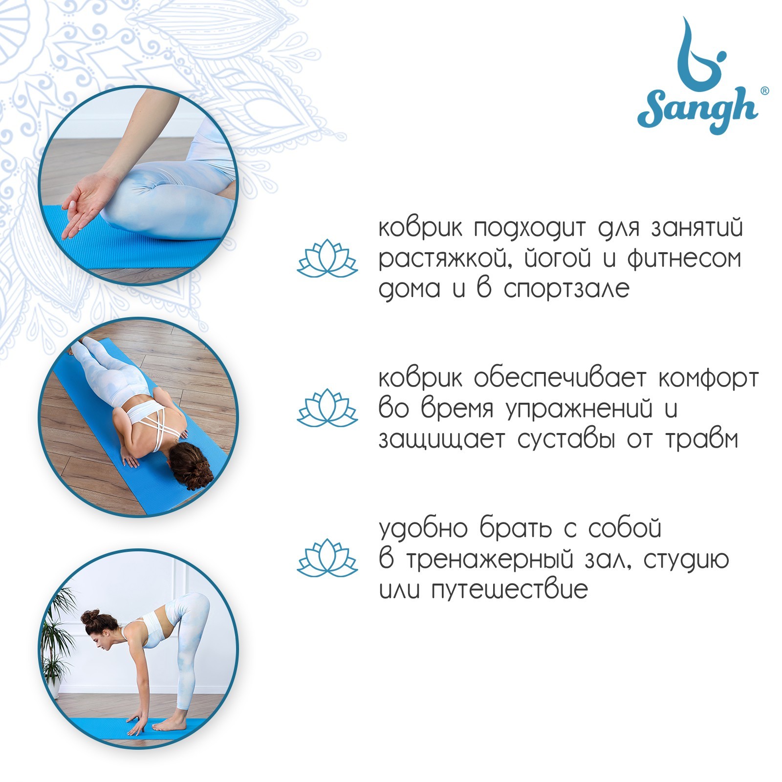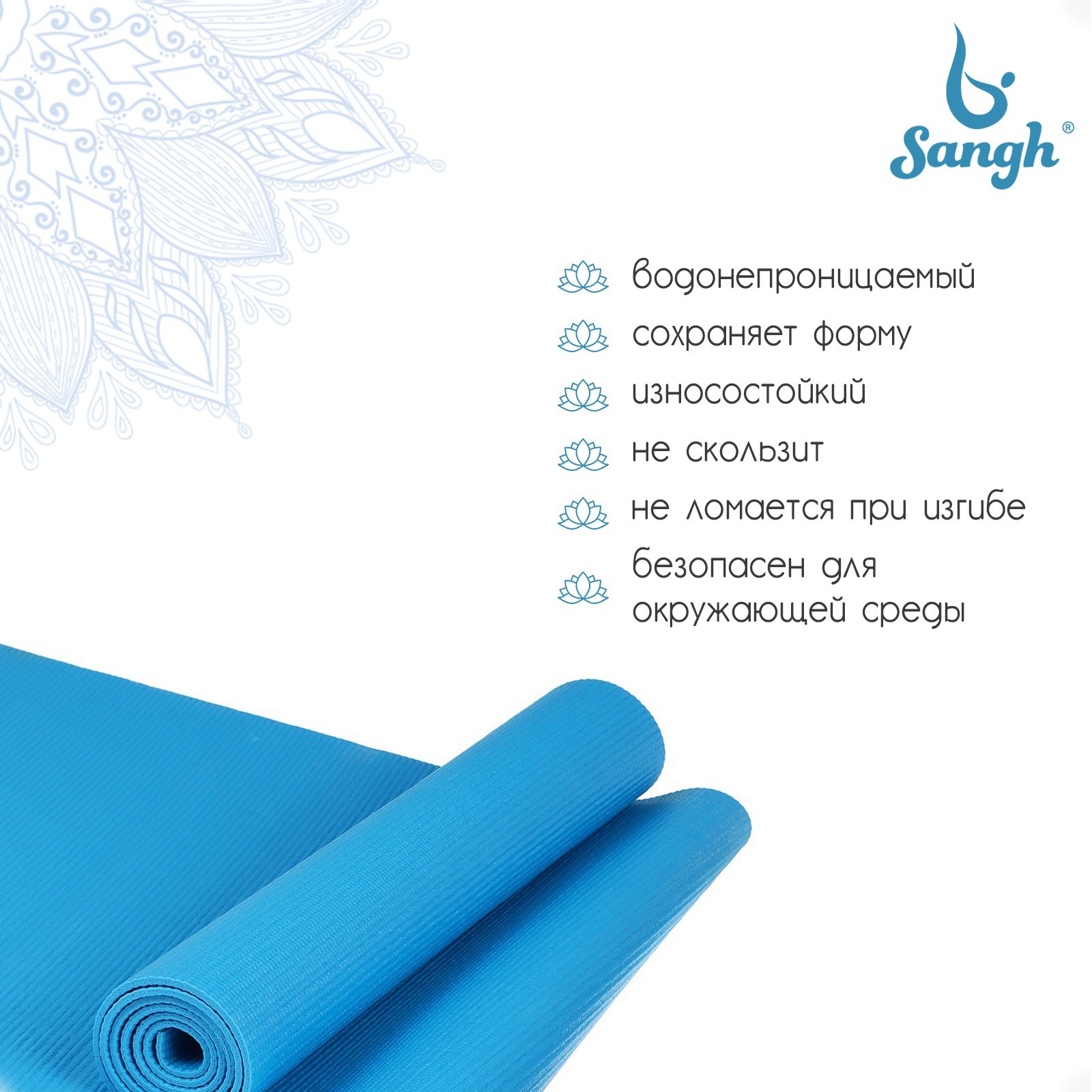 Коврик для йоги sangh, 173х61х0,4 см, цвет синий. Коврик подходит для занятий йогой и фитнесом дома и в спортивных залах. Помогает в выполнении асан или других упражнений. Смягчает упор тела на твёрдую поверхность. Сохраняет форму после выполнения упражнений. Цвет: Синий Длина, см: 173 Ширина, см: 61 Толщина, мм: 4 Возраст: Взрослый Материал: ПВХ Особенности: Нескользящий Вид: Классический  развернуть описание ▼