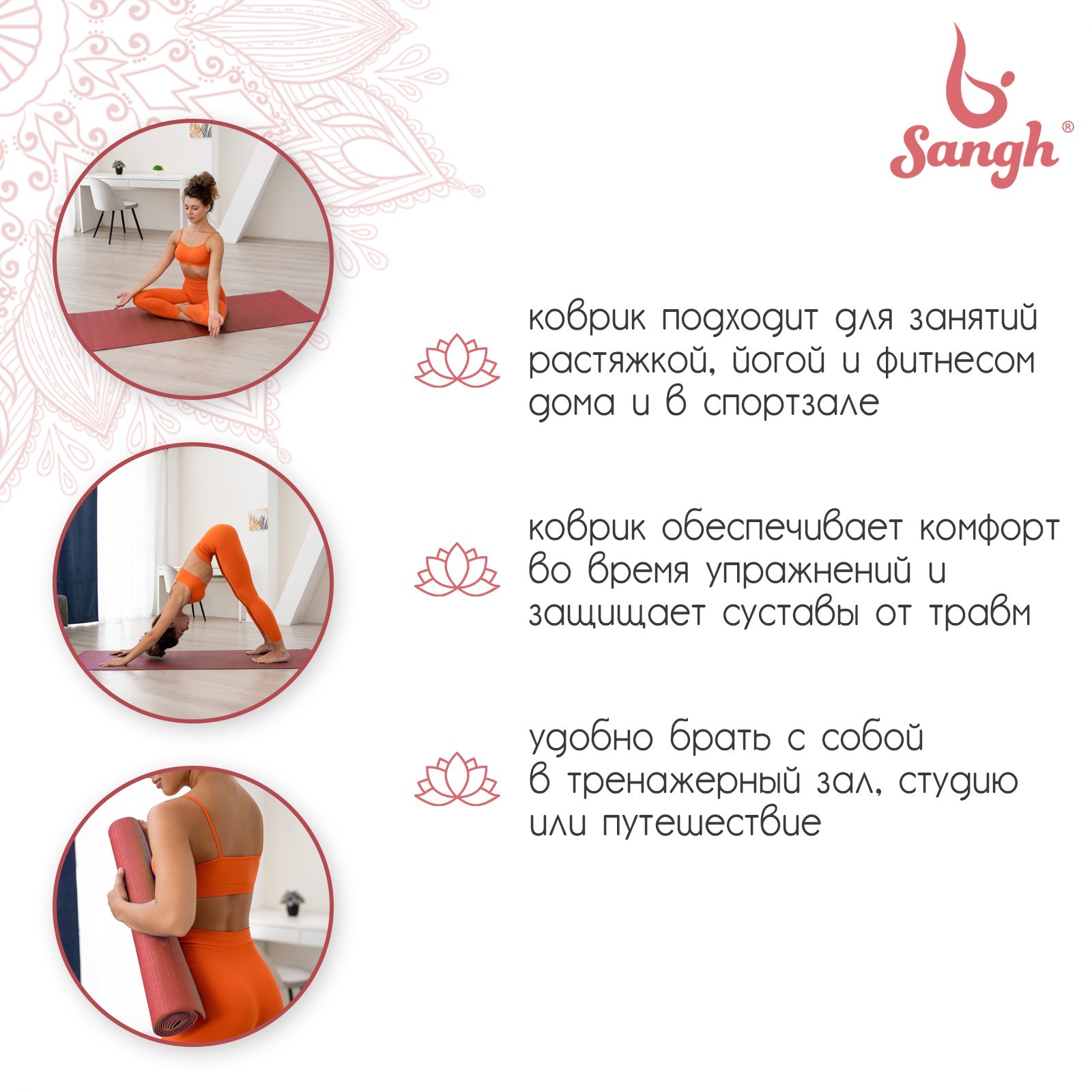 Коврик для йоги sangh, 173х61х0,3 см, цвет розовый. Коврик подходит для занятий йогой и фитнесом дома и в спортивных залах. Помогает в выполнении асан или других упражнений. Смягчает упор тела на твёрдую поверхность. Сохраняет форму после выполнения упражнений. Цвет: Розовый Длина, см: 173 Ширина, см: 61 Толщина, мм: 3 Возраст: Взрослый Материал: ПВХ Особенности: Нескользящий Вид: Классический  развернуть описание ▼