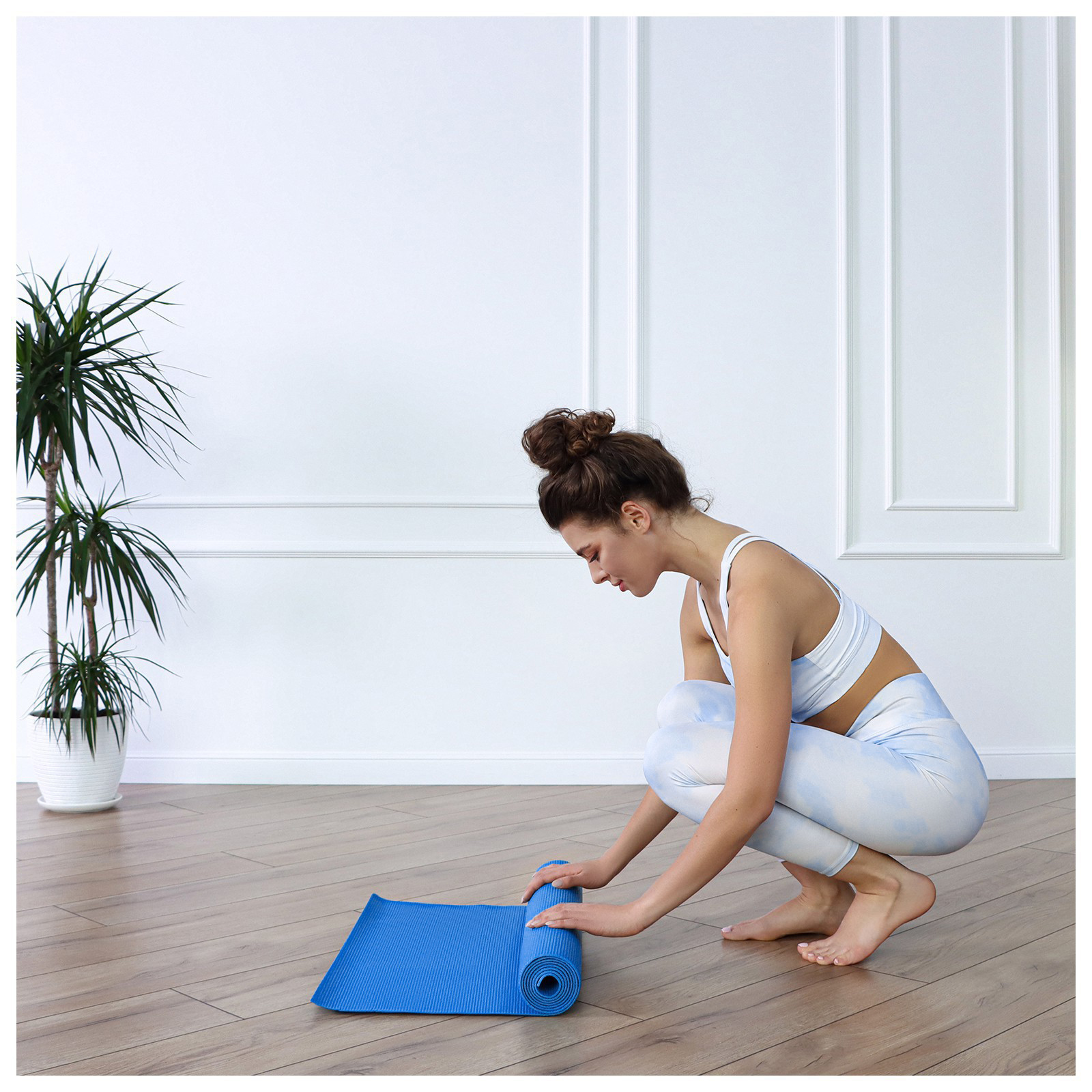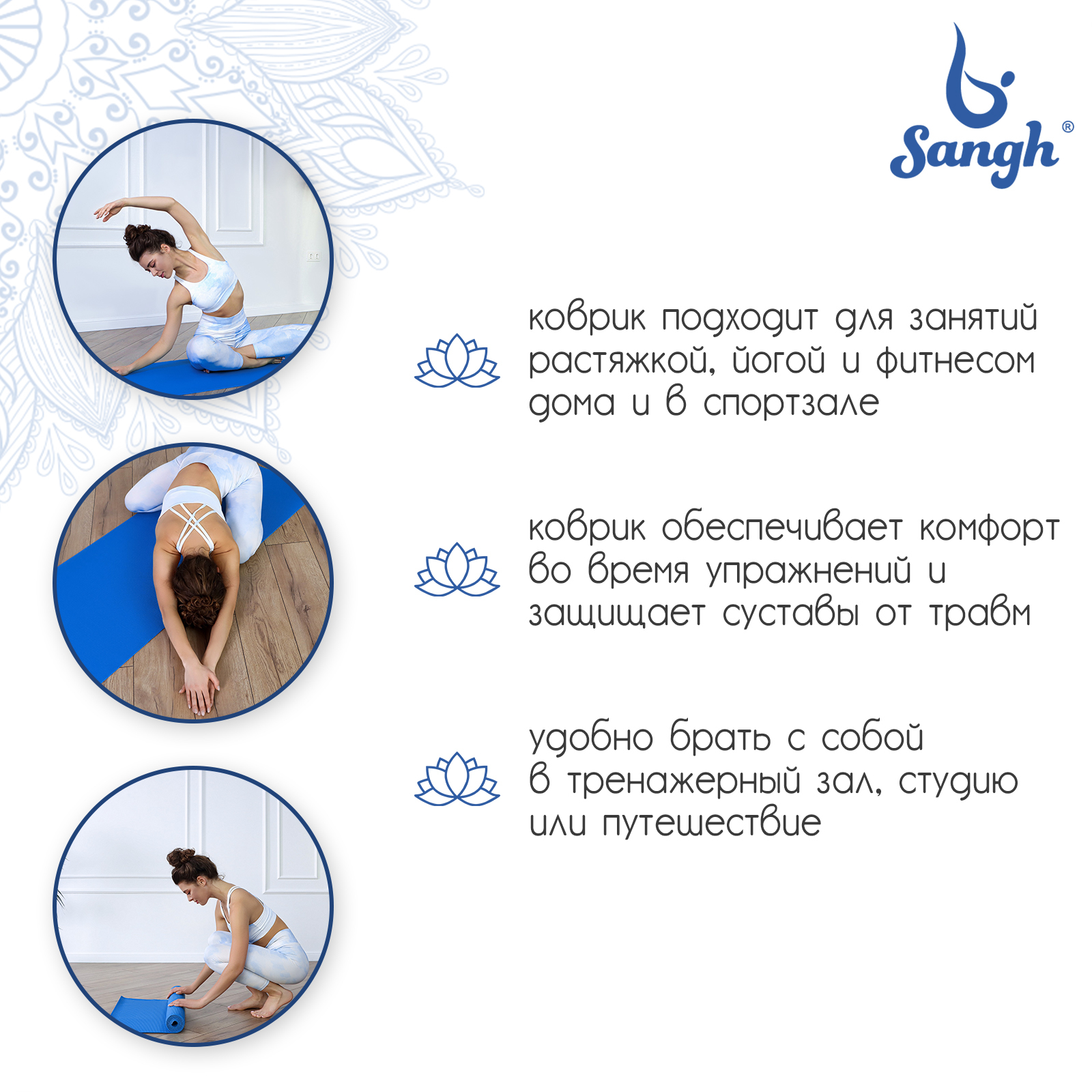 Коврик для йоги sangh, 173х61х0,3 см, цвет синий. Коврик подходит для занятий йогой и фитнесом дома и в спортивных залах. Помогает в выполнении асан или других упражнений. Смягчает упор тела на твёрдую поверхность. Сохраняет форму после выполнения упражнений. Цвет: Голубой Длина, см: 173 Ширина, см: 61 Толщина, мм: 3 Возраст: Взрослый Материал: ПВХ Особенности: Нескользящий Вид: Классический  развернуть описание ▼