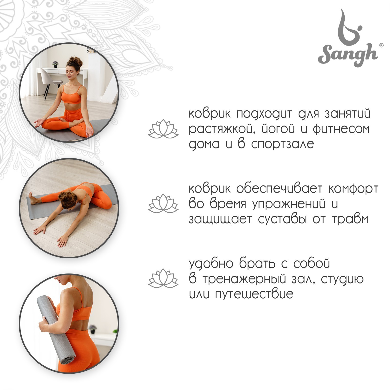 Коврик для йоги sangh, 173х61х0,3 см, цвет серый. Коврик подходит для занятий йогой и фитнесом дома и в спортивных залах. Помогает в выполнении асан или других упражнений. Смягчает упор тела на твёрдую поверхность. Сохраняет форму после выполнения упражнений. Цвет: Серый Длина, см: 173 Ширина, см: 61 Толщина, мм: 3 Возраст: Взрослый Материал: ПВХ Особенности: Нескользящий Вид: Классический  развернуть описание ▼