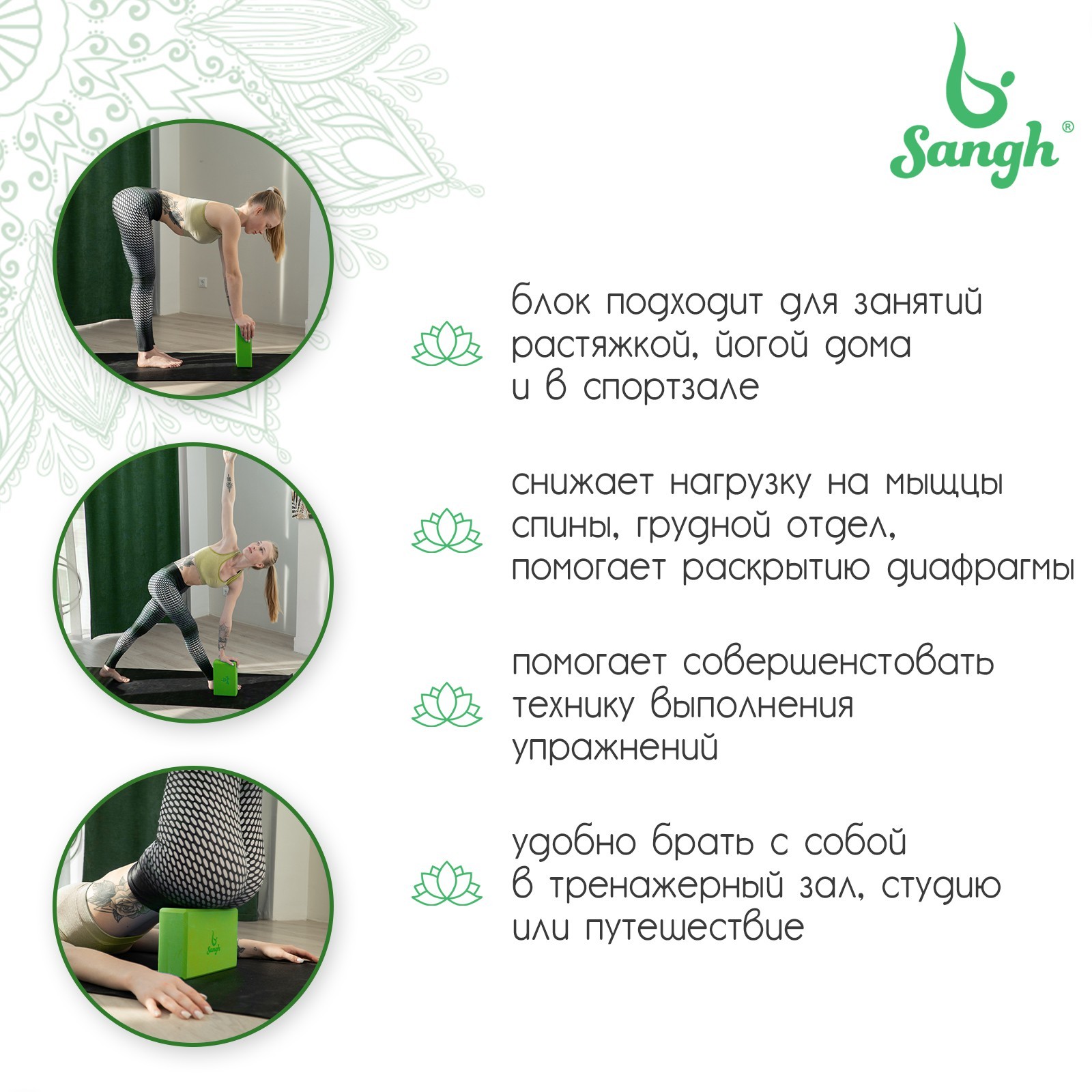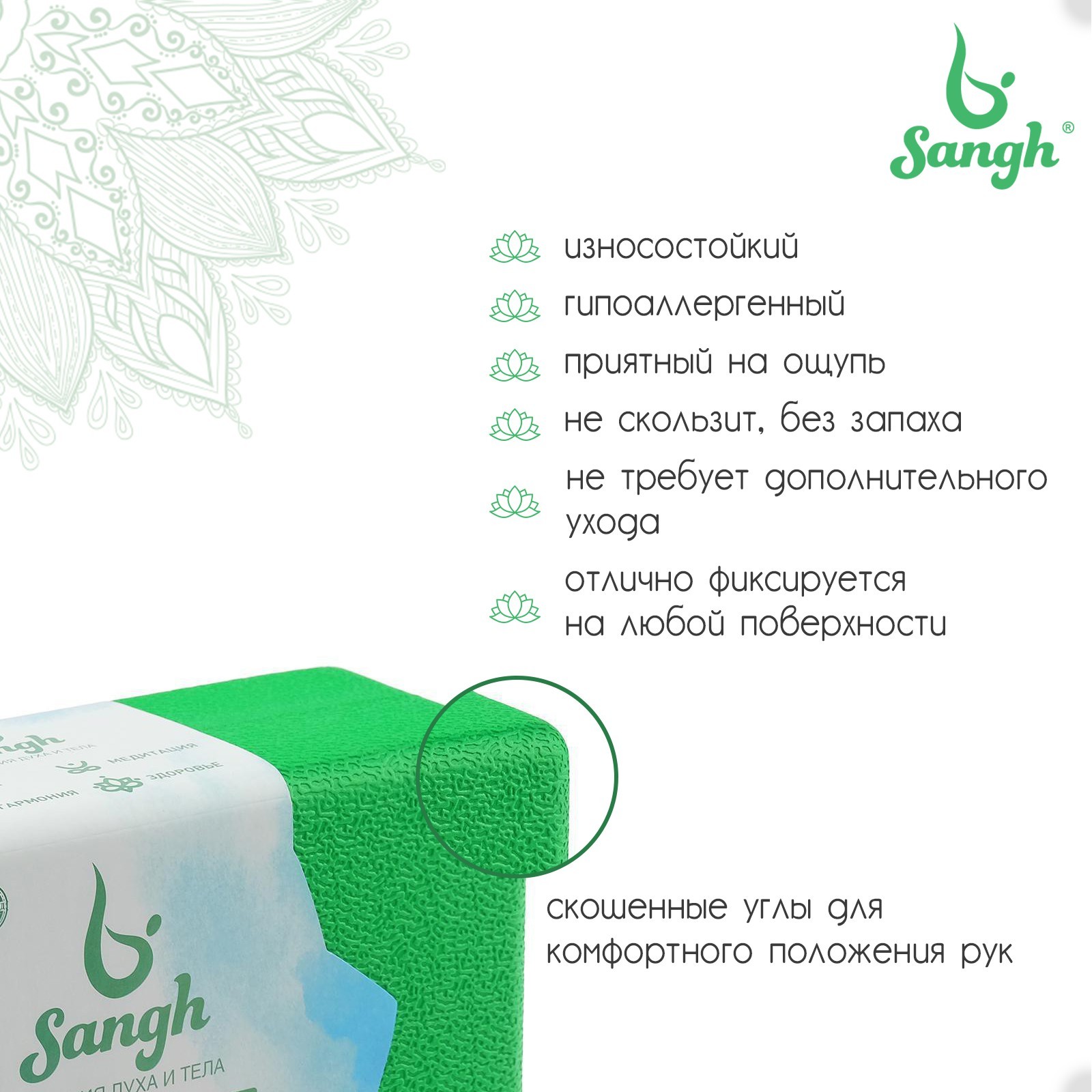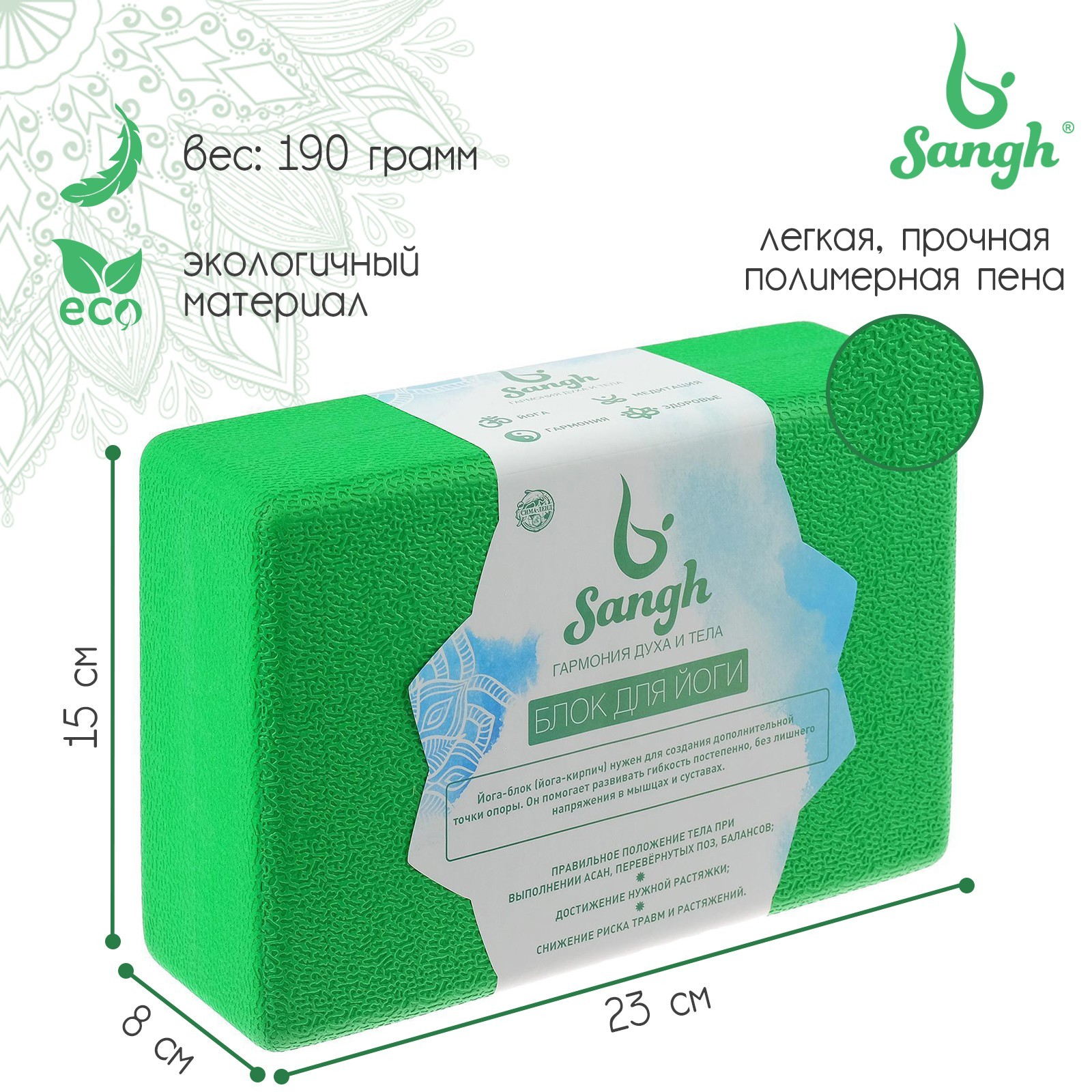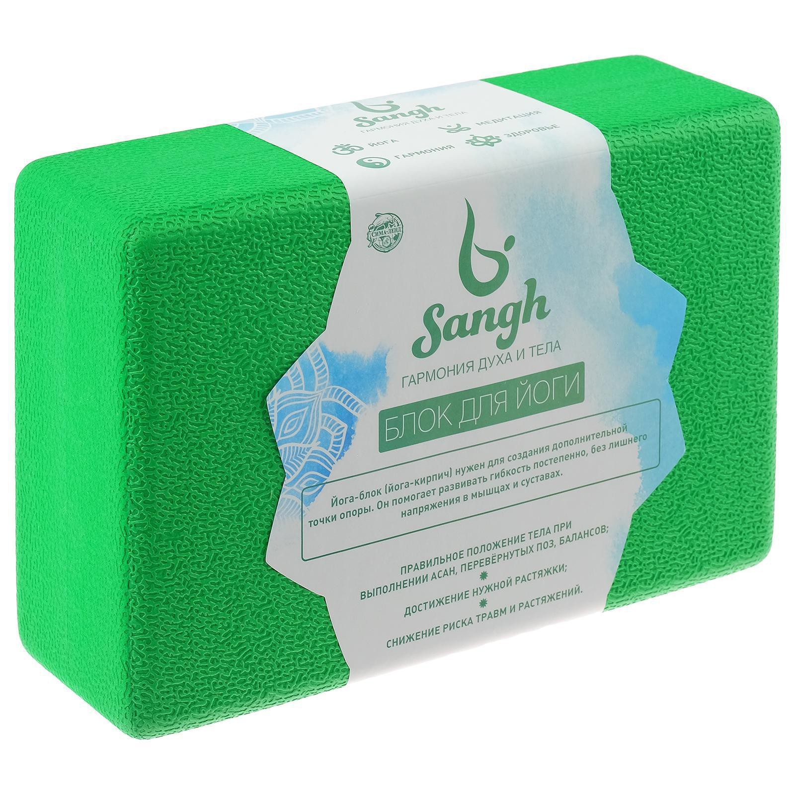 Блок для йоги sangh, 23х15х8 см, цвет зелёный. Йога-блок (йога-кирпич) нужен для создания дополнительной точки опоры. Он помогает развивать гибкость постепенно, без лишнего напряжения в мышцах и суставах. Необходим для тех, кто только начинает заниматься йогой, и кому не достает гибкости, чтобы иметь правильную опору для рук и ног при выполнении асан. Данная модель выполнена из материала высокой плотности, что препятствует крошению и делает блок легким, но устойчивым. Блок приятен на ощупь, имеет скругленные края и нескользящую поверхность для комфортных и безопасных занятий. Цвета блока подобраны так, чтобы вдохновлять вас на новые достижения в практике. Цвет: Зелёный Вид: Блоки для йоги  развернуть описание ▼