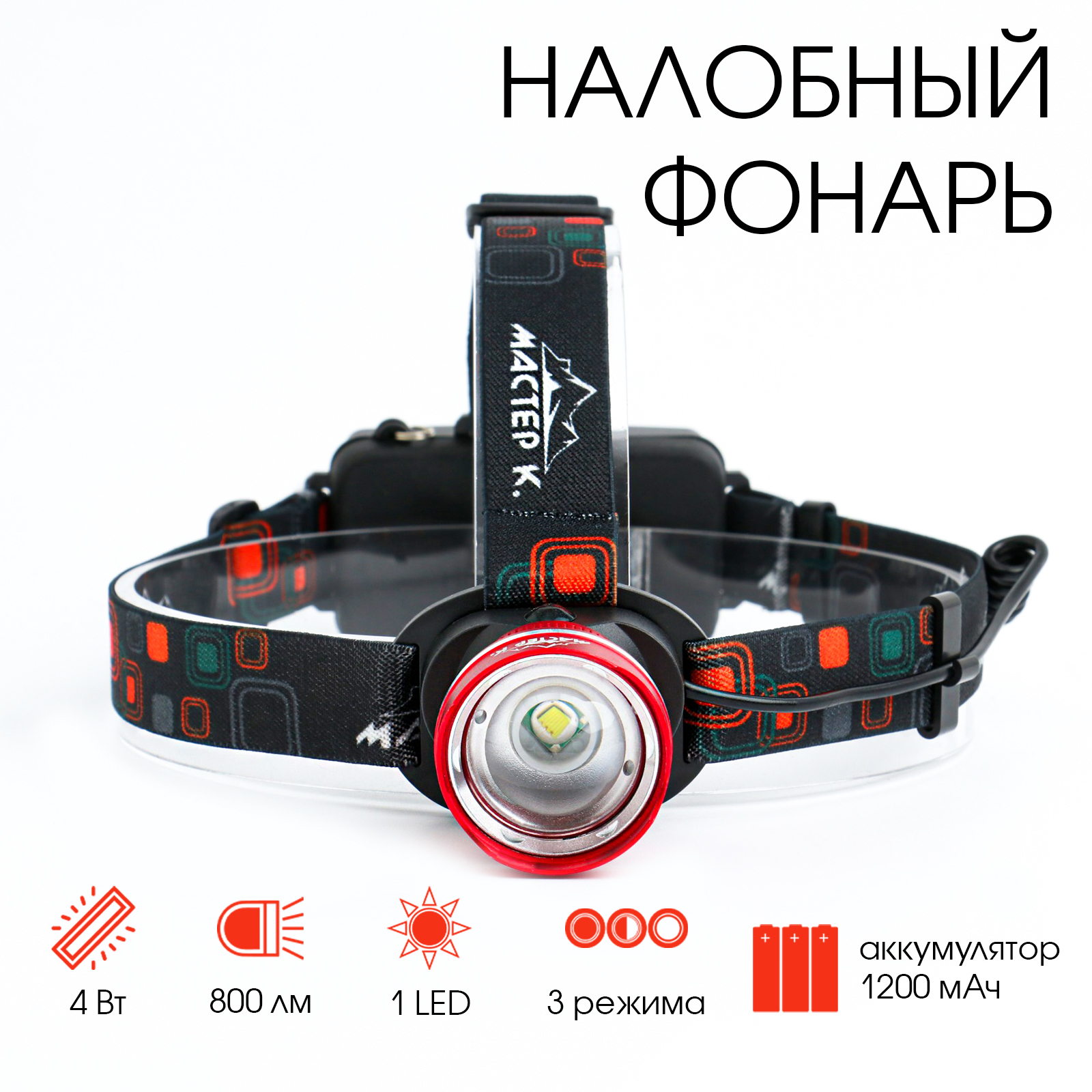 Фонарь налобный аккумуляторный "мастер к.", 1 Led, Zoom, 3 режима, 4.5 х 6.5 см