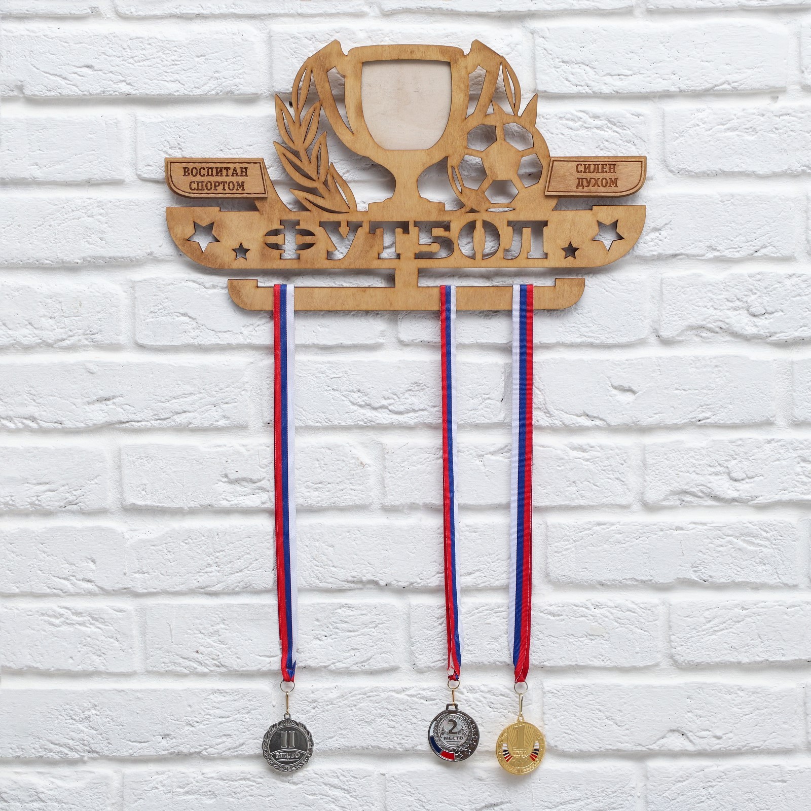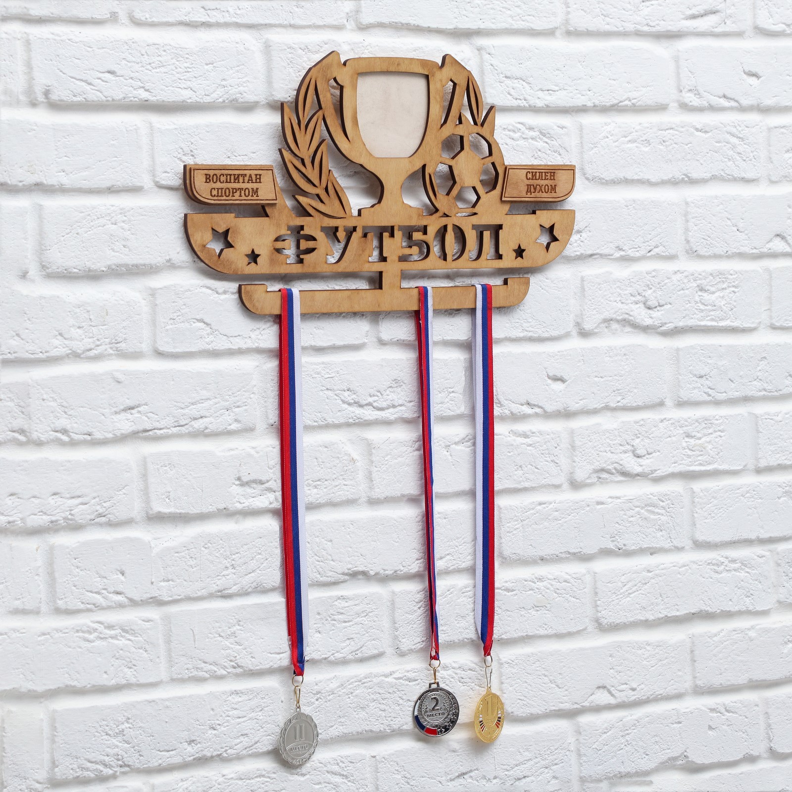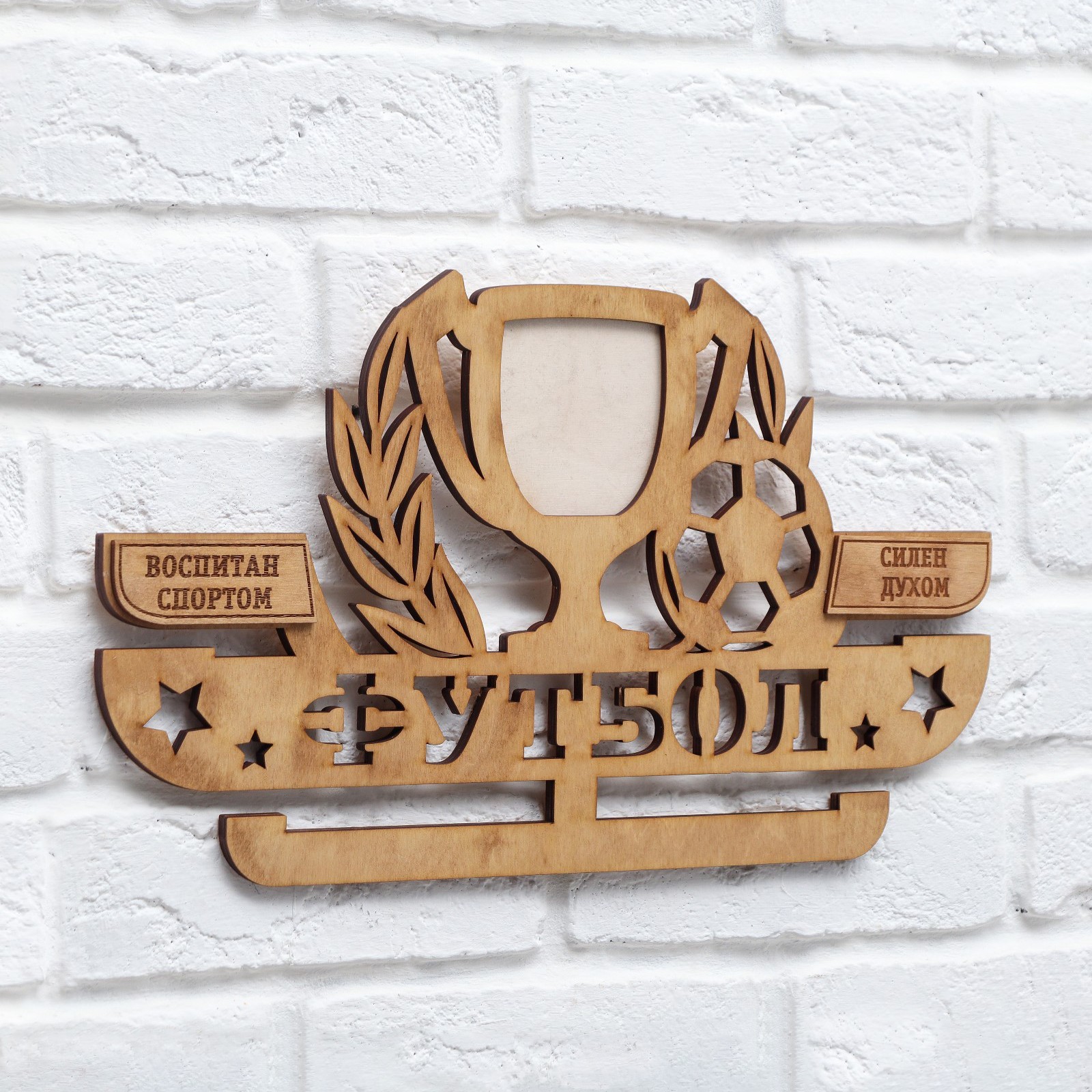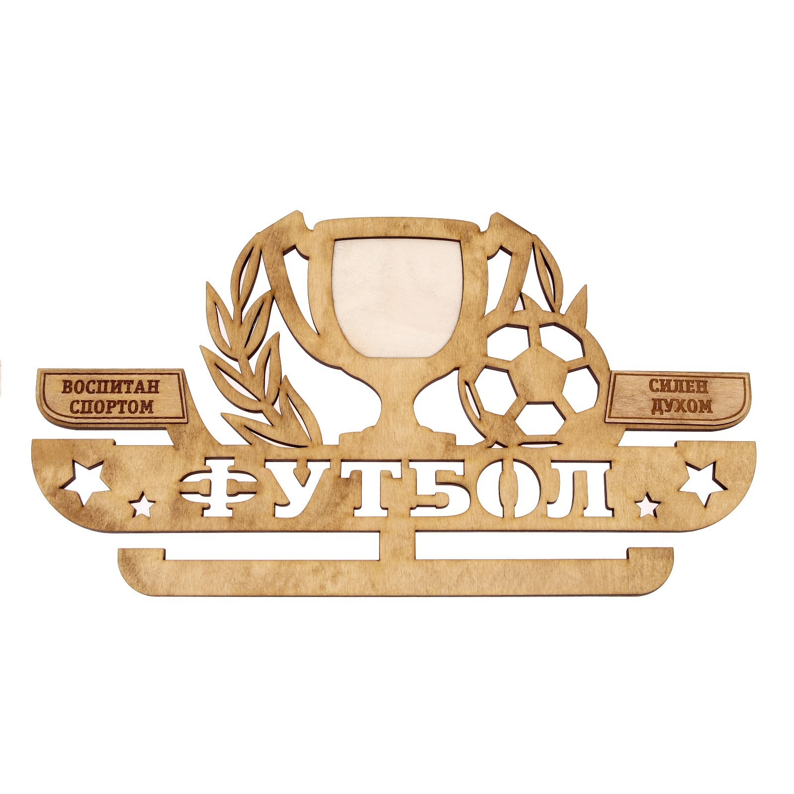 Медальница с фоторамкой "футбол". Цвет: Коричневый Длина, см: 45 Вид дерева: Фанера Материал: Дерево Вид спорта: Футбол Особенность медальницы: Одноцветные Особенность медальницы: Большие Особенность медальницы: С фоторамкой Особенность фоторамки: Медальница  развернуть описание ▼