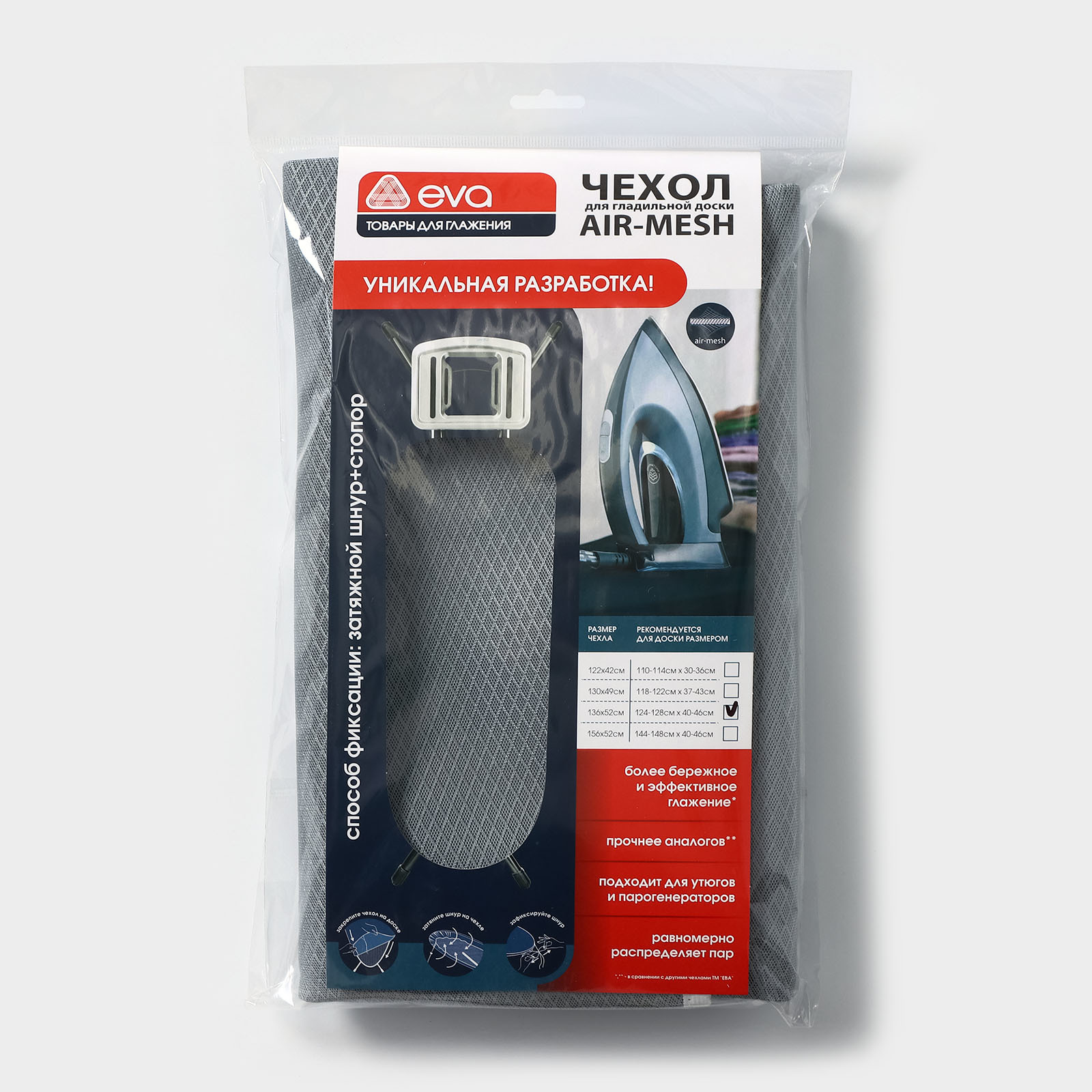 Чехол для гладильной доски eva, 136x52 см, термостойкий, цвет серый. Сменный чехол предназначен для защиты или замены покрытия гладильной доски. Объёмное 3D-плетение материала обеспечивает оптимальное распределение пара и циркуляцию воздуха, что увеличивает скорость и качество глажки. Чехол фиксируется на гладильную доску с помощью затяжного шнура и стопора. Цвет: Серый Ширина, см: 52 parts count: 0 Длина гладильной доски, см: 128 Длина рабочей части, см: 136 Материал: Полиэстер Температурное ограничение: Нет Подложка: Без подложки Материал чехла: Полиэстер Материал чехла: Нейлон  развернуть описание ▼