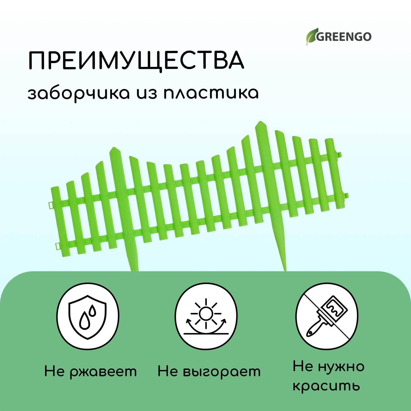 Ограждение декоративное, 30 300 см, 5 секций, пластик, салатовое, greengo. Декоративный заборчик для сада изготовлен из качественного и прочного пластика, который устойчив к воздействиям окружающей среды. Нет необходимости убирать садовый бордюр на зиму. В холодную погоду не подвергайте забор каким-либо воздействиям, так как пластик становится хрупким. Благодаря сборной конструкции из отдельных секций можно собрать ограждение любого размера и формы. Заборчик очень легко собирается и надежно фиксируется. Декоративная изгородь украсит ваш сад и огород. С помощью пластикового ограждения легко выделить грядки на даче, садовые клумбы для цветов, дорожки, зонировать дачный участок, огород, защитить деревья. Преимущества Быстрая установка.Простая и лёгкая конструкция.Устойчива к плохим погодным условиям.Защитит растения от грызунов и вредителей.Не ржавеет.Не выгорает на солнце.Всегда сохраняет яркий красивый видКак установитьx Выбираем место для ограждения (это может быть садовая дорожка, грядка или клумба).Расчищаем место от травы и других растений.Берём одну ячейку и аккуратно втыкаем её ножками в землю на максимальную глубину.Вставляем вторую ячейку рядом с первой и соединяем их при помощи специальных креплений, не прикладывая физическую силу. Таким образом устанавливаем все секции.Цвет:Зелёный|Длина, см:300|Количество секций:5|Высота заборчика без ножки, см:20|Длина секции, см:60|Материал:Пластик|Страна:Россия  развернуть описание ▼