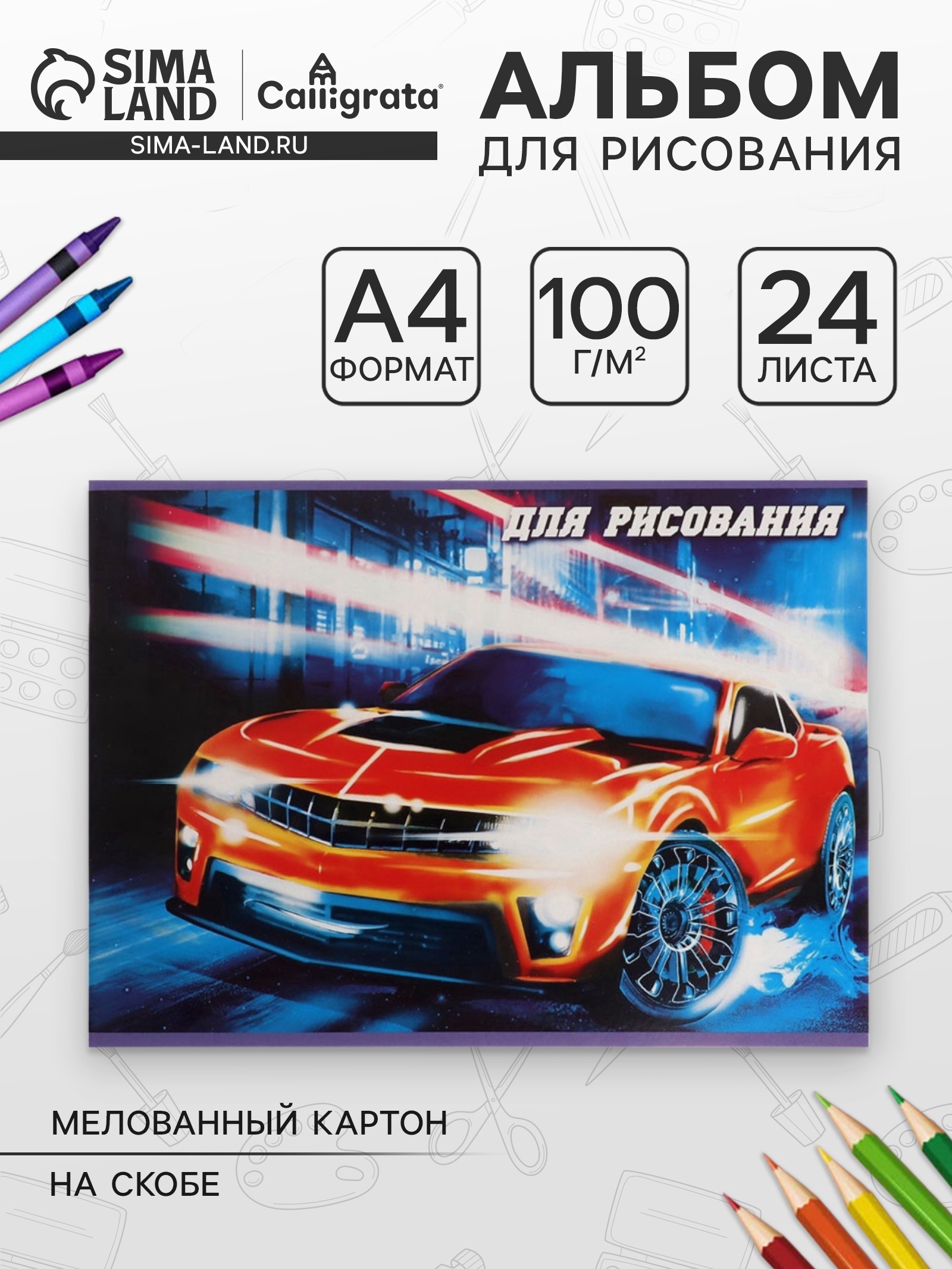 Альбом для рисования calligrata «тачки» а4, 24 листа на скрепке, обложка мелованный картон, внутренний блок офсет 100 г/м . Альбом для рисования А4 - это не просто тетрадь для творчества, но и целый мир, который Вы можете создавать своими руками. Этот альбом станет вашим верным спутником в мире искусства, а также поможет воплотить самые смелые идеи и фантазии. Альбом - это незаменимая канцелярия, которая подойдёт как школьникам, любящим рисовать в больших объёмах на уроках и дома, так и взрослым, которые бывают не прочь отвлечься от ежедневной рутины и окунуться в мир творчества. Блок 100 г/м2. Вид живописи:Для рисования|Набор:Нет|Цвет:Синий|Цвет:Разноцветный|Для кого:Для мальчика|Формат:А4|Линовка блока:Без линовки|Плотность, г/м :100|Тип скрепления:На скобе|Европодвес:Нет|Количество листов:24|Лицензия:Нет|Отделка:Без отделки|Материал обложки:Мелованный картон|Материал:Бумага|Белизна блока, %:95-100|Штрихкод на единице товара:Да|Температурное ограничение транспортировки:Нет|Вид обложки:Мягкая|Реестр Минпромторга:Нет|Твёрдая подложка:Нет|Страна:Россия  развернуть описание ▼