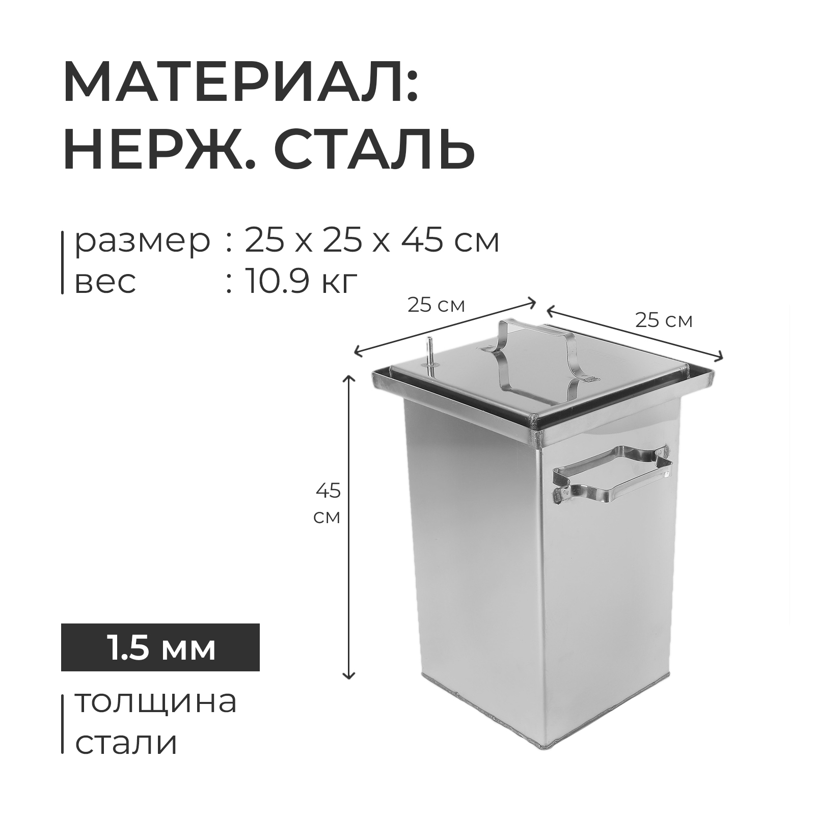 Коптильня 45x25x25 см, нержавеющая сталь 1.5 мм