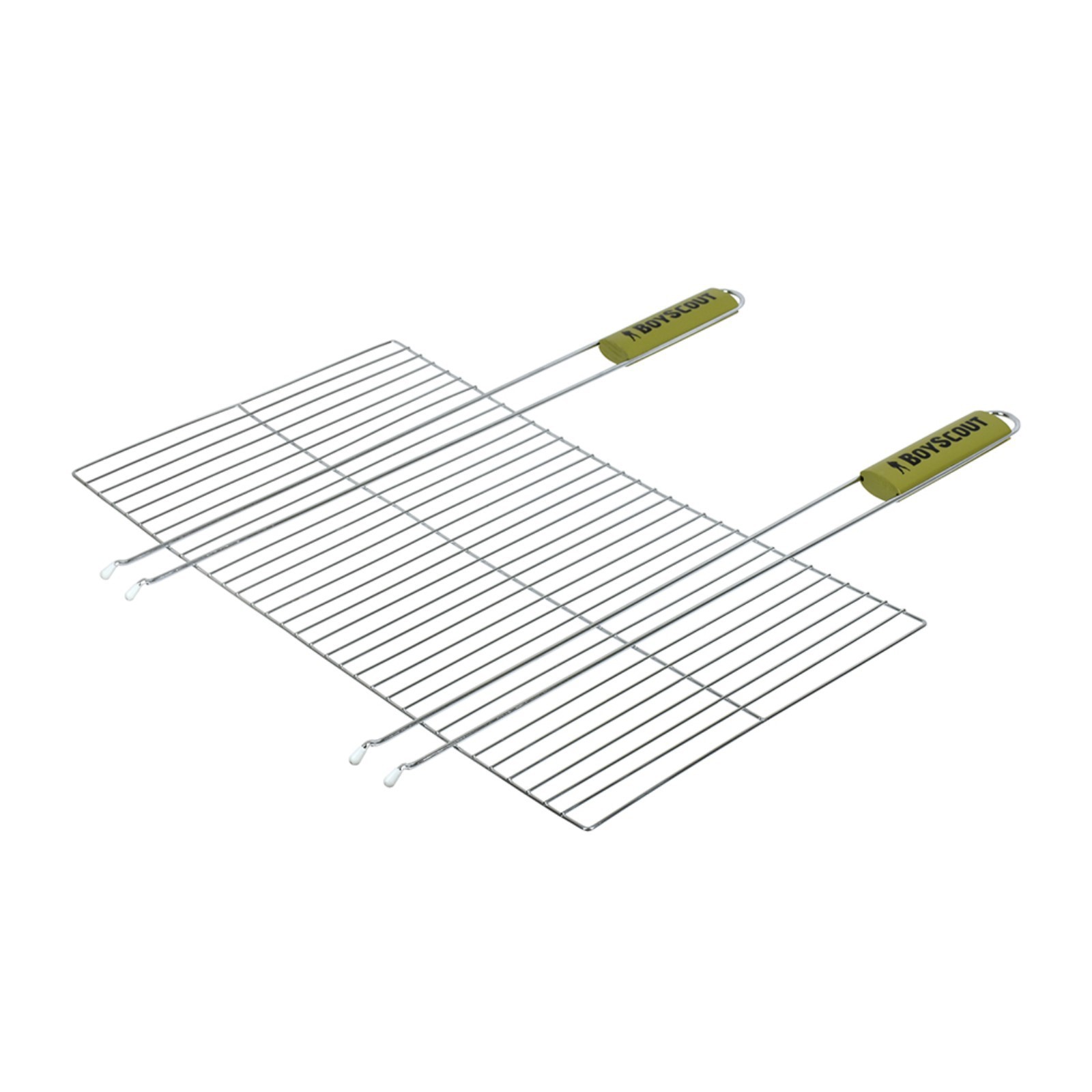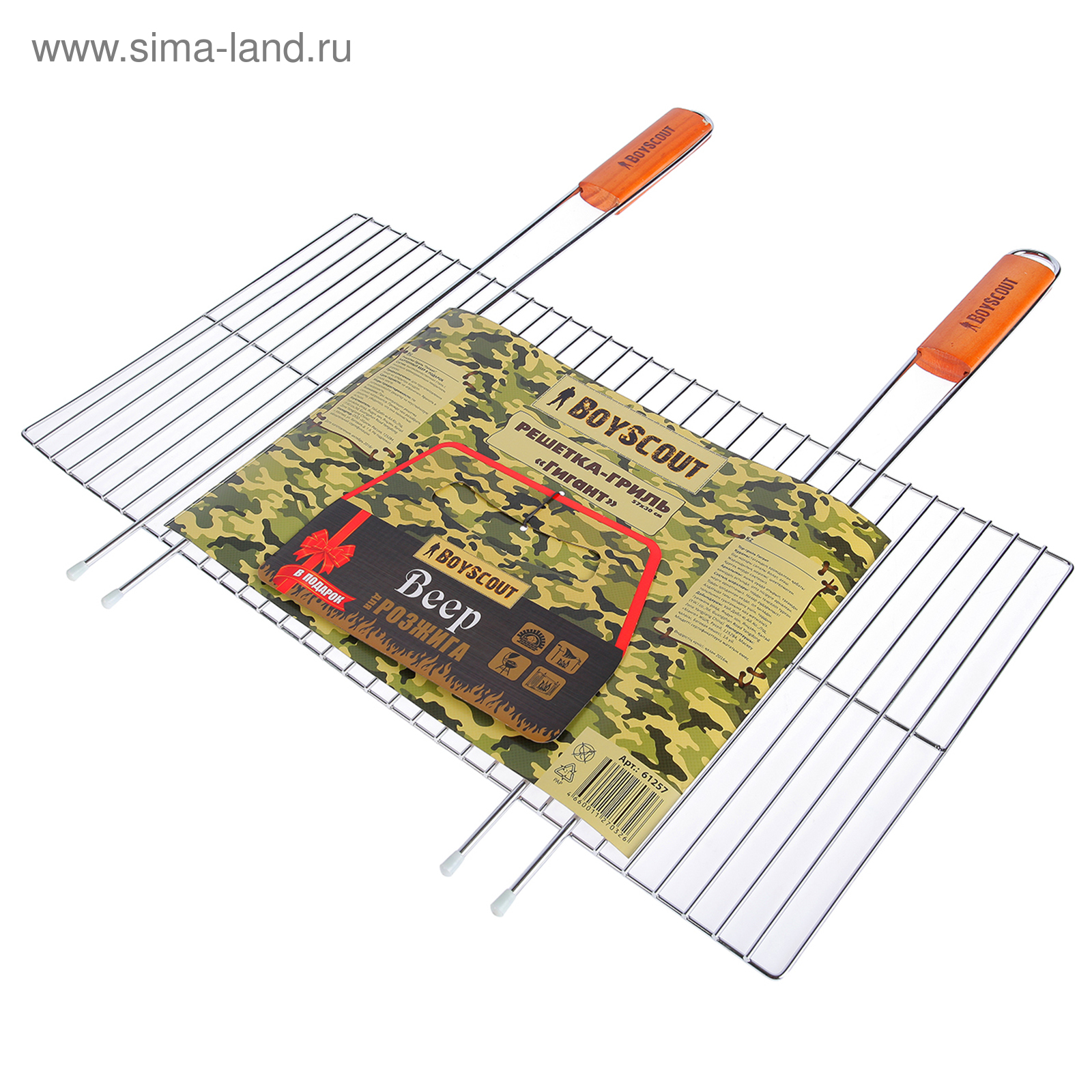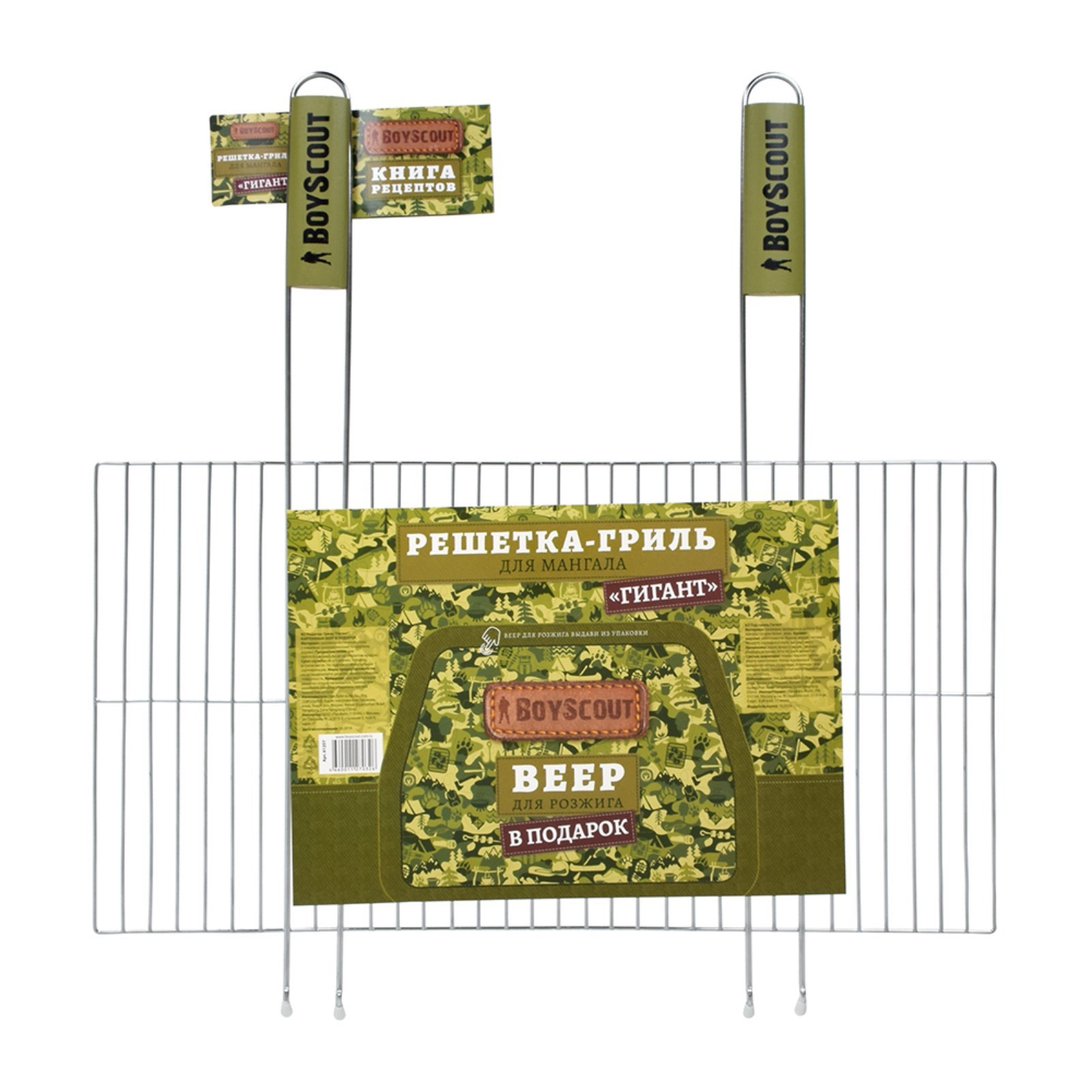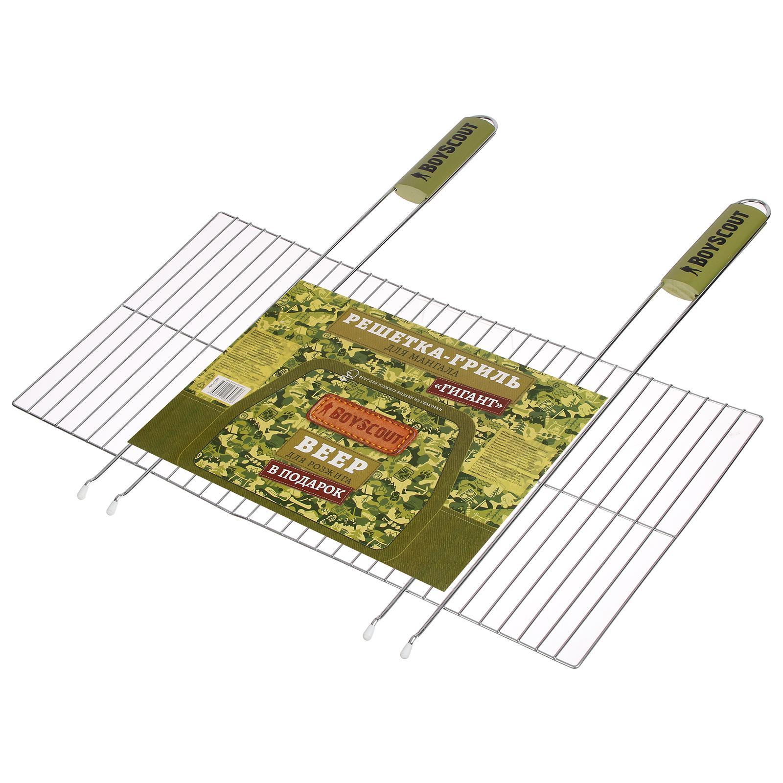 Решетка-гриль boyscout гигант, веер в подарок, 55 (+5) х 57 х 30 см. Предназначение: Для приготовления пищи на открытом воздухе. Материал: Высококачественная сталь с пищевым хромированным покрытием, деревянная ручка. Срок годности: Не ограничен. Условия хранения: Хранить в сухом месте. Температурный режим: Температурные ограничения отсутствуют. Размер, см: 55 х 57 Материал ручки: Дерево Материал рабочей части: Хромированная сталь Назначение: Универсальная Антипригарное покрытие: Нет  развернуть описание ▼