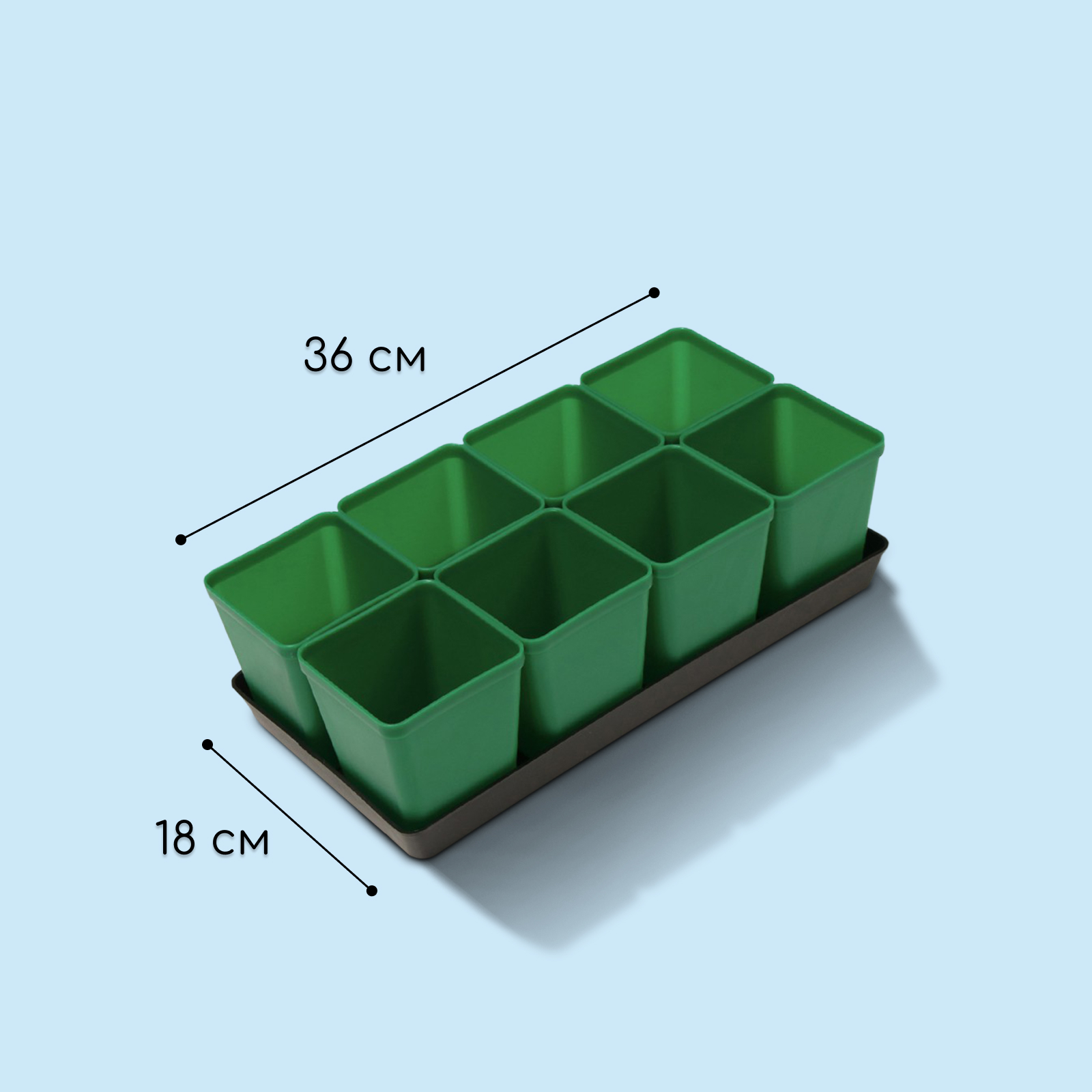 Набор для рассады: стаканы по 600 мл (8 шт.), поддон 36 18 см, цвет микс, greengo. Набор предназначен для выращивания рассады. Преимущества Поддон помещается на узкие балконные полки, подоконники.Непрозрачные стенки оберегают корни от ультрафиолета.Поддон помогает регулировать увлажнённость почвы.Отдельные стаканчики защищают ростки от распространения болезней.Аккуратный вид рассады.После использования сохраните изделие до следующего сезона. Цвет:МИКС|Форма:Квадратная|Объём горшка, л:0.6|Ширина дна горшка, см:7|Количество ячеек:8|Ширина верха горшка, см:9|Высота горшка, см:10.5|Материал:Пластик|Способ производства:Литьё|Дно:Съёмное|Дренажные отверстия:Да|Страна:Россия  развернуть описание ▼