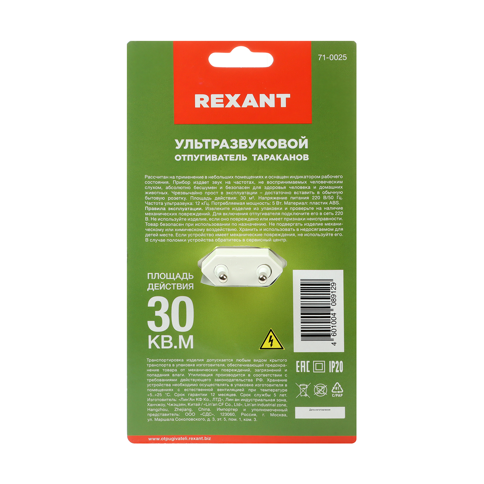 Отпугиватель тараканов Rexant 71-0025, ультразвуковой, 20 м2, 220 в