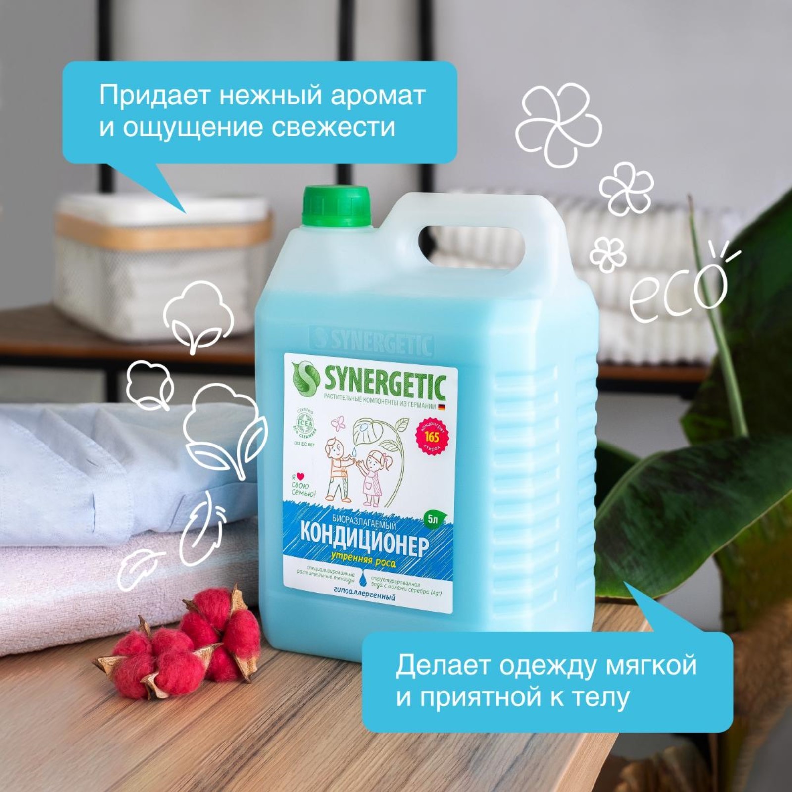 Кондиционер-ополаскиватель для белья Synergetic "утренняя роса", биоразлагаемый,гипоаллергенный 5 л