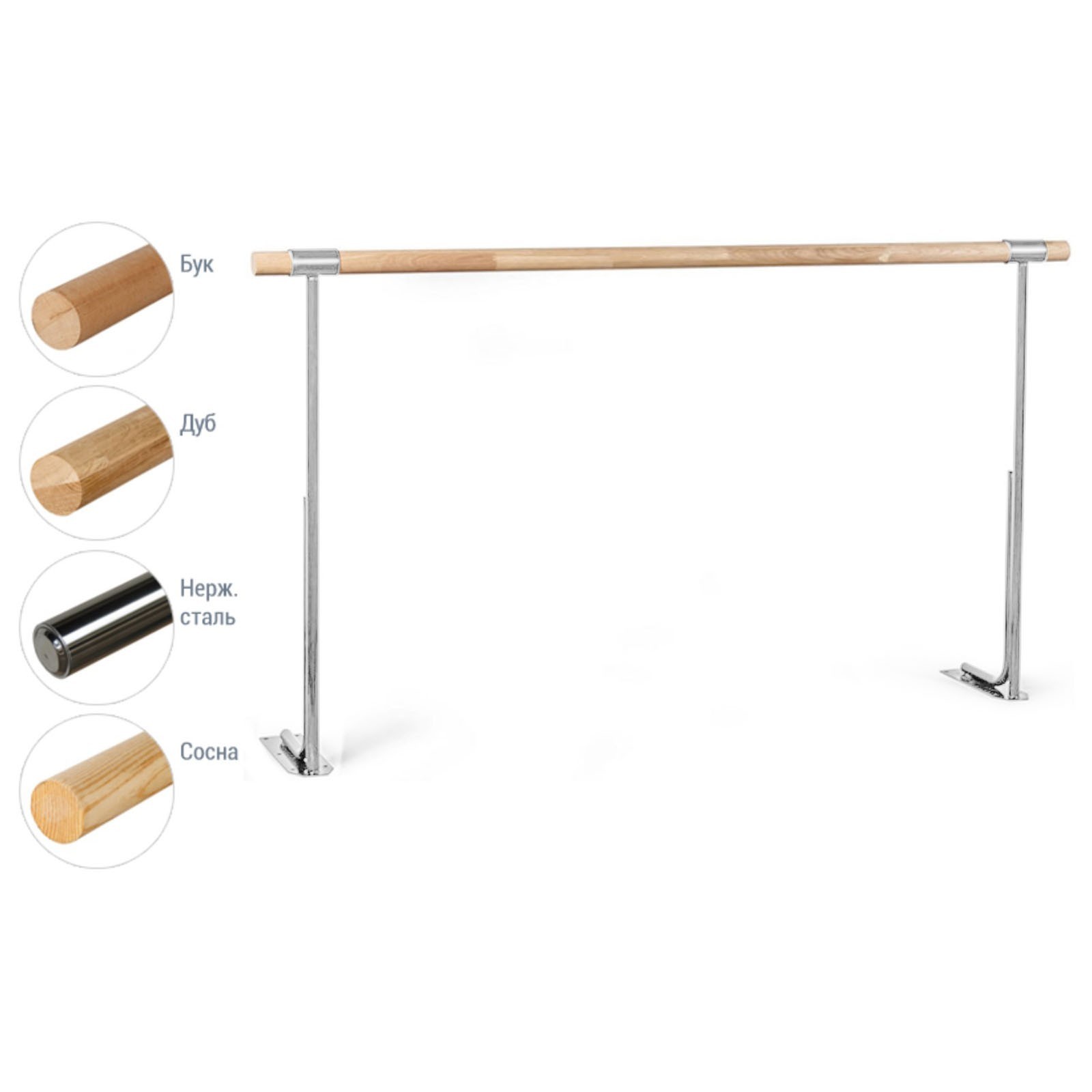 Хореографический станок однорядный напольный №2 бук, белый цвет ножек. Глубина: 33 смВысота хореографического станка: 110 смВысота от пола до центра оси поручня: 108 смКаждый поручень крепится к опорам при помощи двух саморезовДлина поручня (ширина станка): 200 см. Диаметр поручней: 50 ммЦельносварная конструкция опорОпоры выполнены из толстостенных труб:Основная труба диаметром 33 мм и толщиной 2, 8 ммВспомогательная труба - 27 мм толщиной 2, 8 ммТорцы труб оснащены пластиковыми заглушкамиТип крепления - наполный (крепеж в комплекте)Тип покраски опор: полимерная порошковаяПоручни изготовлены из клееной древесины мебельного качества. Габариты Длина, см 112Ширина, см 33Высота, см 11Вес 8. 5 Материал поручня (жерди): Бук  развернуть описание ▼
