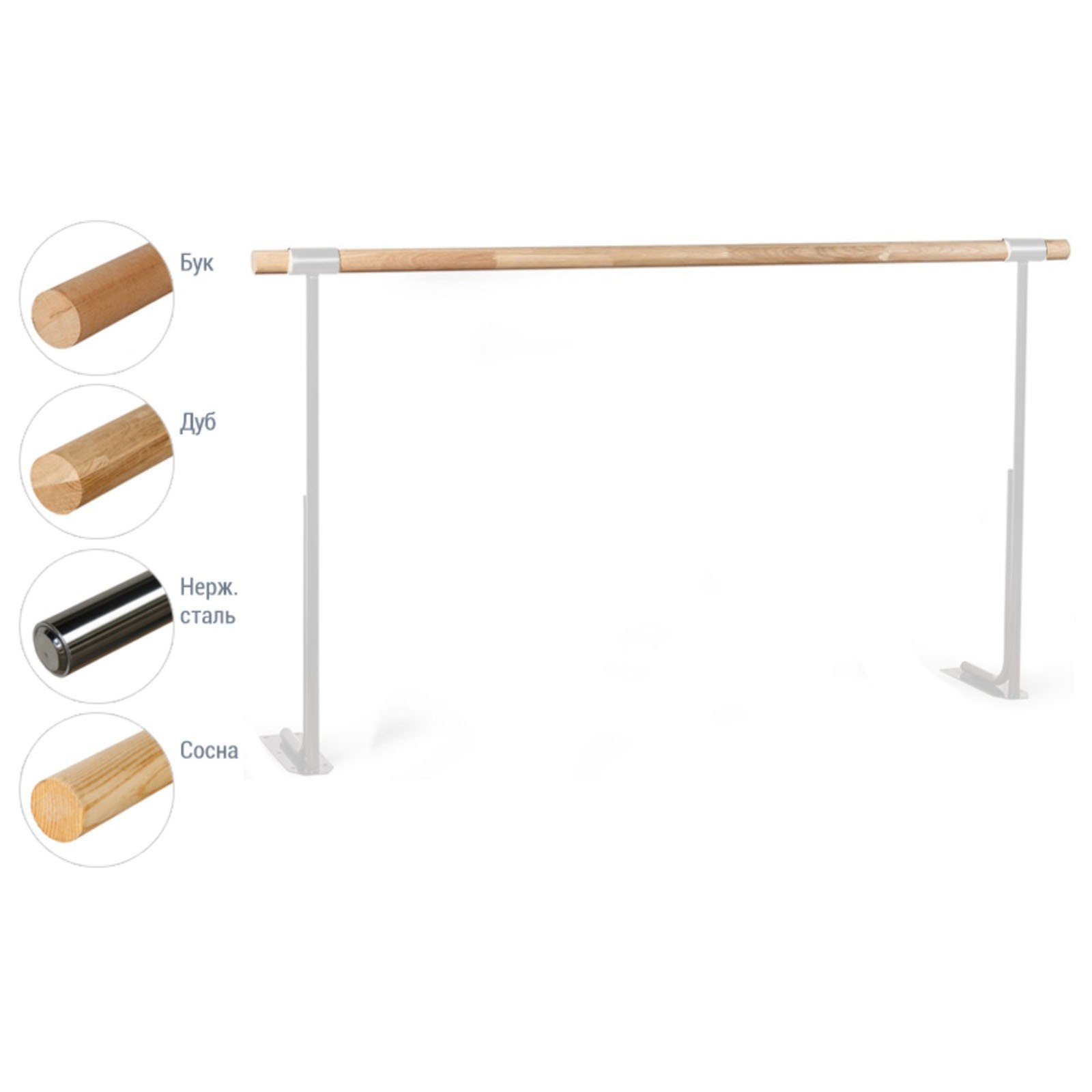 Хореографический станок однорядный напольный №2 дуб, белый цвет ножек. Глубина: 33 смВысота хореографического станка: 110 смВысота от пола до центра оси поручня: 108 смКаждый поручень крепится к опорам при помощи двух саморезовДлина поручня (ширина станка): 200 см. Диаметр поручней: 50 ммЦельносварная конструкция опорОпоры выполнены из толстостенных труб:Основная труба диаметром 33 мм и толщиной 2, 8 ммВспомогательная труба - 27 мм толщиной 2, 8 ммТорцы труб оснащены пластиковыми заглушкамиТип крепления - наполный (крепеж в комплекте)Тип покраски опор: полимерная порошковаяПоручни изготовлены из клееной древесины мебельного качества. Габариты Длина, см 112Ширина, см 33Высота, см 11Вес 8. 5 Материал поручня (жерди): Дуб  развернуть описание ▼