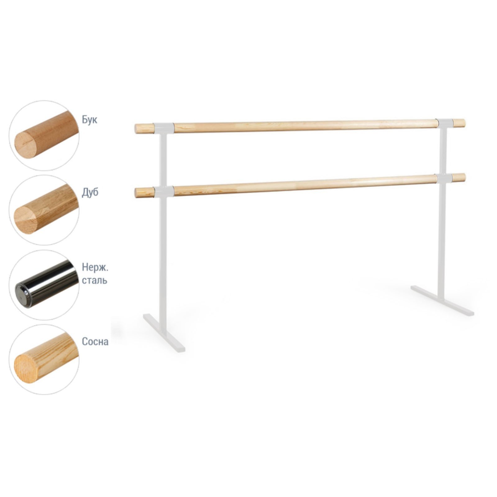 Переносной хореографический станок двухрядный №7 сосна, белый цвет ножек. Тип -переноснойВысота от пола до центра оси нижнего поручня: 73 смВысота от пола до центра оси верхнего поручня: 108 смКаждый поручень крепится к опорам при помощи двух саморезов с каждой стороныДлина поручня (ширина станка): 200 см. Диаметр поручней: 50 ммЦельносварная конструкция опорТип покраски металлических поверхностей: порошковая (цвет - по согласованию с заказчиком)Высота хореографического станка: 110 смШирина опор по полу - 60 смВес конструкции - 11 кгОпоры изготовлены из конструкционной сталиТорцы опор оснащены широкими пластиковыми заглушками для защиты пола от царапин Материал поручня (жерди): Сосна  развернуть описание ▼