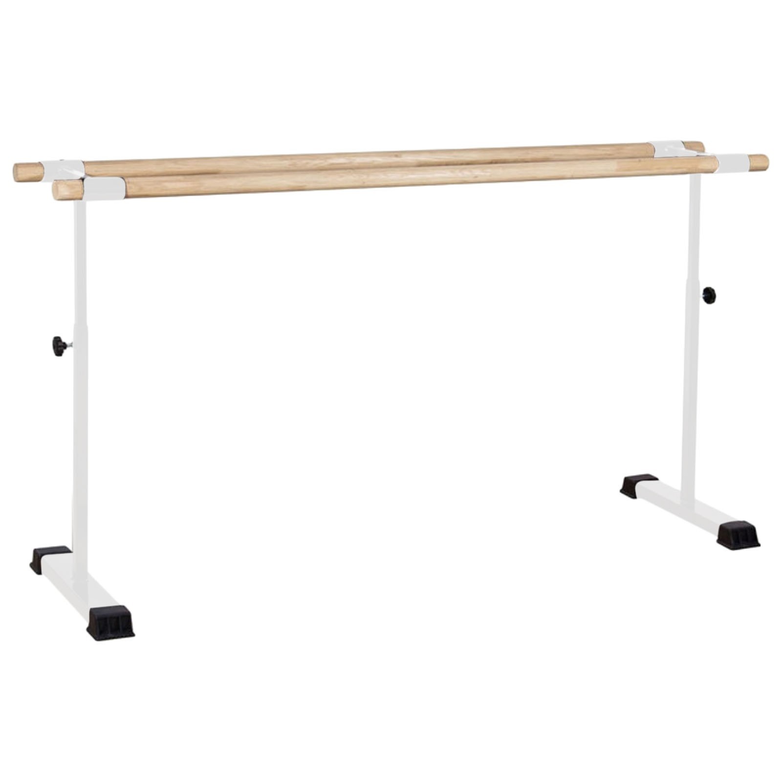 Переносной хореографический станок регулируемый №10 бук, белый цвет ножек. Регулируемый по высоте танцевальный станок с двумя поручнями, расположенными в одной горизонтальной плоскости (расстояние между центрами жердей - 30 см)На концах опор мобильного балетного станка установлены травмобезопасные заглушки. Они же защищают пол от царапин. Напольная часть опор изготовлена из усиленного стального профиля, что делает станок более устойчивым по сравнению с легкими моделями (общий вес - 14 кг)Высота станка от пола регулируется в диапазоне 75-110 смКаждый поручень крепится к опорам при помощи двух саморезов с каждой стороныДлина поручня (ширина станка): 200 см. Диаметр поручней: 50 ммРазборная конструкция опорТип -переноснойТип покраски металлических поверхностей: порошковая Материал поручня (жерди): Бук  развернуть описание ▼
