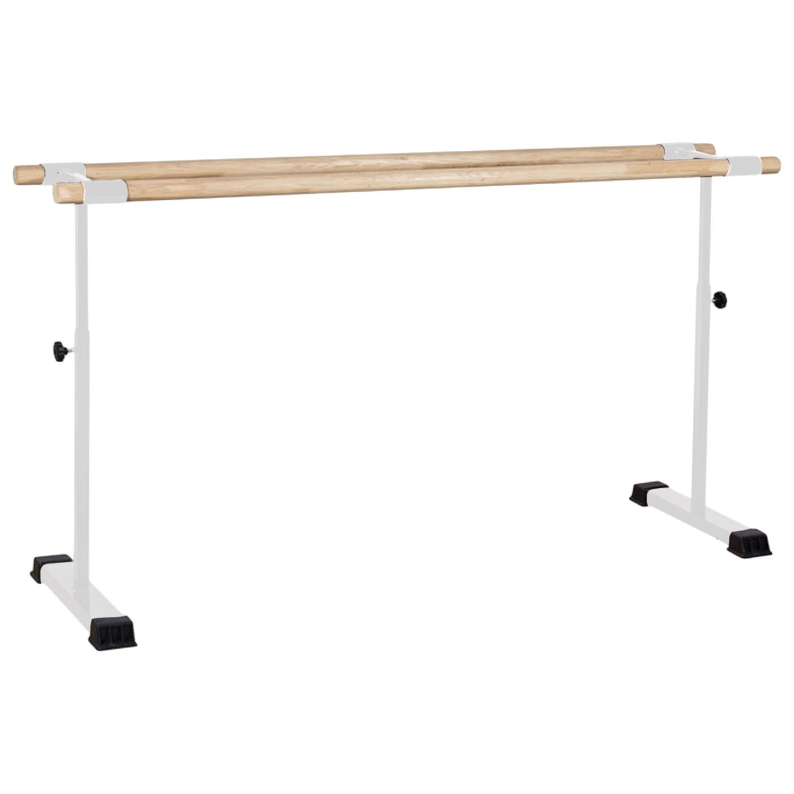 Переносной хореографический станок регулируемый №10 дуб, белый цвет ножек. Регулируемый по высоте танцевальный станок с двумя поручнями, расположенными в одной горизонтальной плоскости (расстояние между центрами жердей - 30 см)На концах опор мобильного балетного станка установлены травмобезопасные заглушки. Они же защищают пол от царапин. Напольная часть опор изготовлена из усиленного стального профиля, что делает станок более устойчивым по сравнению с легкими моделями (общий вес - 14 кг)Высота станка от пола регулируется в диапазоне 75-110 смКаждый поручень крепится к опорам при помощи двух саморезов с каждой стороныДлина поручня (ширина станка): 200 см. Диаметр поручней: 50 ммРазборная конструкция опорТип -переноснойТип покраски металлических поверхностей: порошковая Материал поручня (жерди): Дуб  развернуть описание ▼