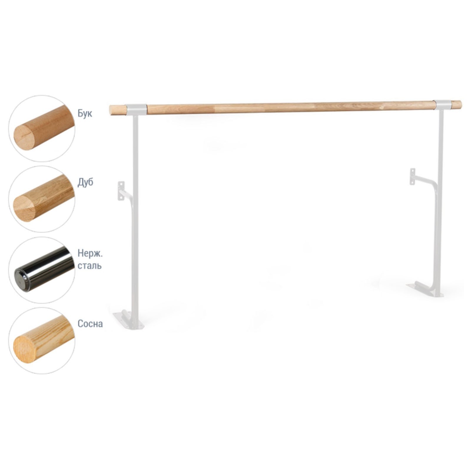 Хореографический станок однорядный стена-пол №15 бук, белый цвет ножек. Высота станка - 110 см Комплектация: 1 поручень длиной 2 метра диаметром 50 ммсборочный и установочный крепежБалетный станок крепится к полу и к стене анкерными болтами (крепеж - в комплекте): 6 болтов к полу и 2 болта - к стене на каждой опореОсновная труба опор - диаметром 33 мм и толщиной 2, 8 ммВспомогательная труба - 27х2, 8 мм. Поверхность окрашена полимерным порошковым покрытием в камере полимеризации Материал поручня (жерди): Бук  развернуть описание ▼