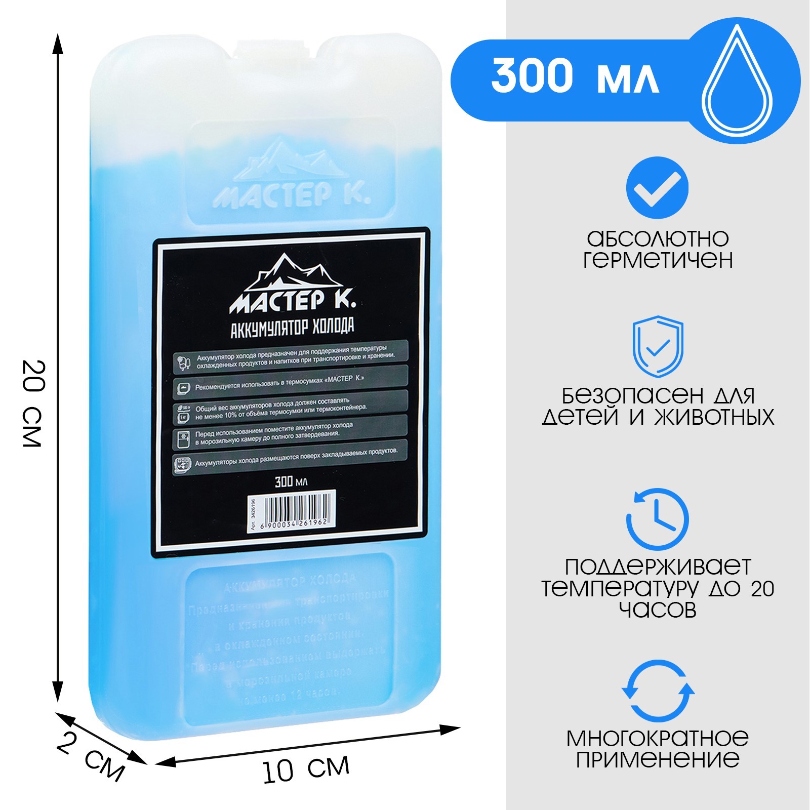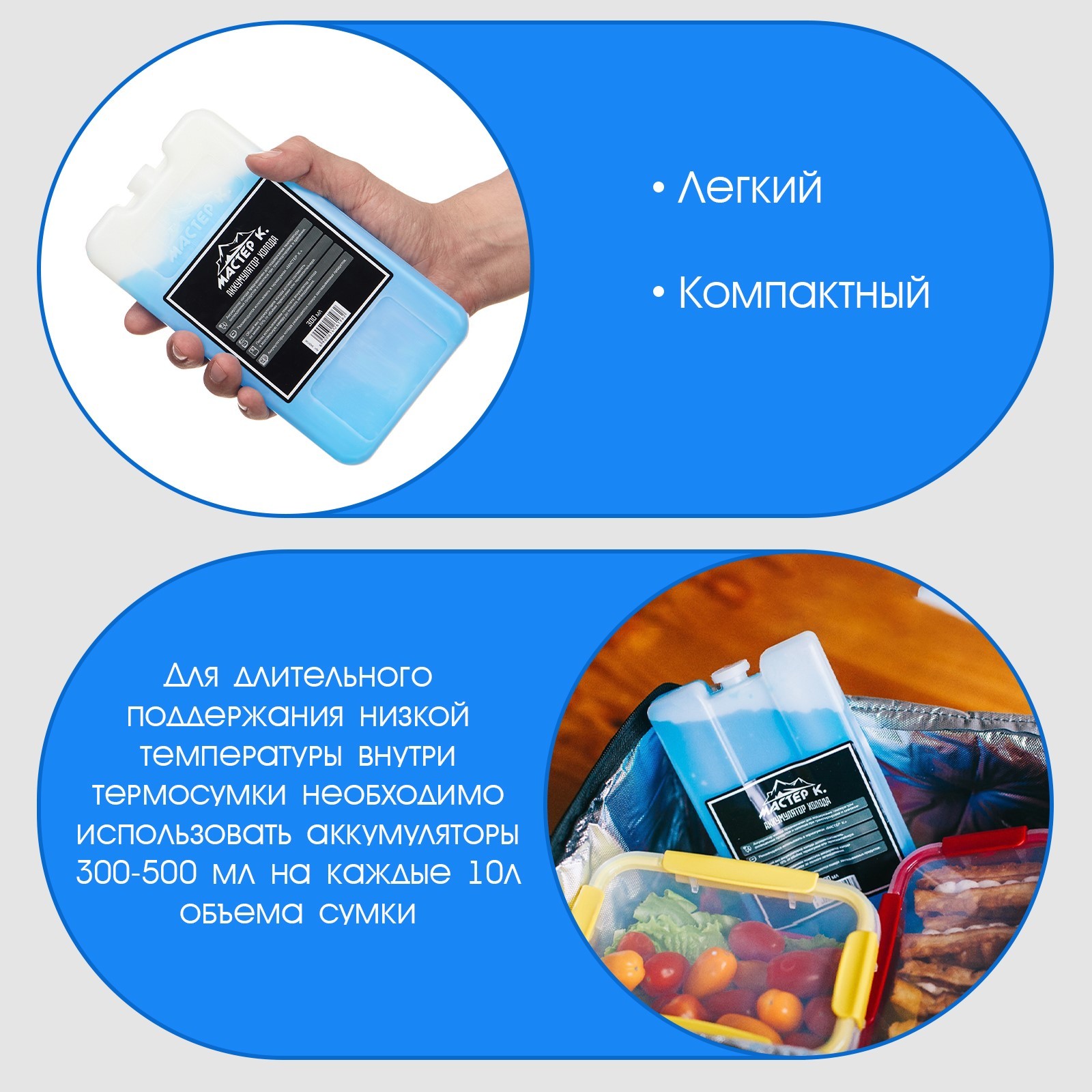 Аккумулятор холода - гелевый хладоэлемент для термосумки "мастер к.", до 20 ч, 300 мл. Путешествие, поход, туристическое приключение станут проще, если в дорогу взять портативный аккумулятор холода. Аккумулятор тепла/холода, он же хладоэлемент и холодоаккумулятор, предназначен для поддержания высокой или низкой температуры в контейнерах из вспененных материалов, сумках-холодильниках и термопакетах. Он равномерно распределяет холод или тепло внутри термосумки, не протекает, обеспечивает долговременное охлаждение продуктов. Термоаккумулятор также используется медицинскими работниками и спортсменами для охлаждения или прогревания отдельных участков тела при ушибах и гематомах, или для восстановления мышц после интенсивных тренировок. Этот компактный резервуар со специальным гелевым растровом (хладагентом) обладает высокой теплоемкостью. Криопакет актуален для хранения продуктов питания и напитков, когда предстоят продолжительные поездки или же отправка на пикник. А также, хранения лекарств, которые требуют пребывания в прохладной среде. Маленький охладитель прост в использовании: достаточно поместить его в холодильник или морозилку на 8-12 часов. После этого терморегулятор можно разместить в термосумке, контейнере, сумке-холодильнике, термопакете или аптечке. Количество элементов, необходимых для охлаждения, зависит от объемов аксессуара. На каждые 10 литров необходимо использовать 300-500 мл охладителя. Располагать рекомендуем на разных сторонах сумки, а для более эффективного охлаждения, аккумуляторы следует размещать между продуктами. Для отдыха на природе, путешествий на автомобиле, рыбалки, охоты, рюкзака – аккумулятор холода способен пригодиться в самых разных ситуациях. Для дачи, садового домика, где нет полноценного холодильника, он станет незаменимым решением. В таких условиях его можно использовать как автомобильный холодильник. Длина, см: 20 Ширина, см: 10 Объём, л: 0.3 Время сохранения тепла/холода, ч: 20 Объём, мл: 300 Вид: Аккумулятор температуры Вид: Твёрдый  развернуть описание ▼