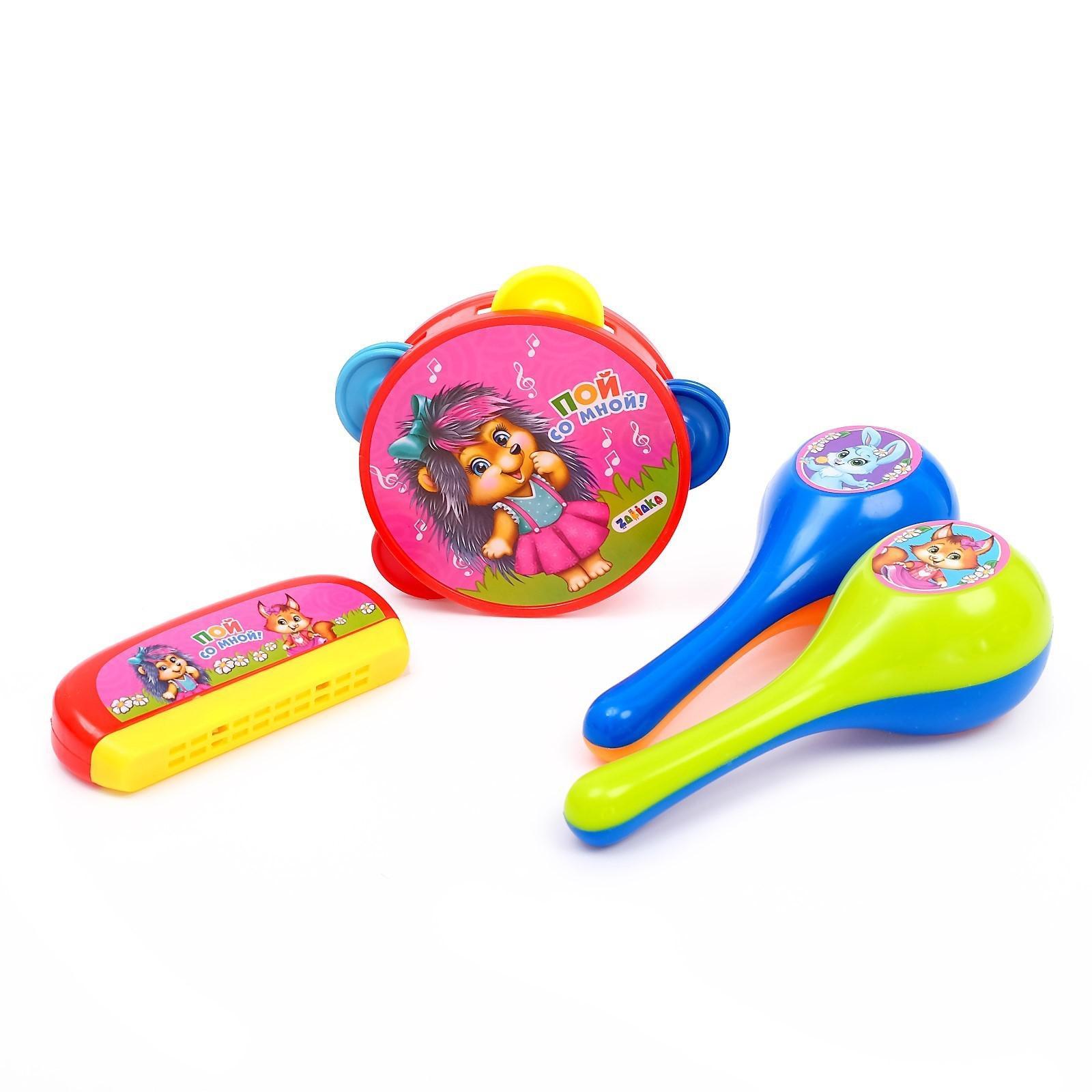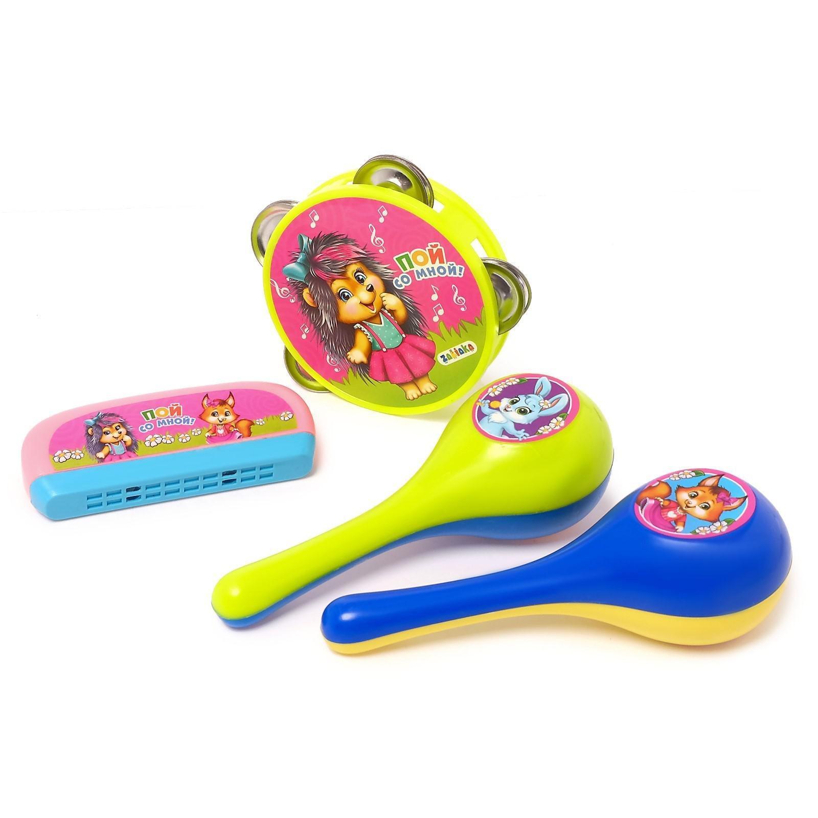 Набор музыкальных инструментов «пой со мной»: бубен, 2 маракаса, губная гармошка, микс