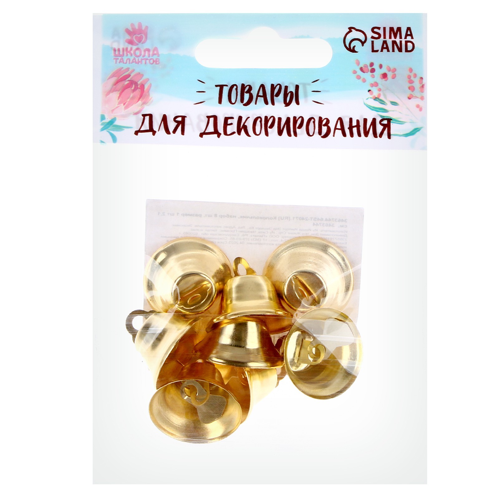 Колокольчик для рукоделия, набор 8 шт., размер 1 шт. — 2.1 см, золотой. Яркие звенящие колокольчики идеально подойдут в качестве самостоятельного украшения и для декорирования поделок. Например, ими можно украсить элементы кукольной или карнавальной одежды, а также детские музыкальные инструменты. Набор:Да|Цвет:Золотистый|В упаковке, шт.:8|Символ года:Нет|Тематика праздника:Новый год|Материал:Металл|Страна:Китай  развернуть описание ▼